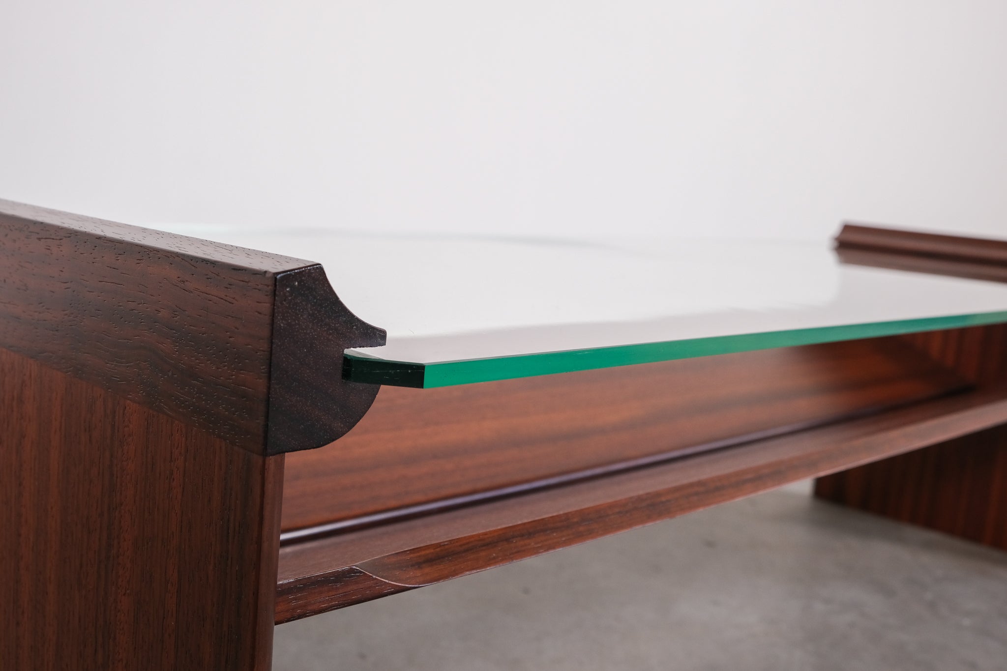 Elegant coffee table designed by Kazuhide Takahama for Gavina in the 1960s. The table features a refined wooden frame supporting a clear glass top that rests in two slots. Clean, light, and without any visible fittings.
