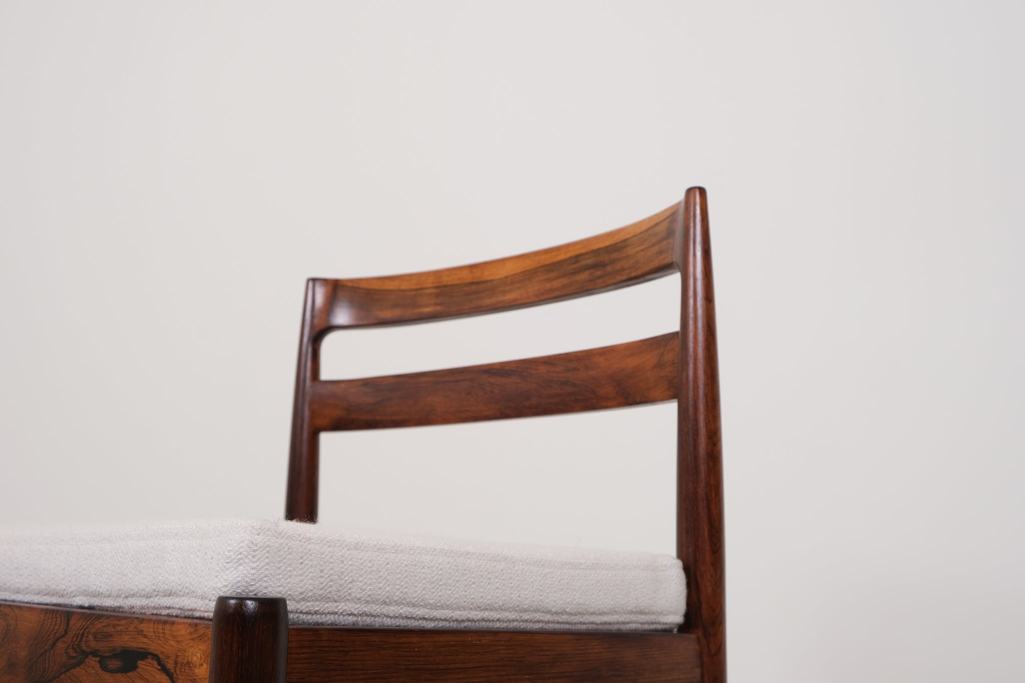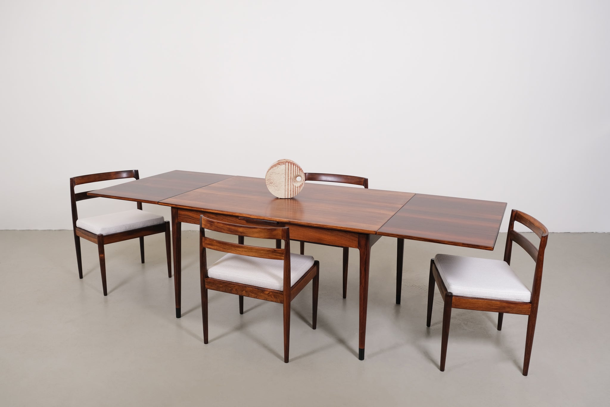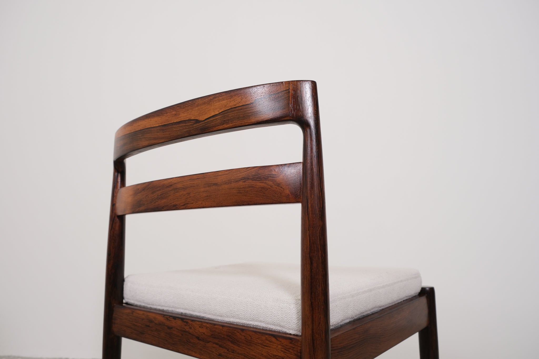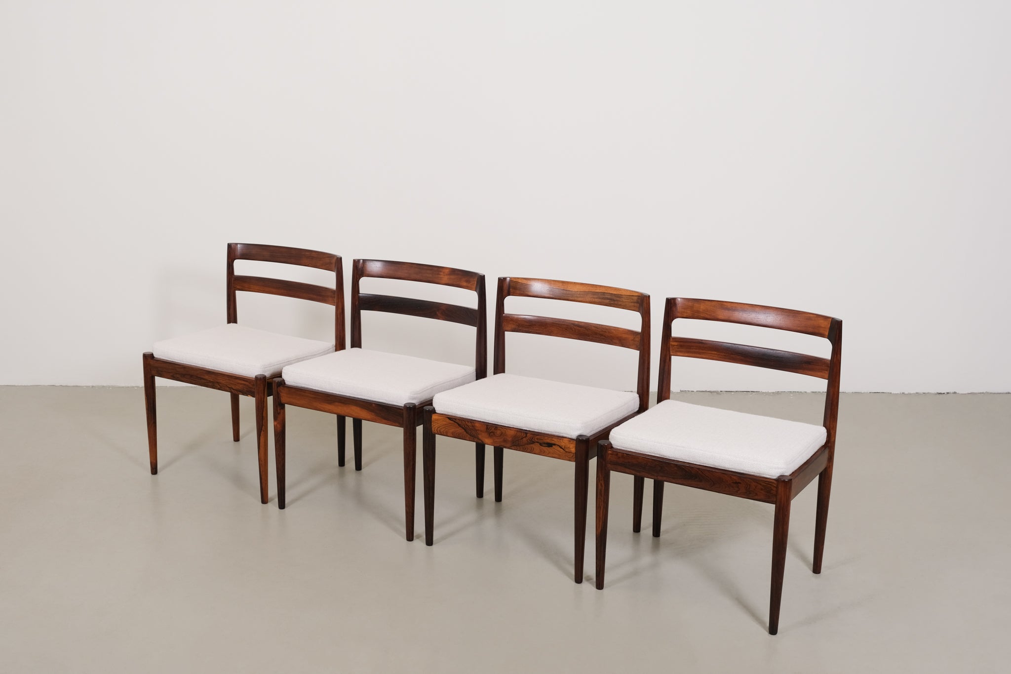 This set of four dining chairs, designed by Kai Kristiansen, is part of the Universe series (1960-1965). Model 301 features an elegant, organic shape and is crafted from high-quality rosewood, known for its warm brown tone and beautiful dark grain patterns.