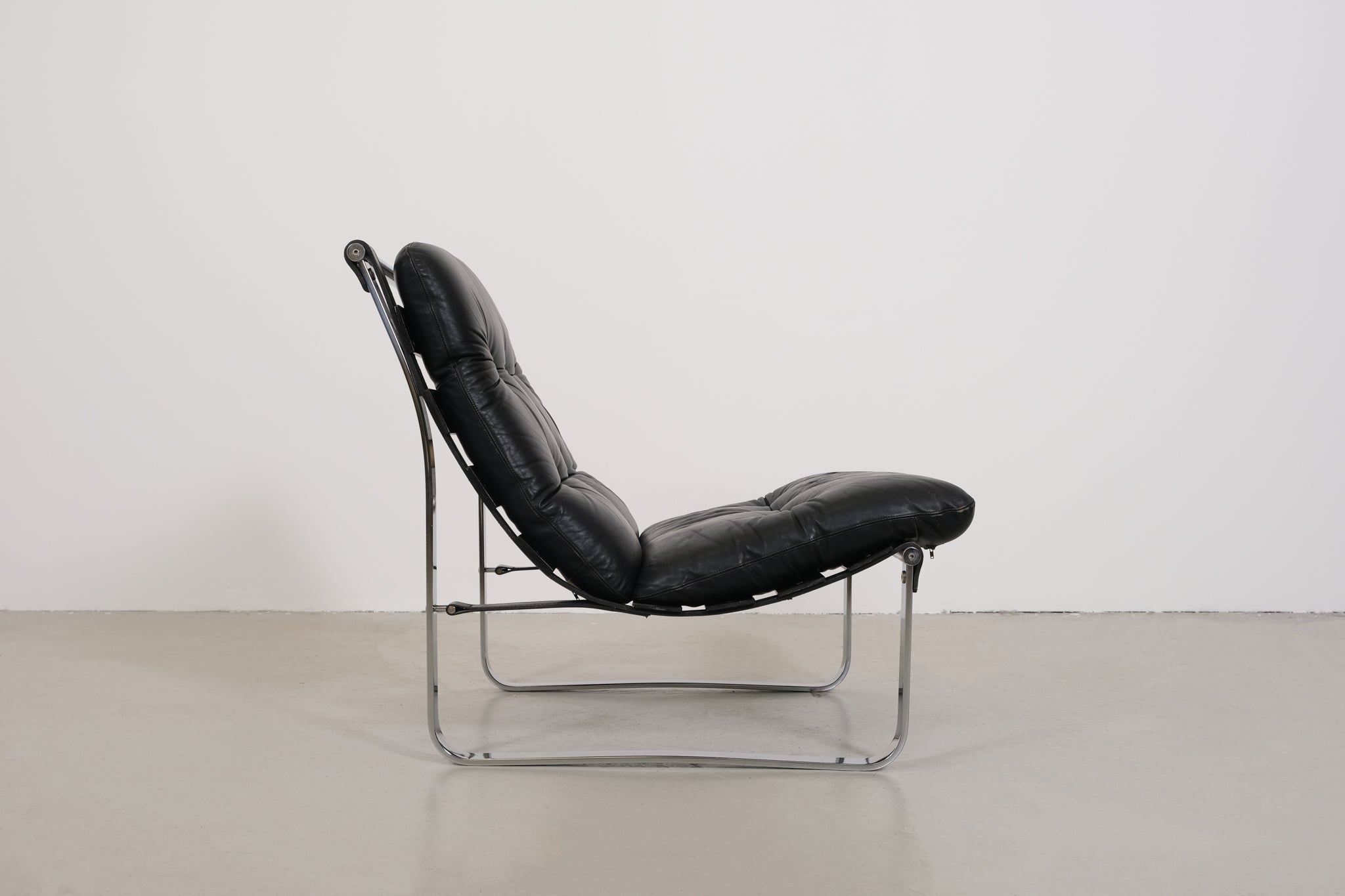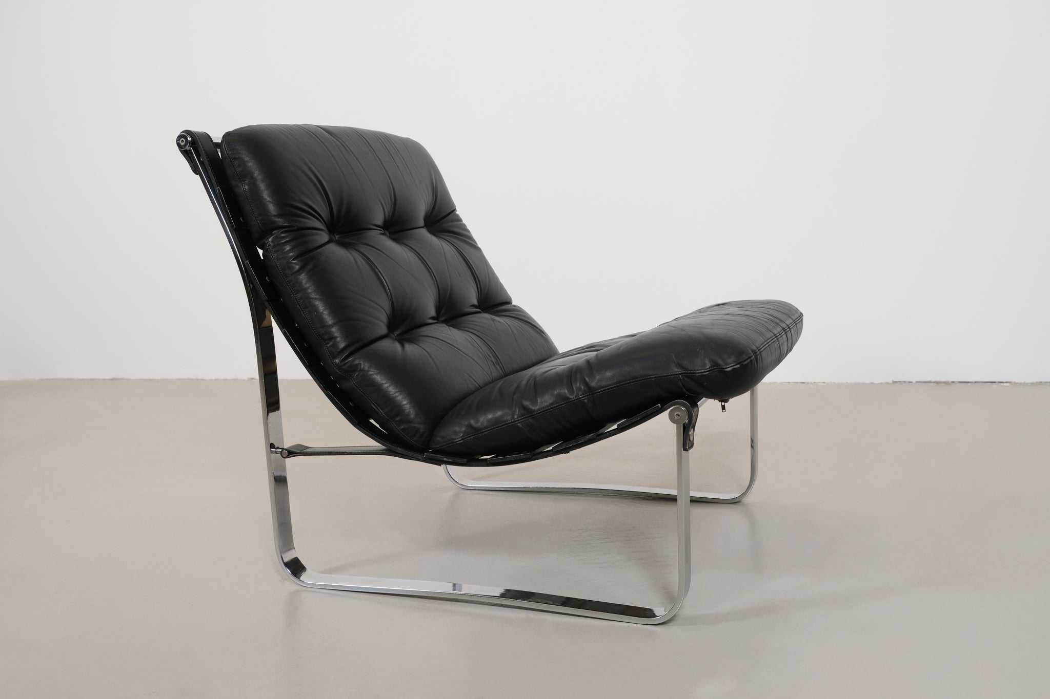 This rare Sling Chair, designed by Ingmar Relling for Westnofa, is a unique piece within his body of work. Unlike his more well-known designs featuring bentwood, this chair boasts a sleek, chrome-plated steel frame. The combination of leather and wooden straps supporting the luxurious leather cushion creates not only a striking visual contrast but also exceptional seating comfort. An iconic statement piece that seamlessly blends functionality and design. The product shows signs of wear consistent with its age.