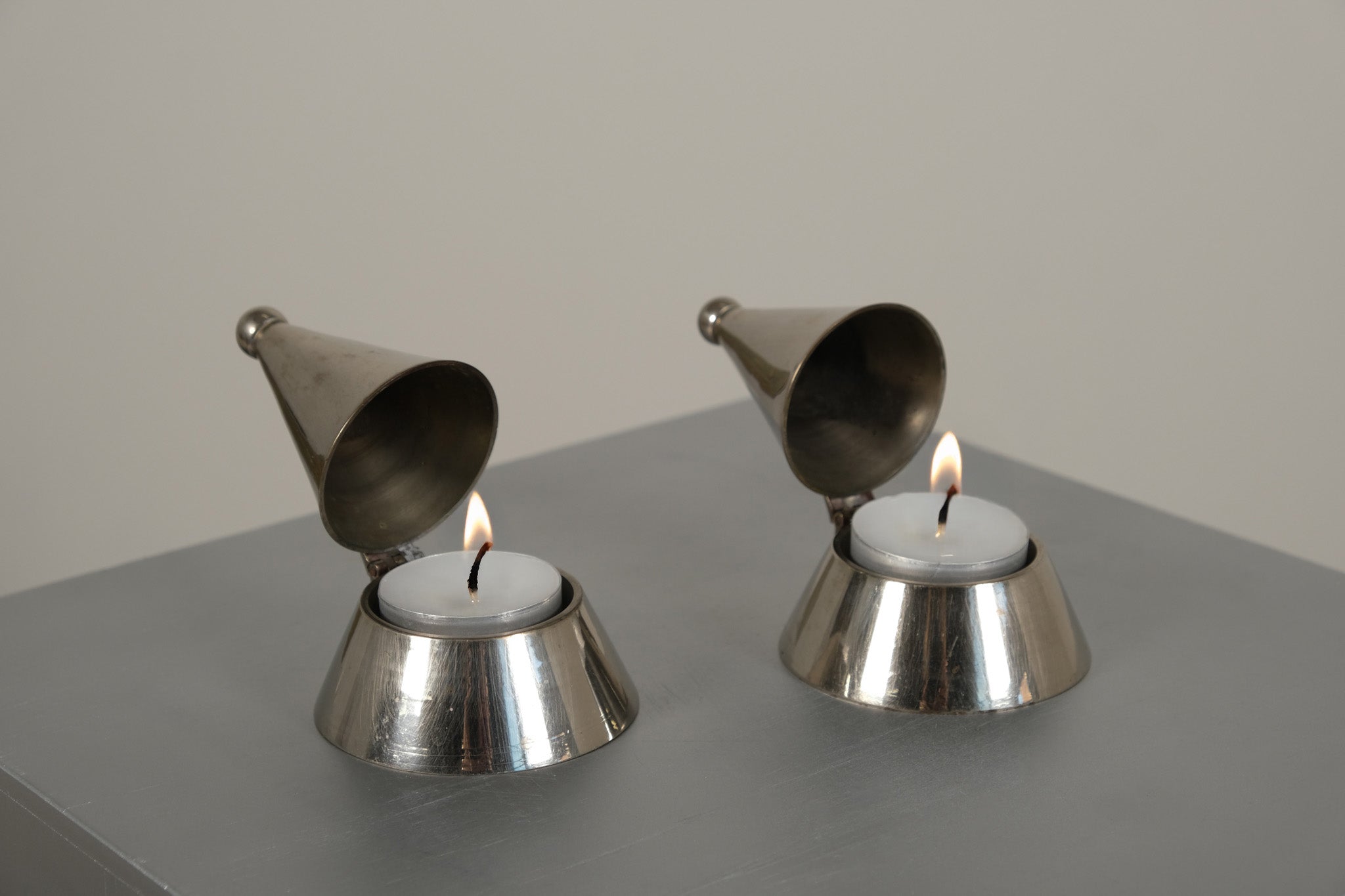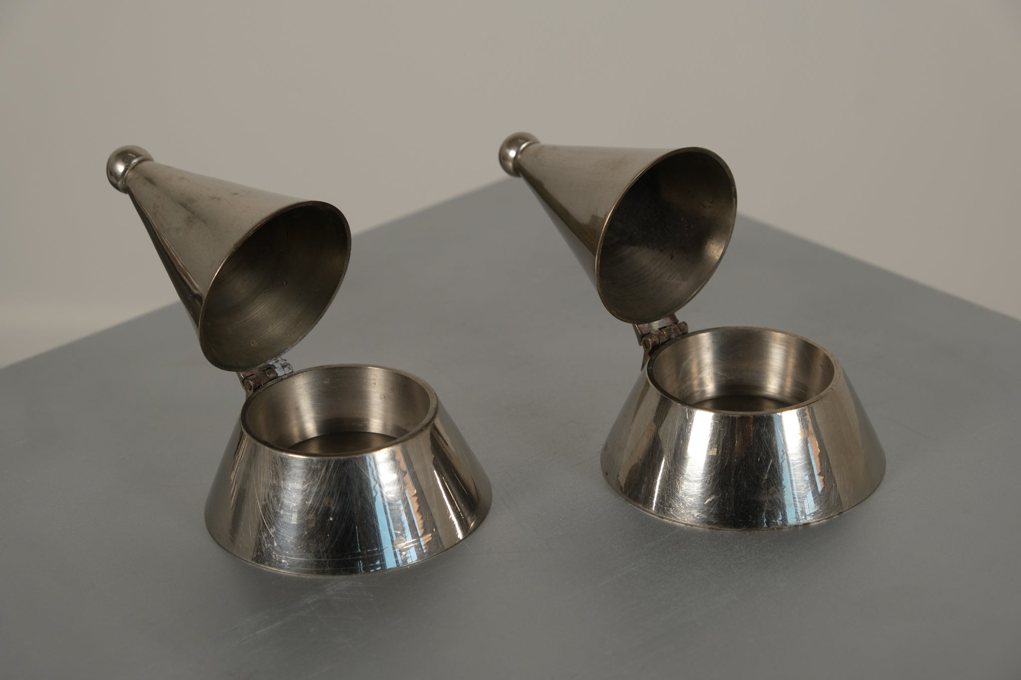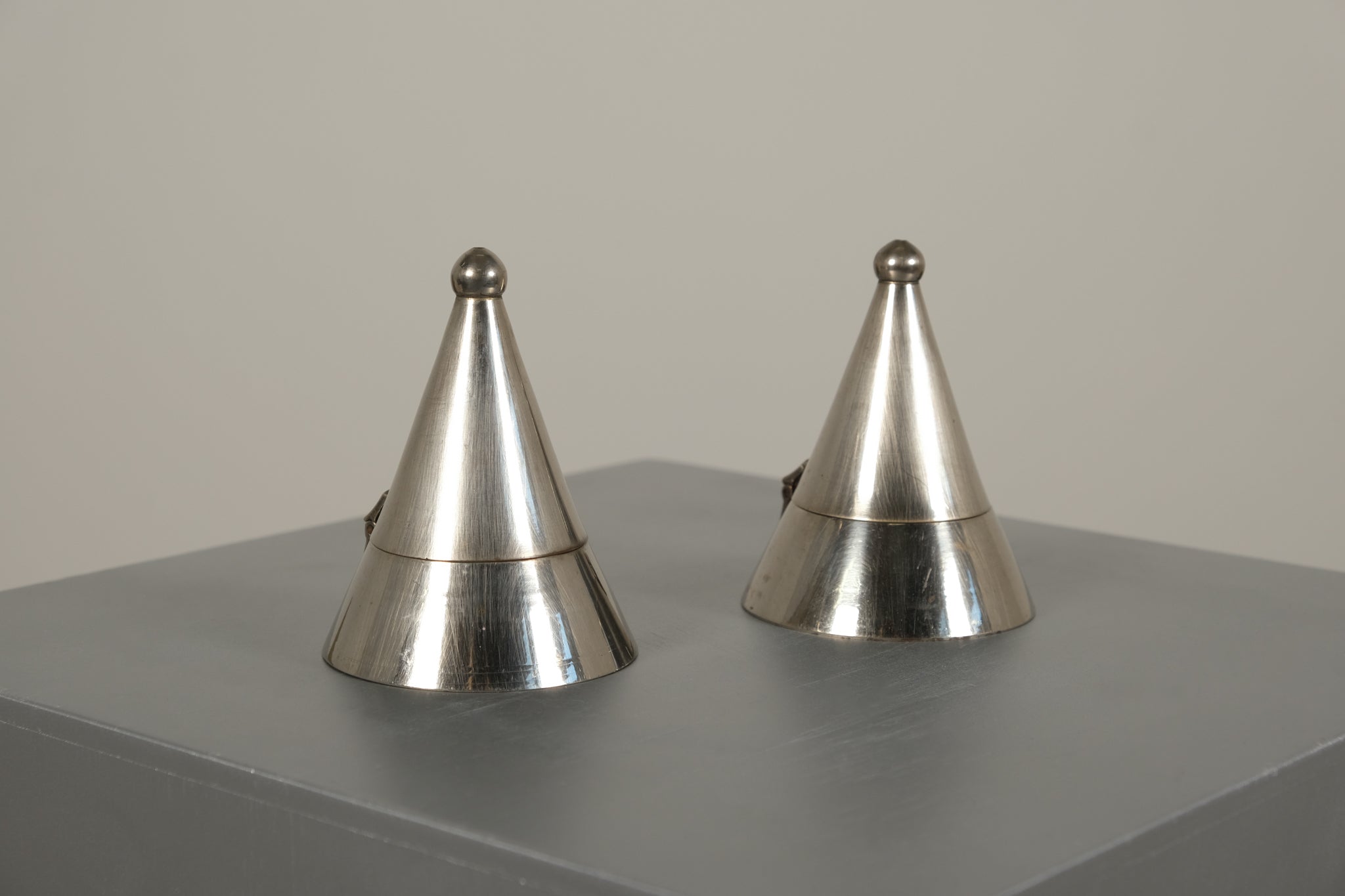 A pair of vintage 1980s candleholders in the Memphis/Postmodern style. Made from silver-colored metal in a sleek cone shape, they are designed for tealights.