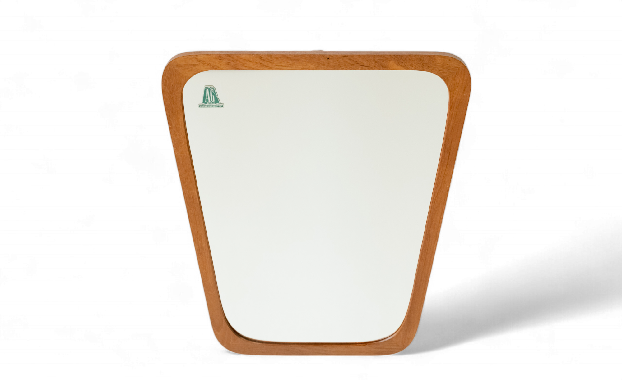 Beautiful mirror with a teak wood frame from Aarhus, Denmark. It tapers nicely with rounded corners. The mirror retains its original sticker and dates back to the 1960s. It is in good vintage condition.