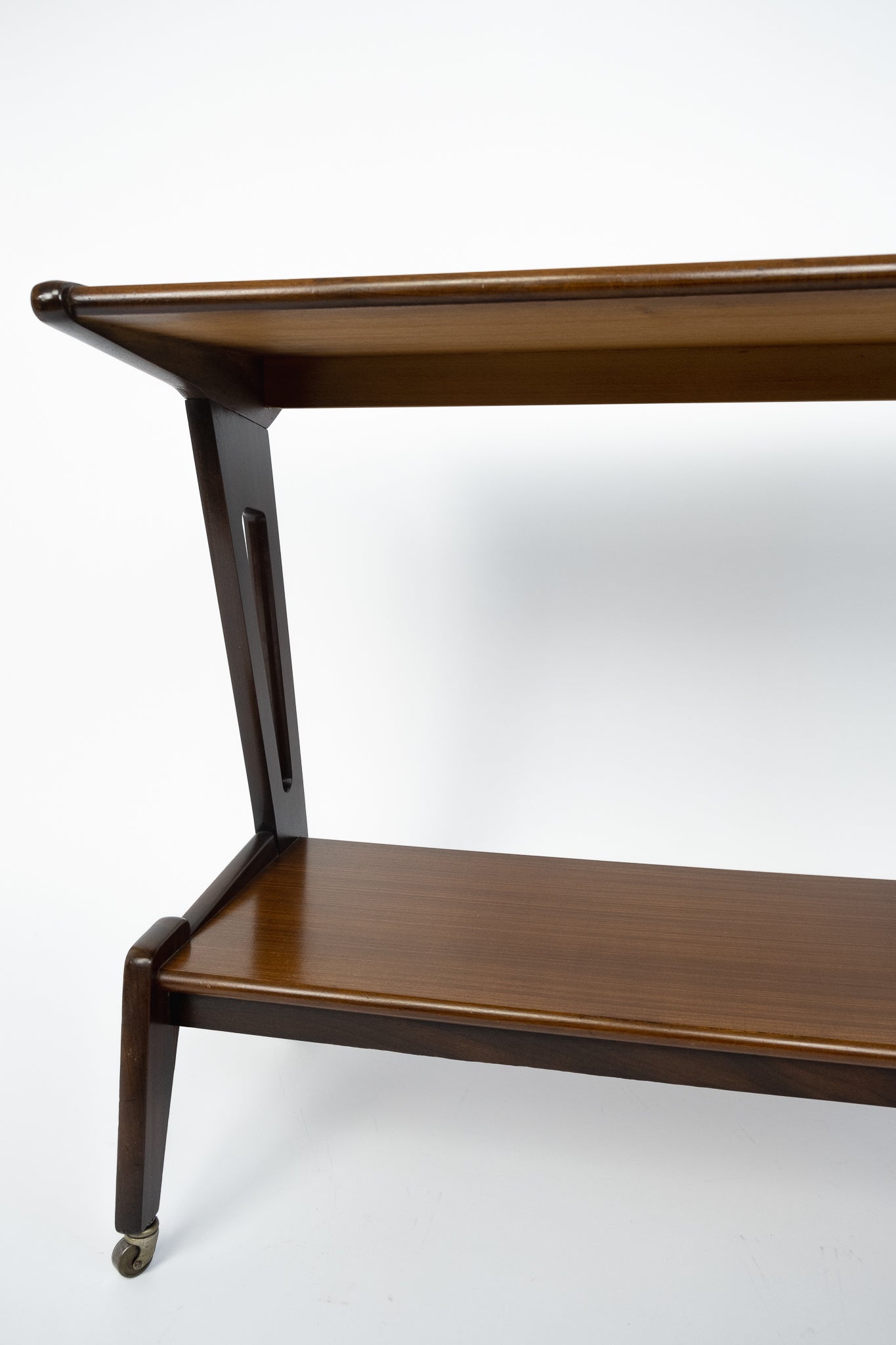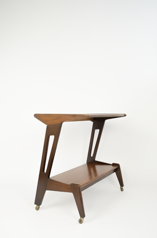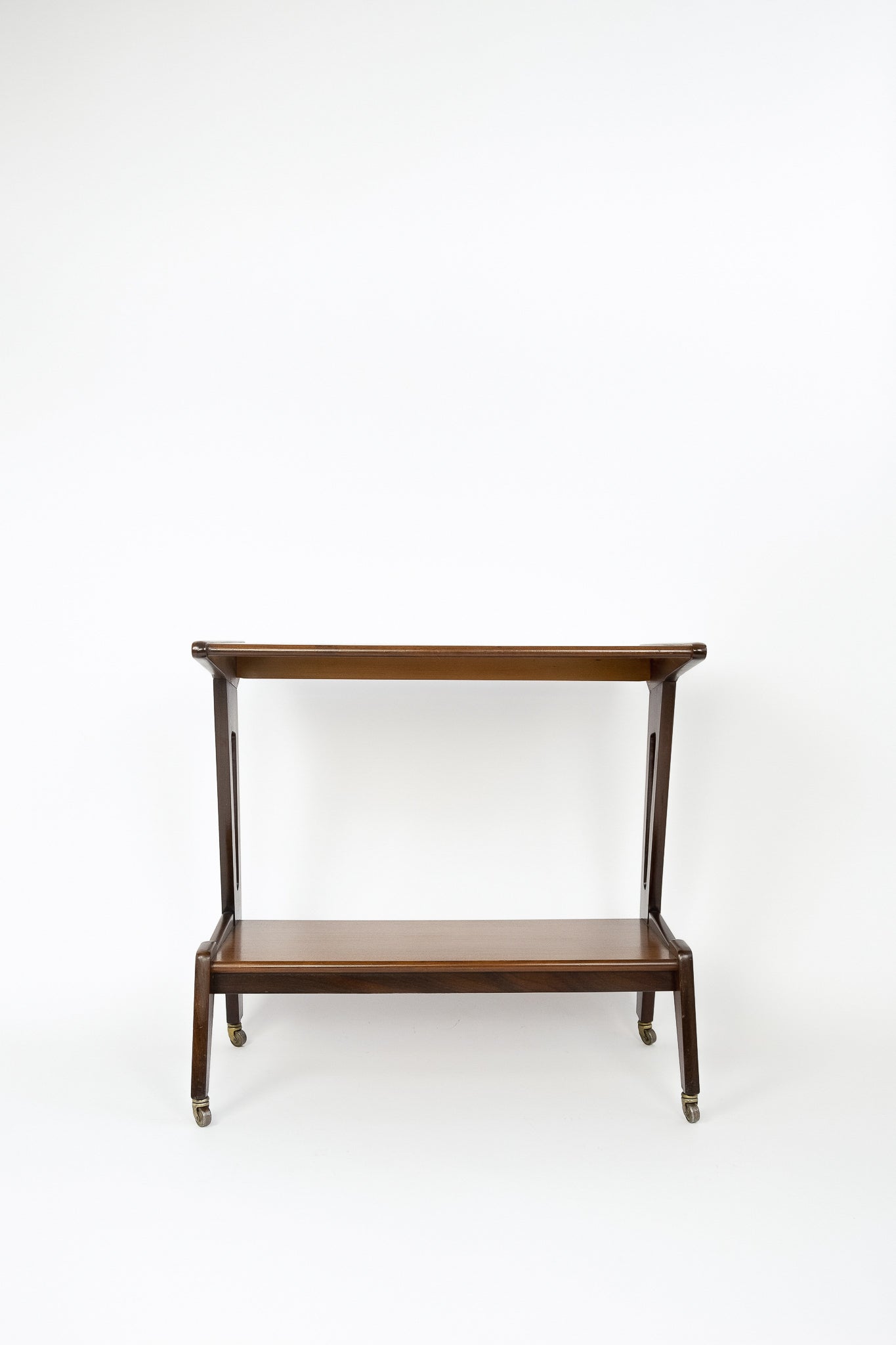 This beautiful side table/bar cart was designed by Louis van Teeffelen for Wébé in the 1960s. It features a sleek design made of solid teak wood. It has the original brass wheels and almost no signs of use, with only a small discoloration on the top.