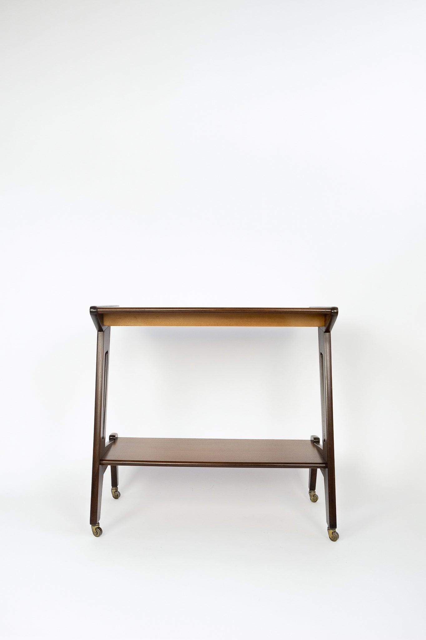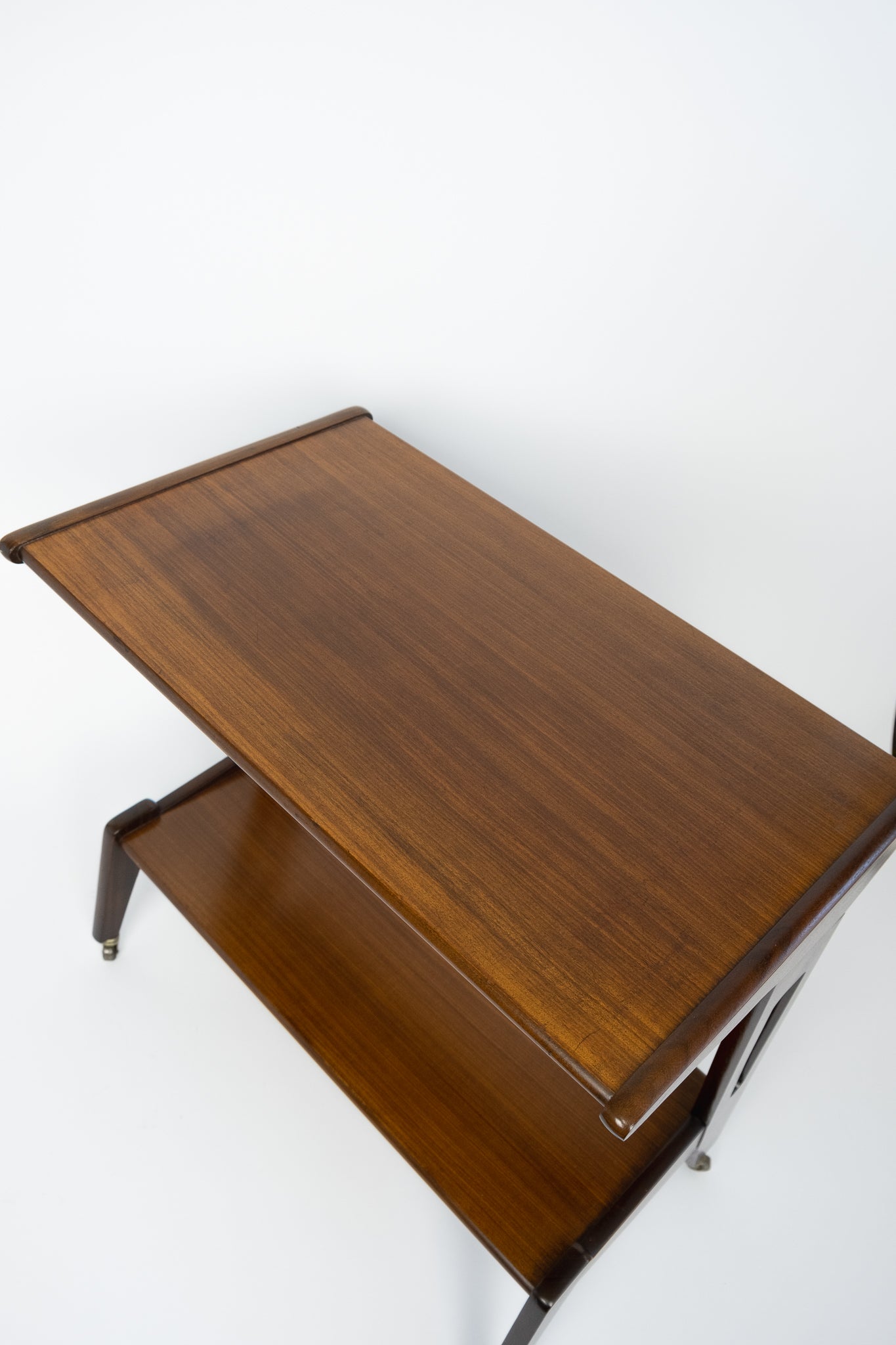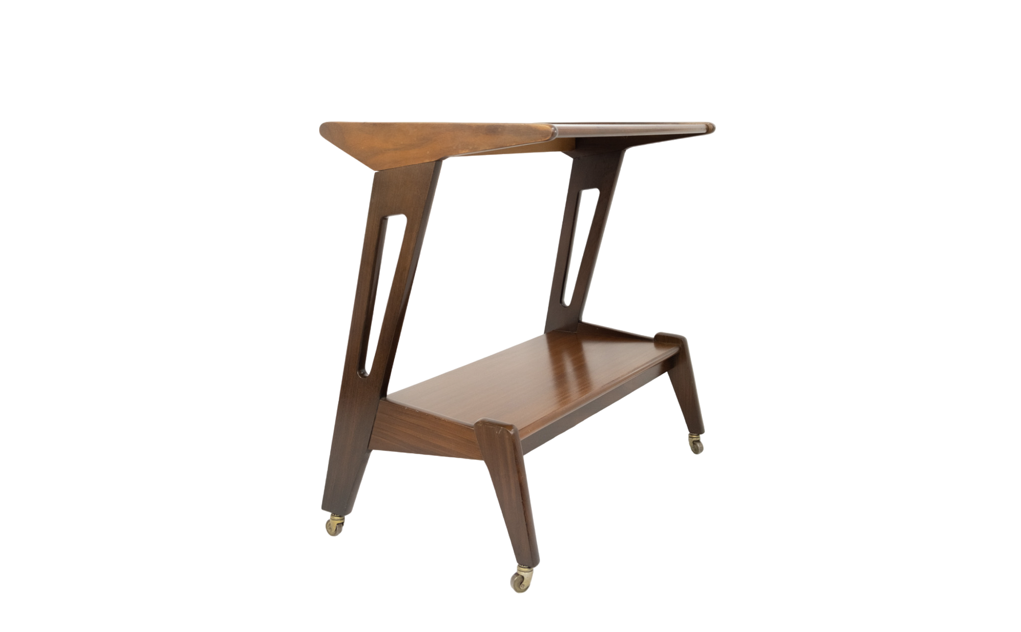 This beautiful side table/bar cart was designed by Louis van Teeffelen for Wébé in the 1960s. It features a sleek design made of solid teak wood. It has the original brass wheels and almost no signs of use, with only a small discoloration on the top.