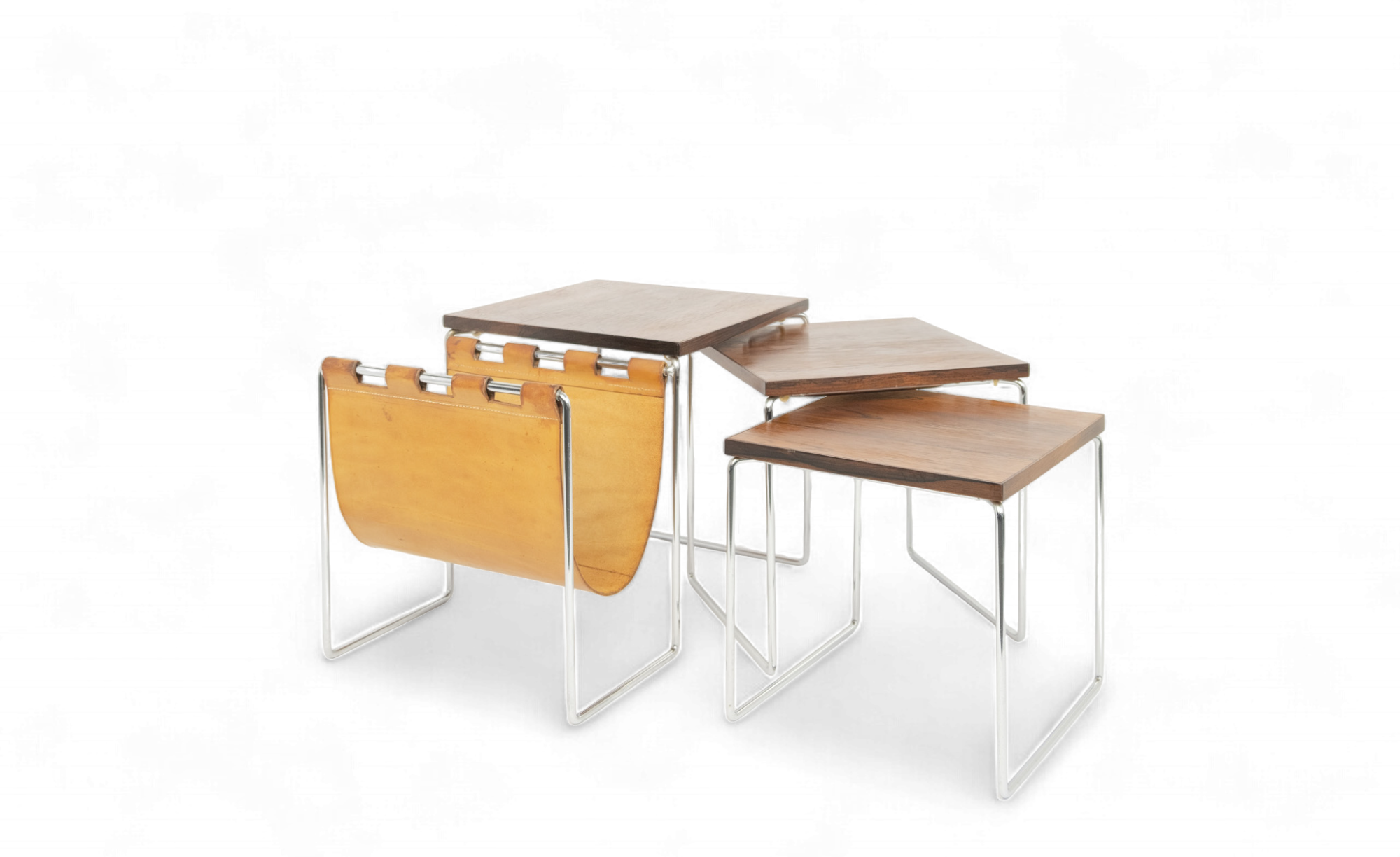 The beautiful side tables/nesting tables by Brabantia with rosewood and chrome frame are true classics. The mimiset includes three tables, with the largest one featuring a leather magazine rack. They date from the period 1960-1969 and are from Brabantia Holland. The set has minimal vintage wear and is a great addition to your living room!
