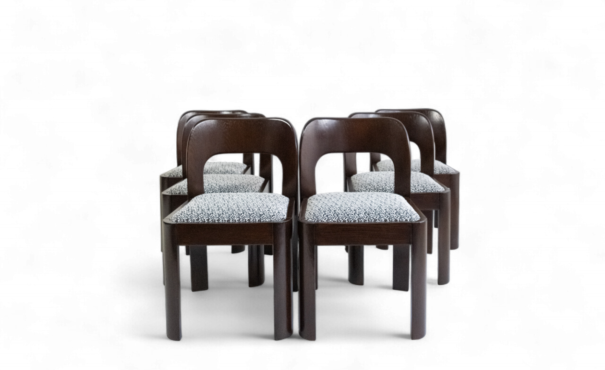 Stoic brutalist dining set with six chairs. The chairs feature beautifully rounded shapes and have been refurbished with new foam and upholstery. The table has a black plastic top resembling slate and shows signs of use, as visible in the photos.