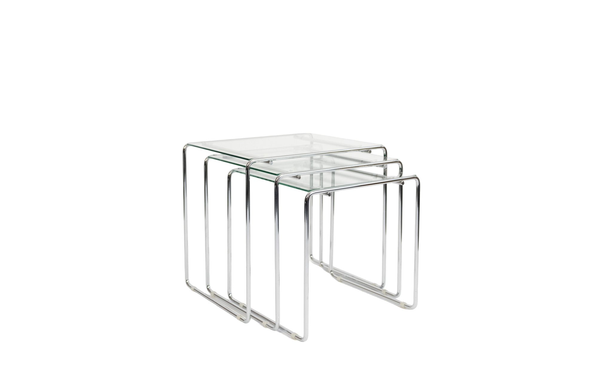 The glass top of the medium-sized table has been replaced due to a chip, while the other two have light scratches but are otherwise in good condition.