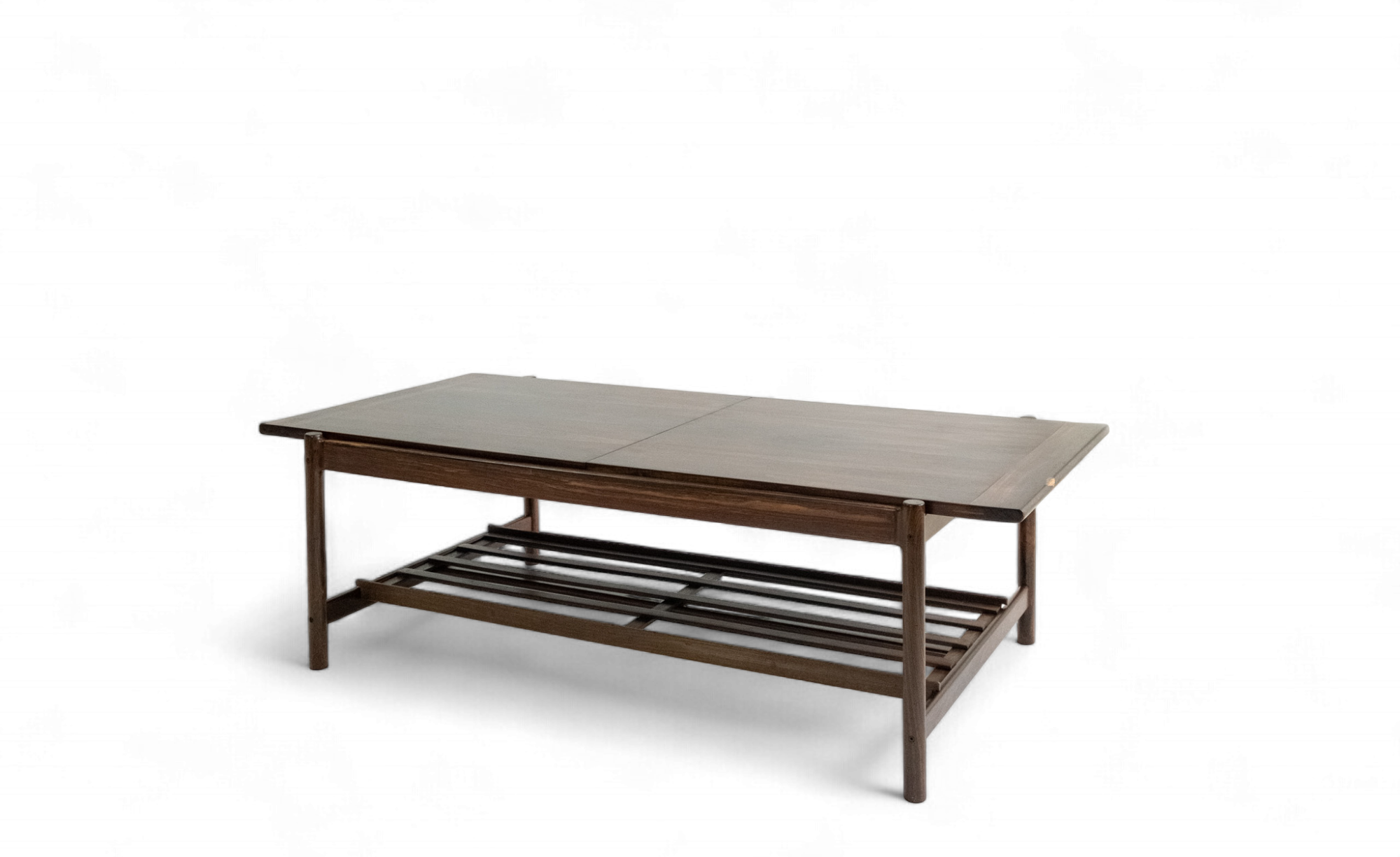This stunning coffee table is designed by Torbjørn Afdal for Mellemstrands Bruksbo Norway, known as model 'Sari'. The table is crafted from rosewood and features a center section of black formica/rosewood that folds out when you slide the two main parts apart. Including the center section, this coffee table measures 203 cm in length, making it perfect for a large space! The bottom rack is not originally part of the design but is detachable and easy to remove.