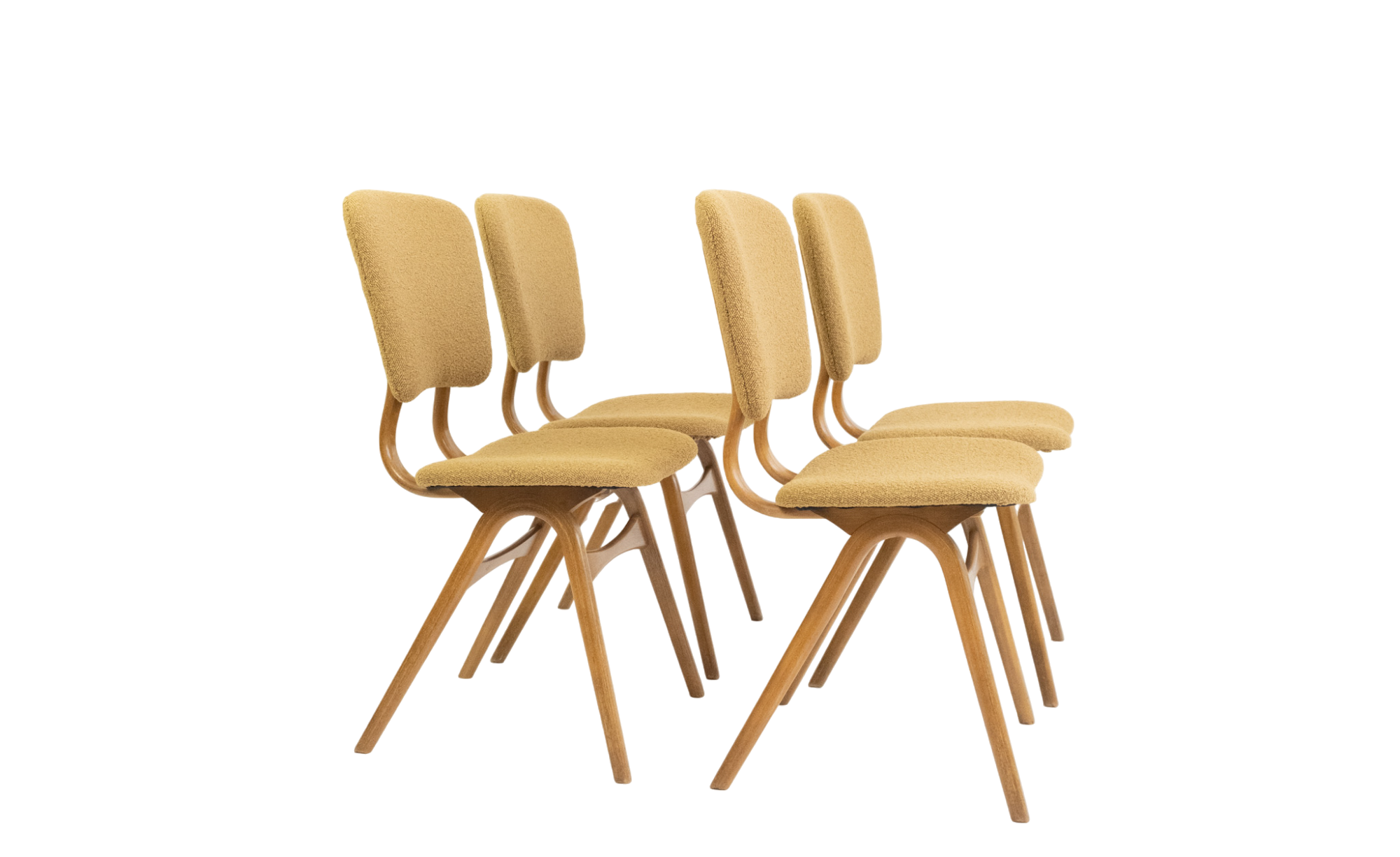 Four Danish design dining chairs from the 1960s. Featuring beautifully curved legs and a springy backrest for optimal comfort. The chairs have been reupholstered and are in good vintage condition. A stylish addition to any interior.
