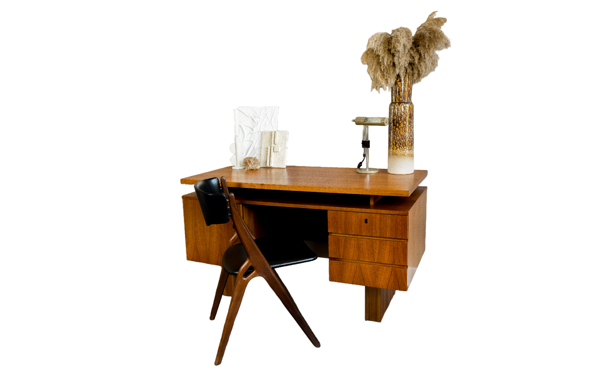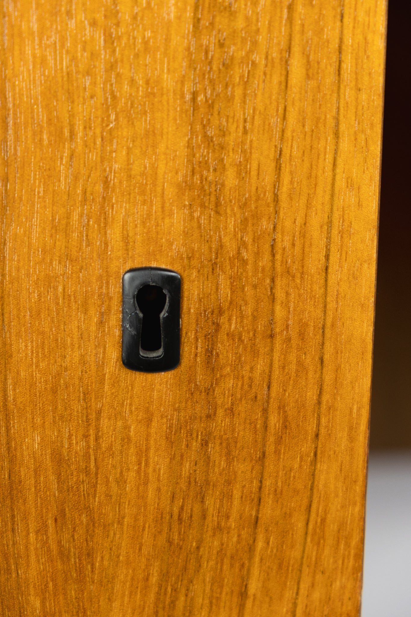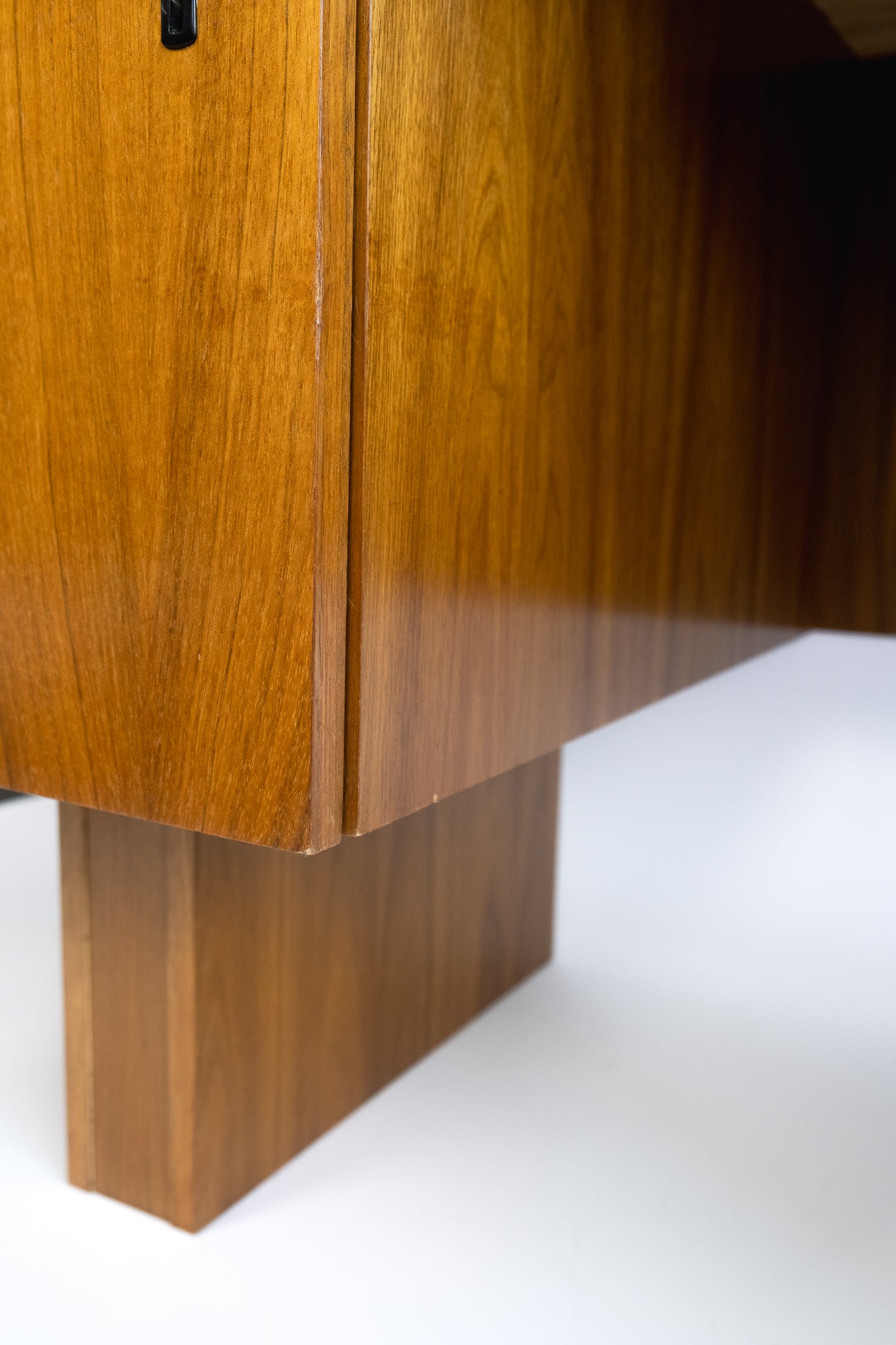 Stylish teak design desk from the 60s/70s. It features a door, three drawers, and additional storage space under the top. The desk is still in very good condition. Unfortunately, the designer and manufacturer are unknown. The top has a discoloration, and the lock is damaged. Vintage condition, see photos for details.