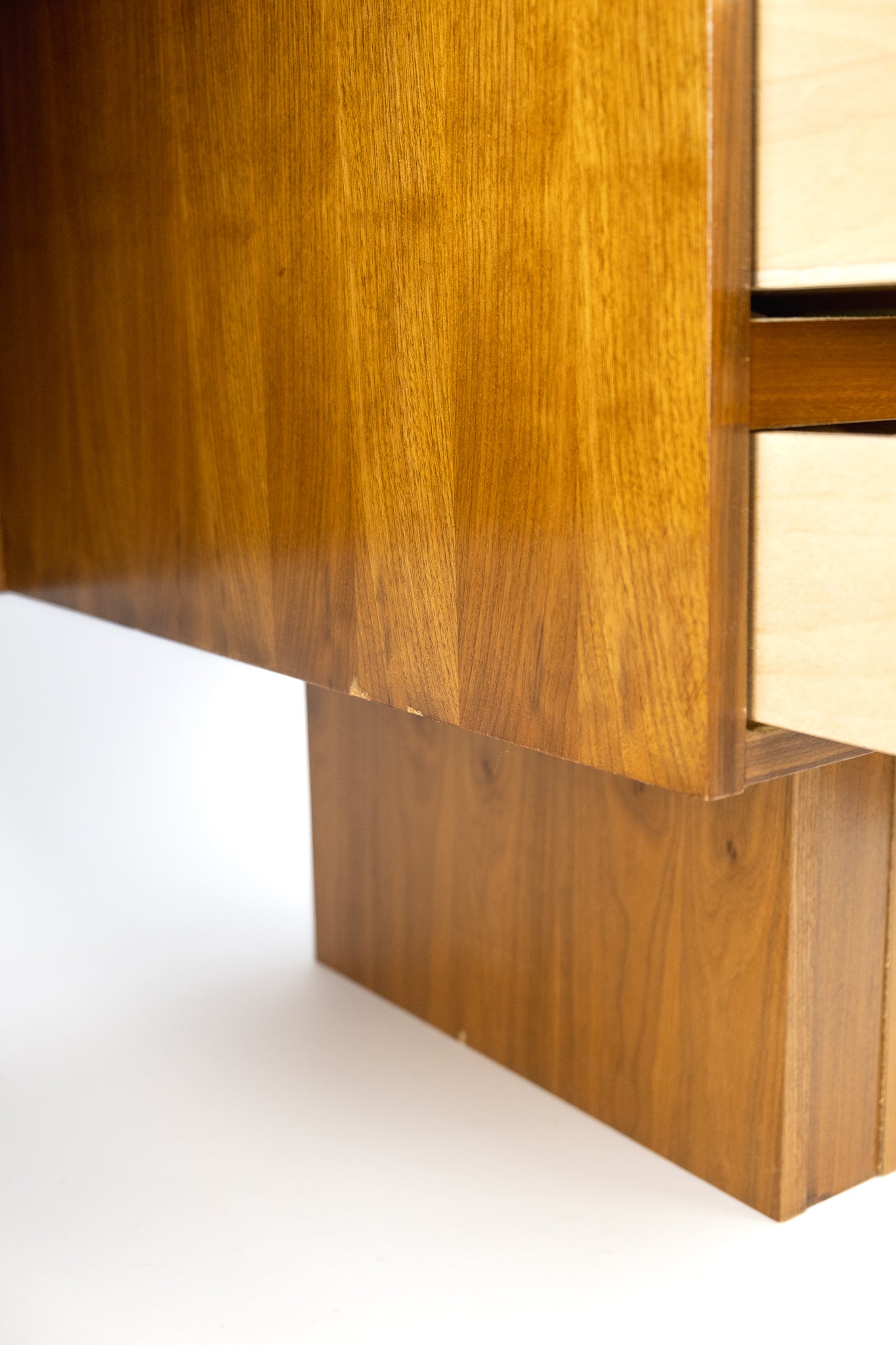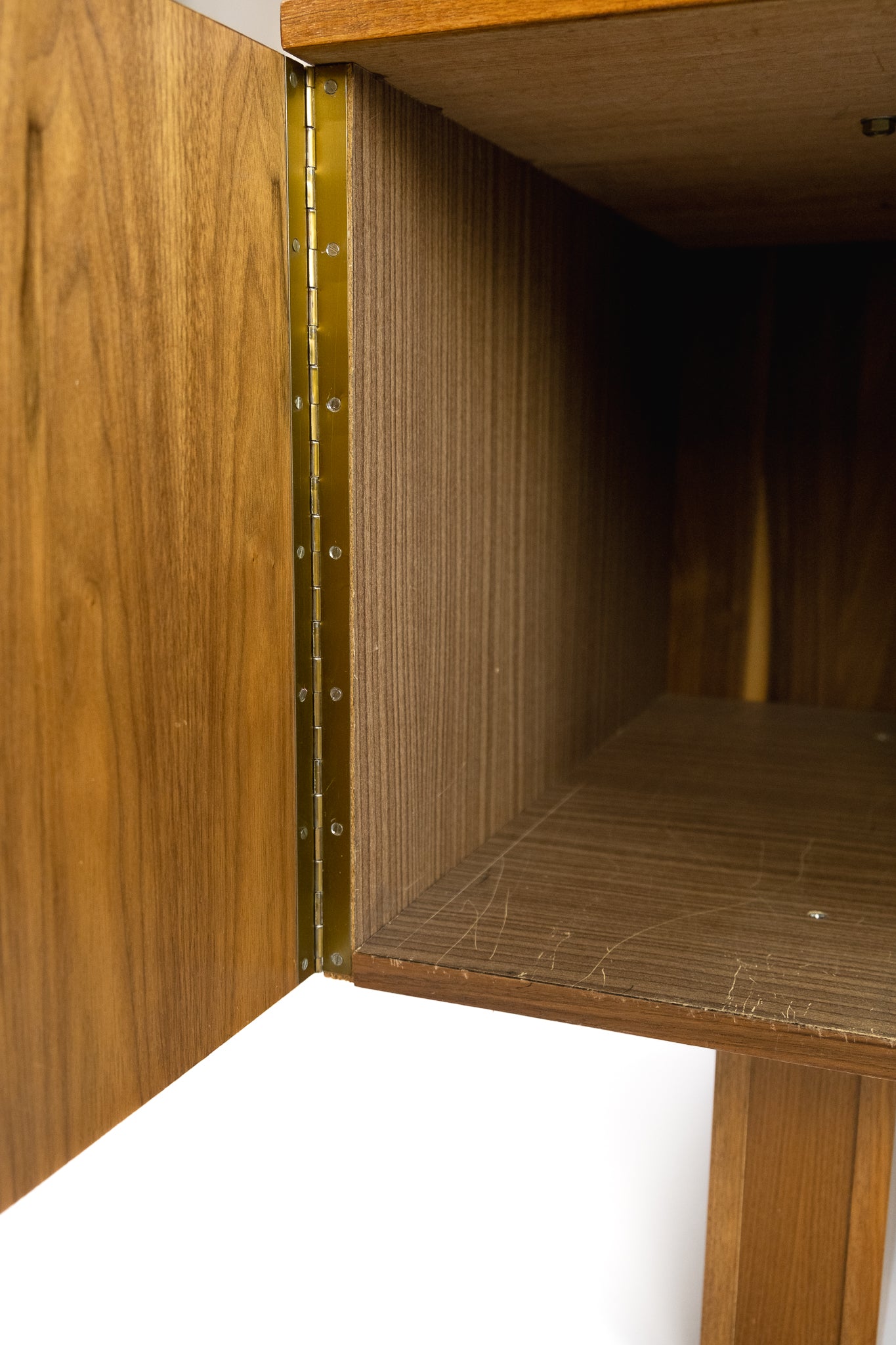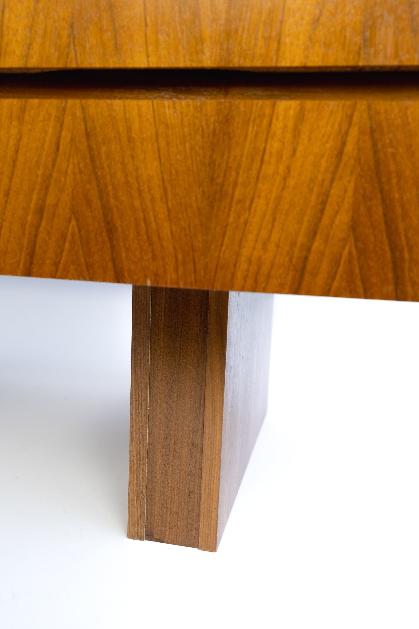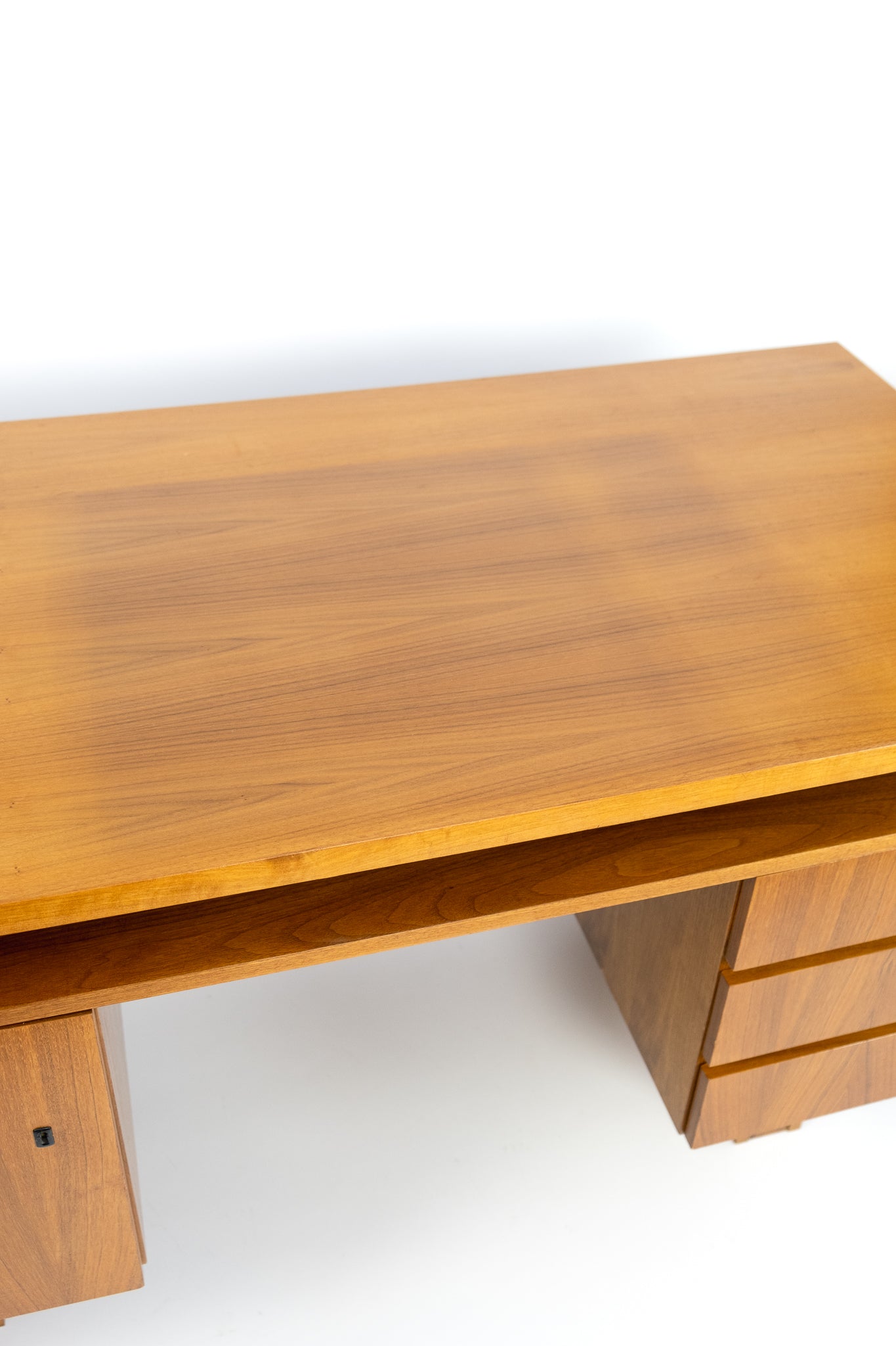 Stylish teak design desk from the 60s/70s. It features a door, three drawers, and additional storage space under the top. The desk is still in very good condition. Unfortunately, the designer and manufacturer are unknown. The top has a discoloration, and the lock is damaged. Vintage condition, see photos for details.