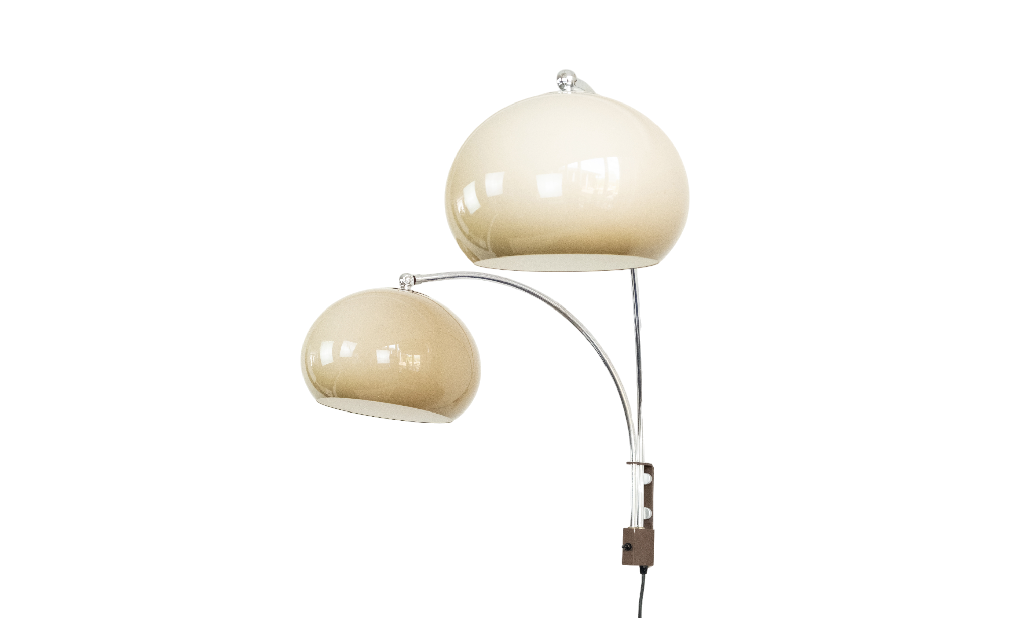 This Dijkstra lamp with two beige/brown lampshades can be adjusted in any direction, providing beautiful diffuse light. It's a classy addition to your wall. The wiring and switch material are original. The lamp shows signs of wear consistent with its age.