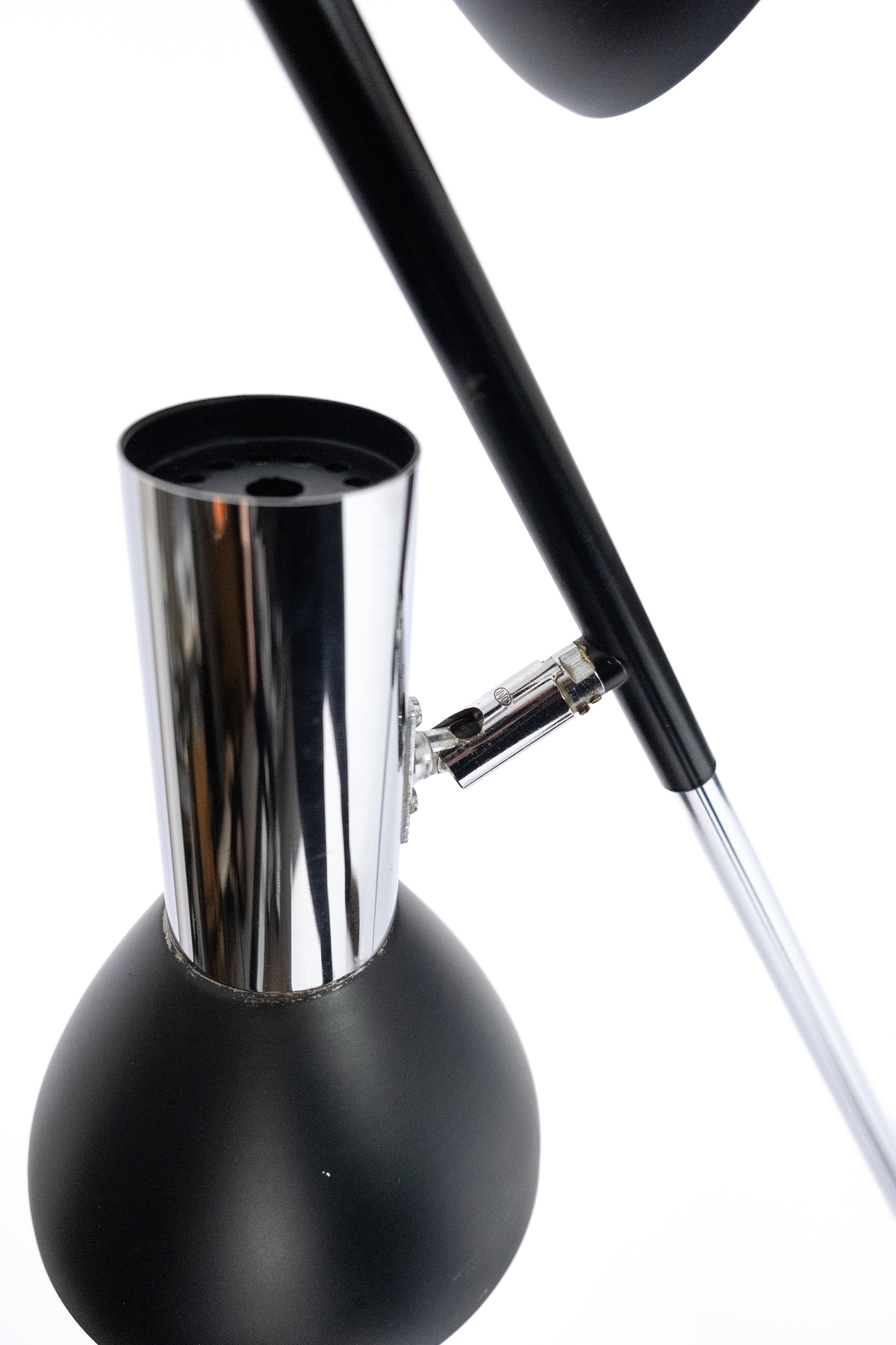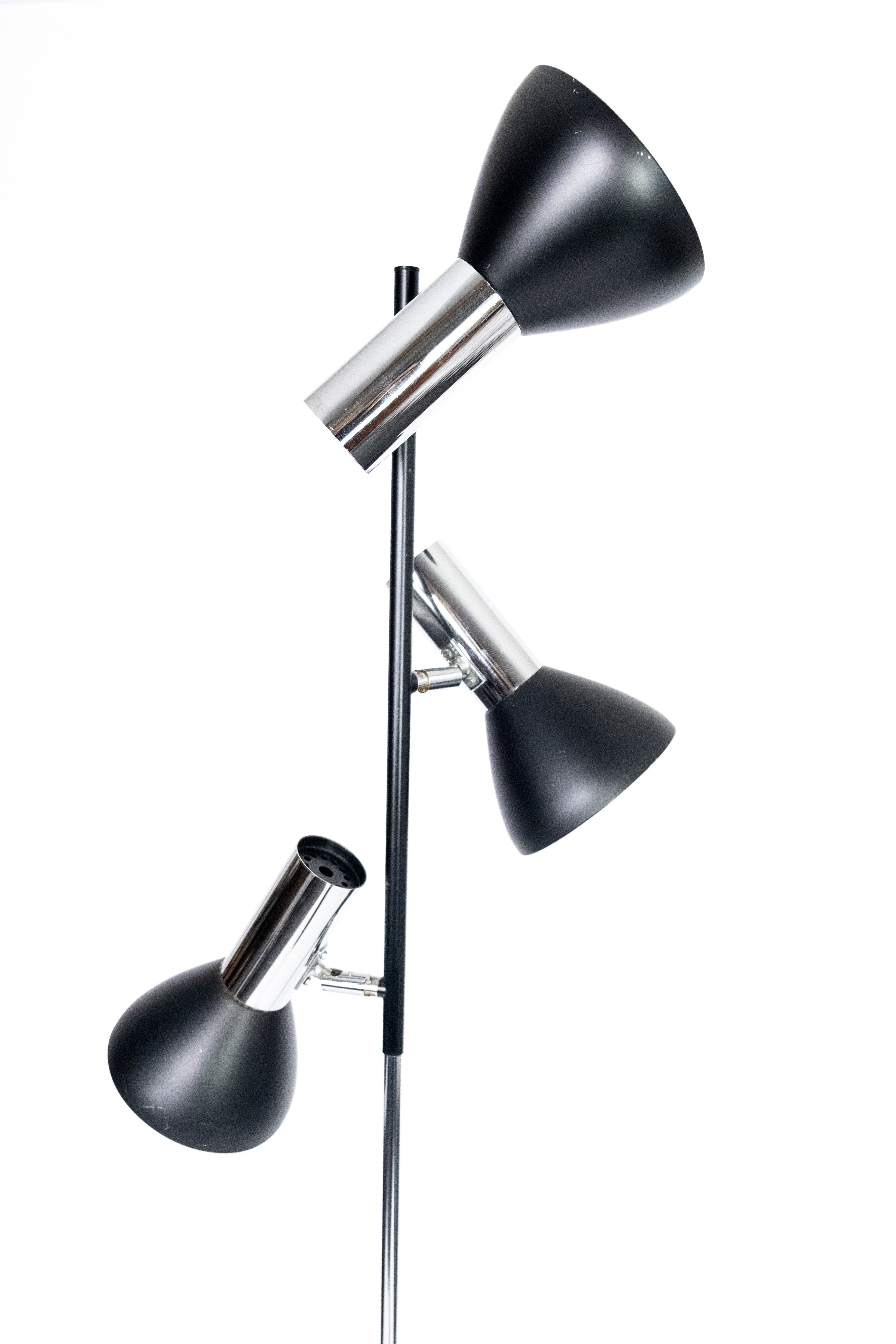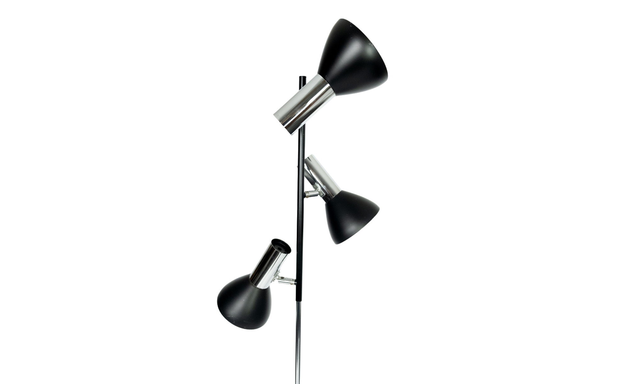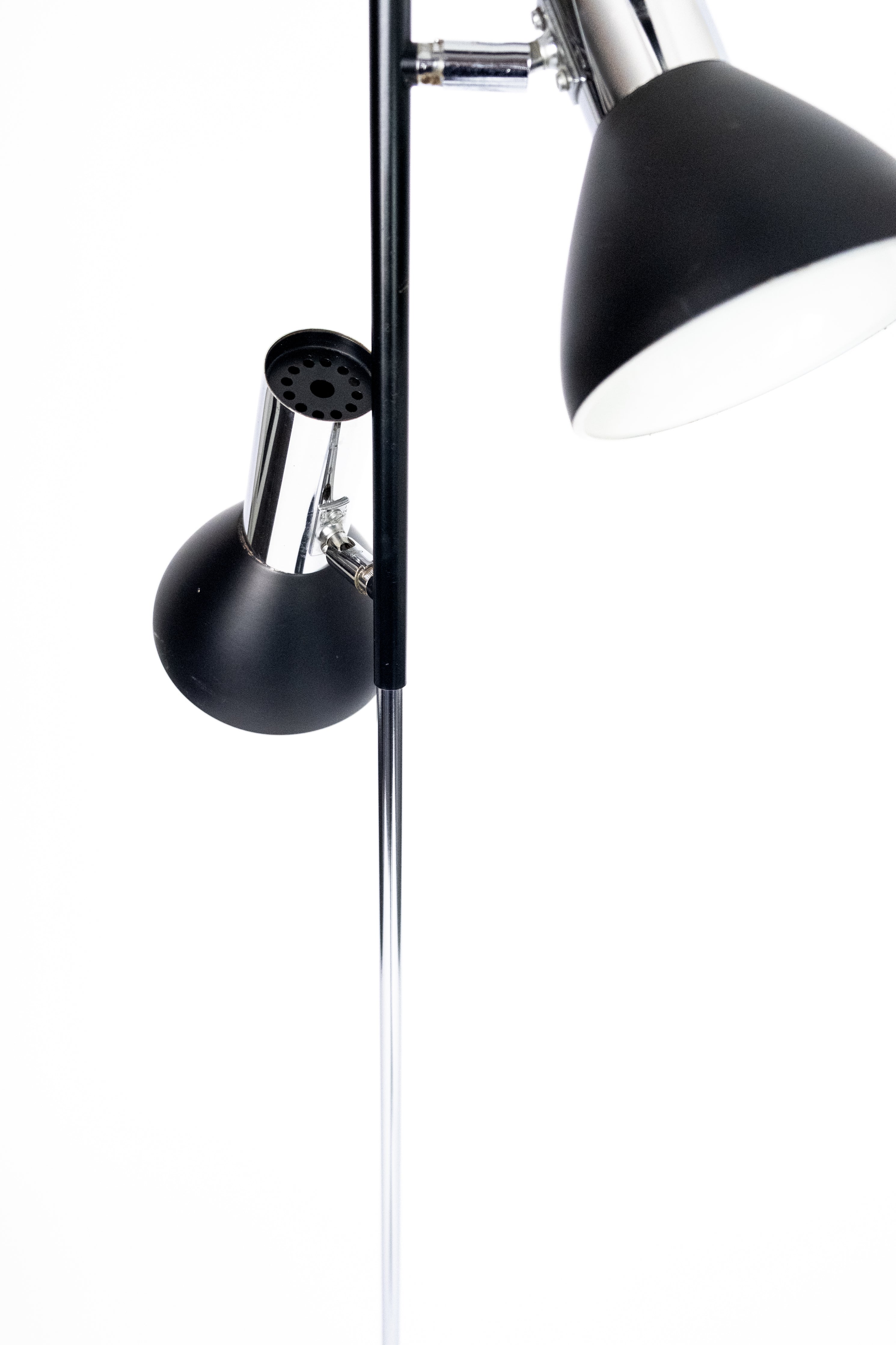 This elegant tall floor lamp features chrome-plated spotlights with matte black shades. The base plate is a heavy metal disc, ensuring stability. The lamp is in very good vintage condition with minor signs of use. The spotlights can be individually switched on and off using the foot switch.