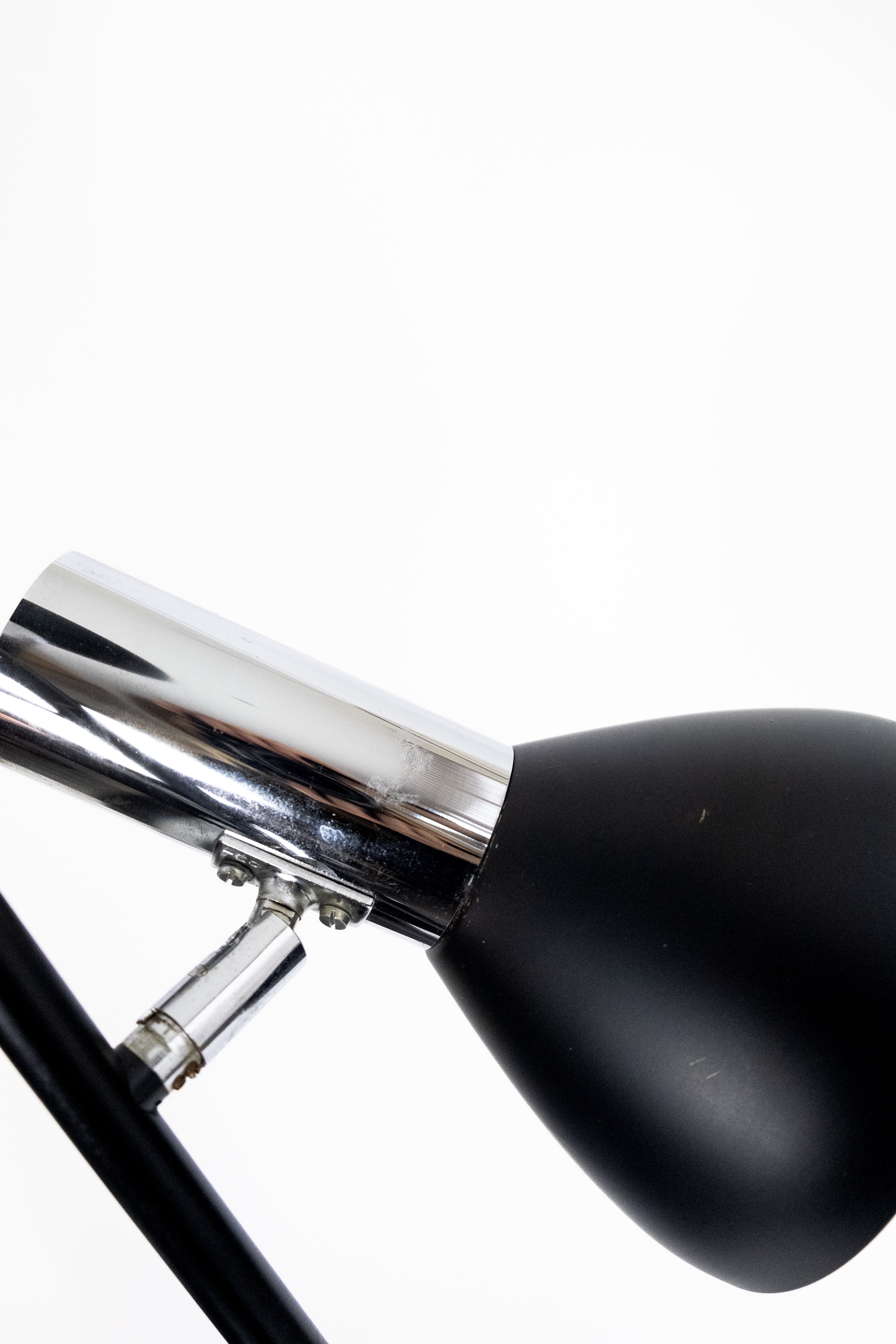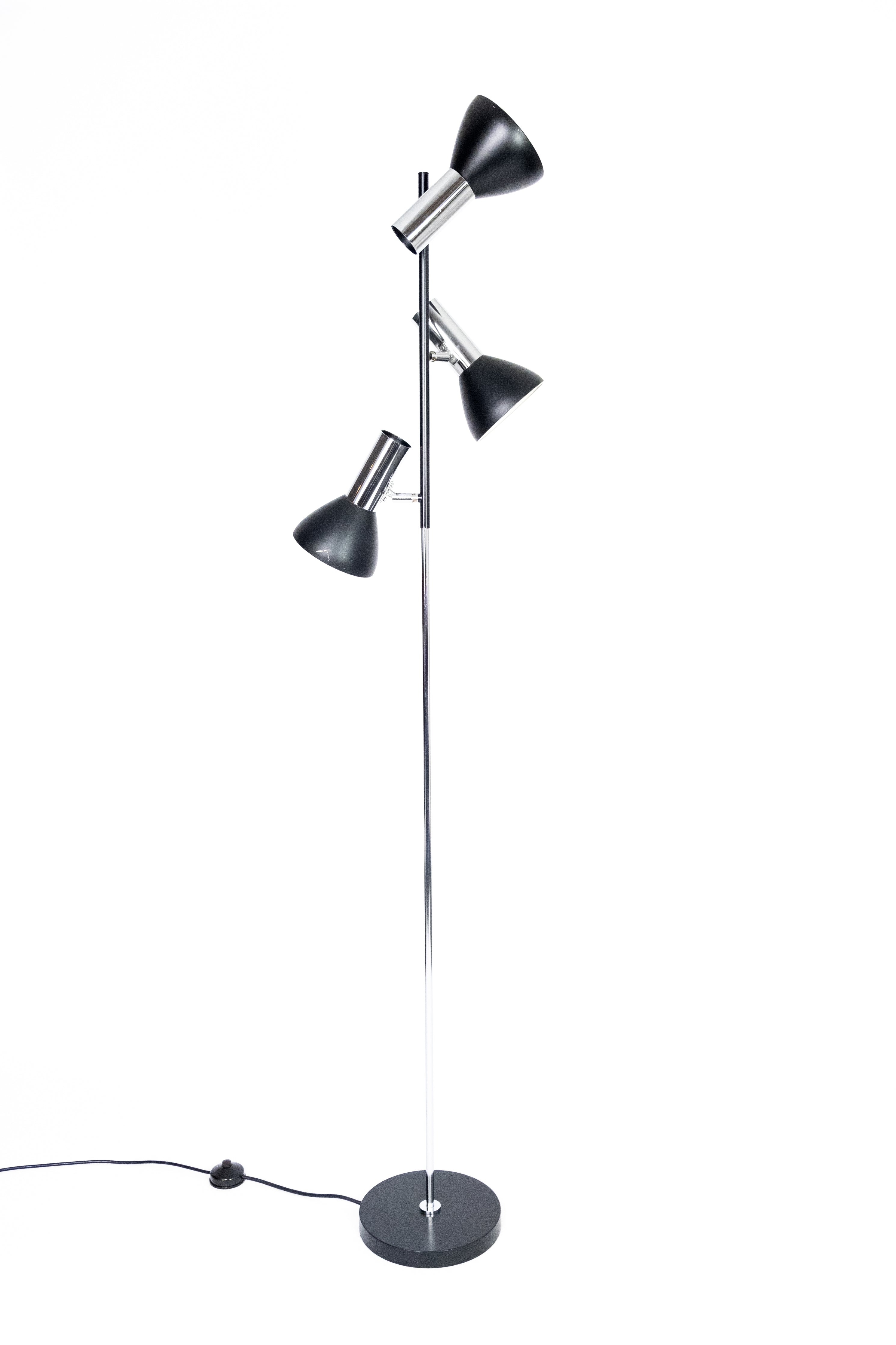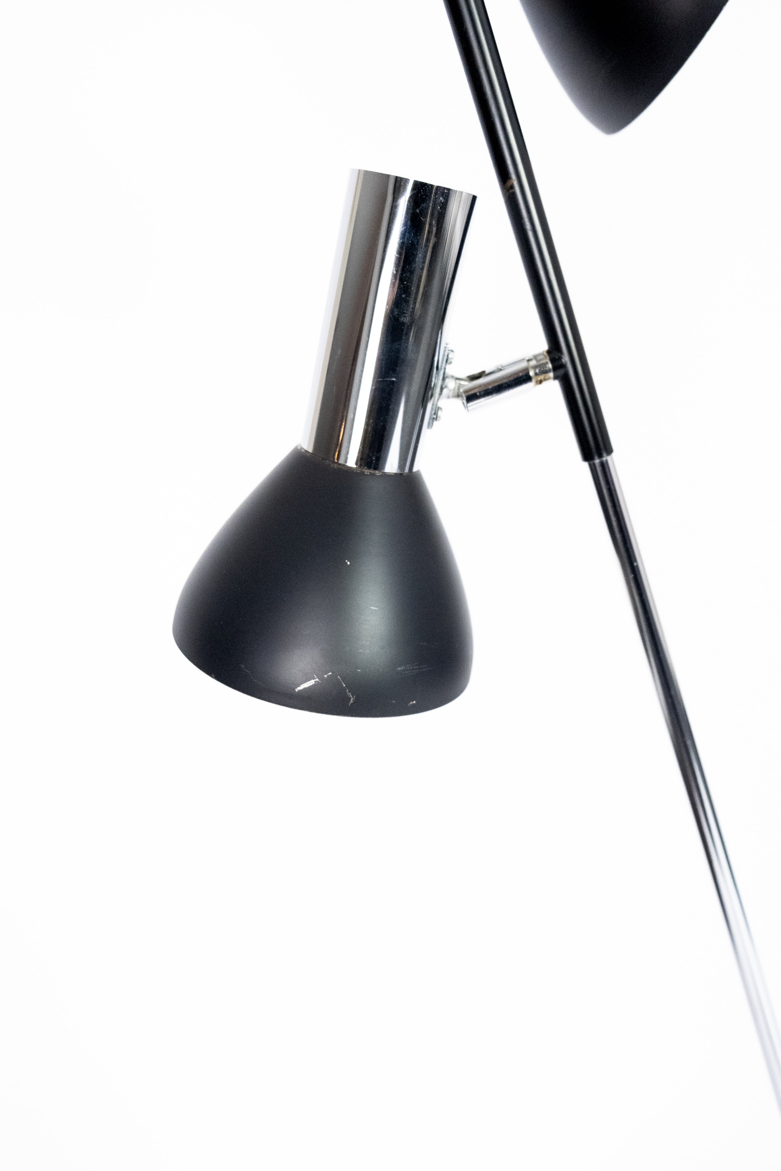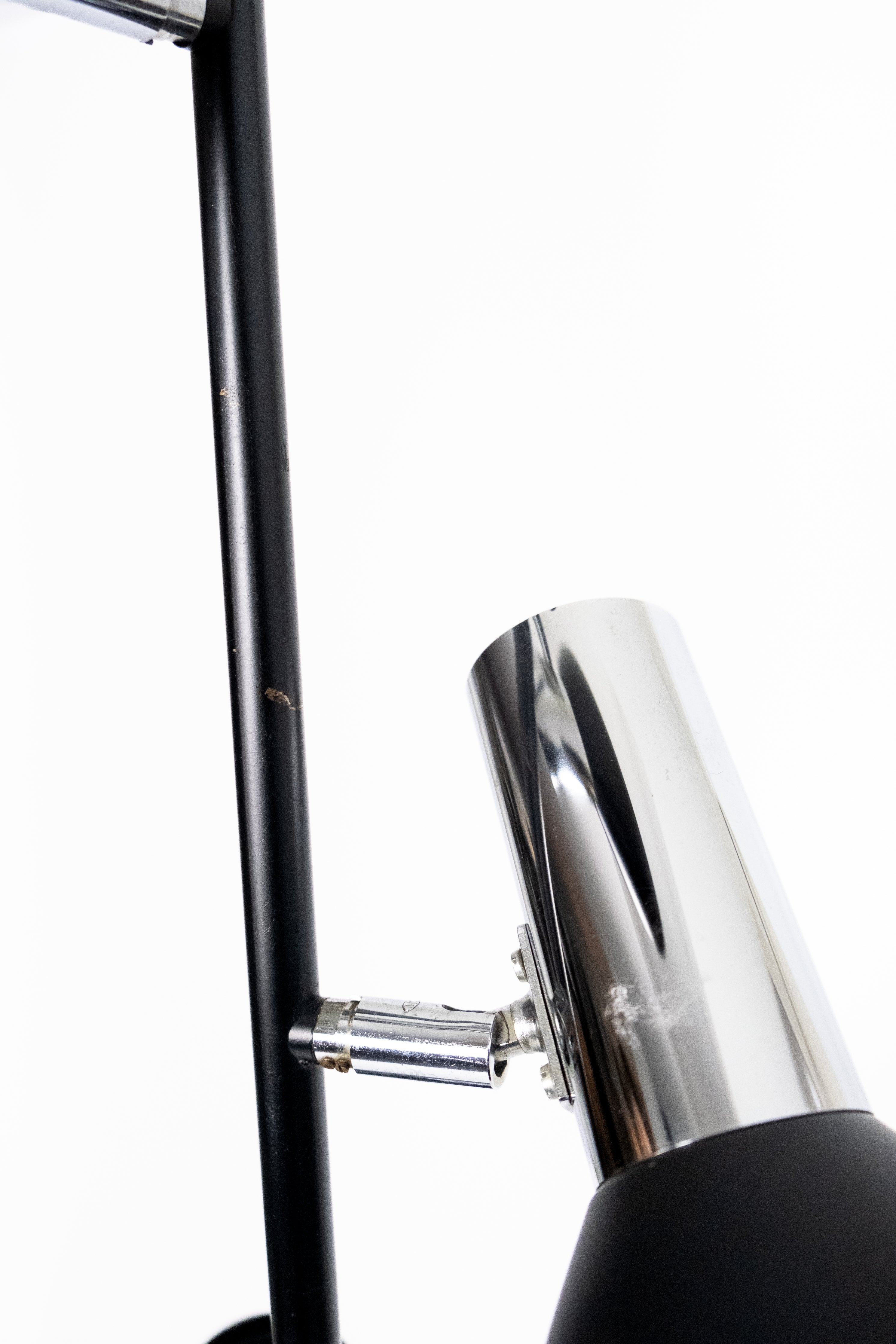 This elegant tall floor lamp features chrome-plated spotlights with matte black shades. The base plate is a heavy metal disc, ensuring stability. The lamp is in very good vintage condition with minor signs of use. The spotlights can be individually switched on and off using the foot switch.