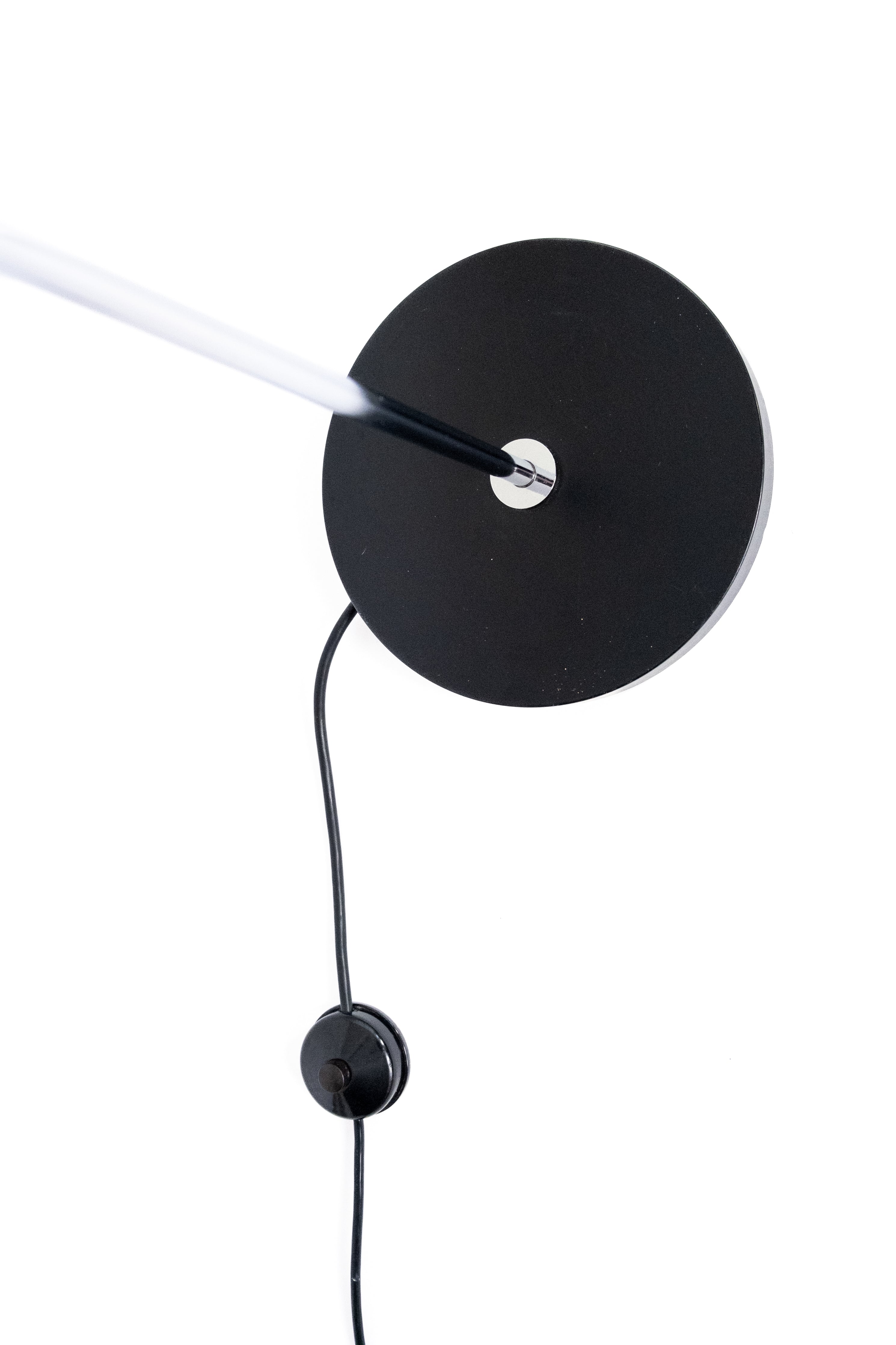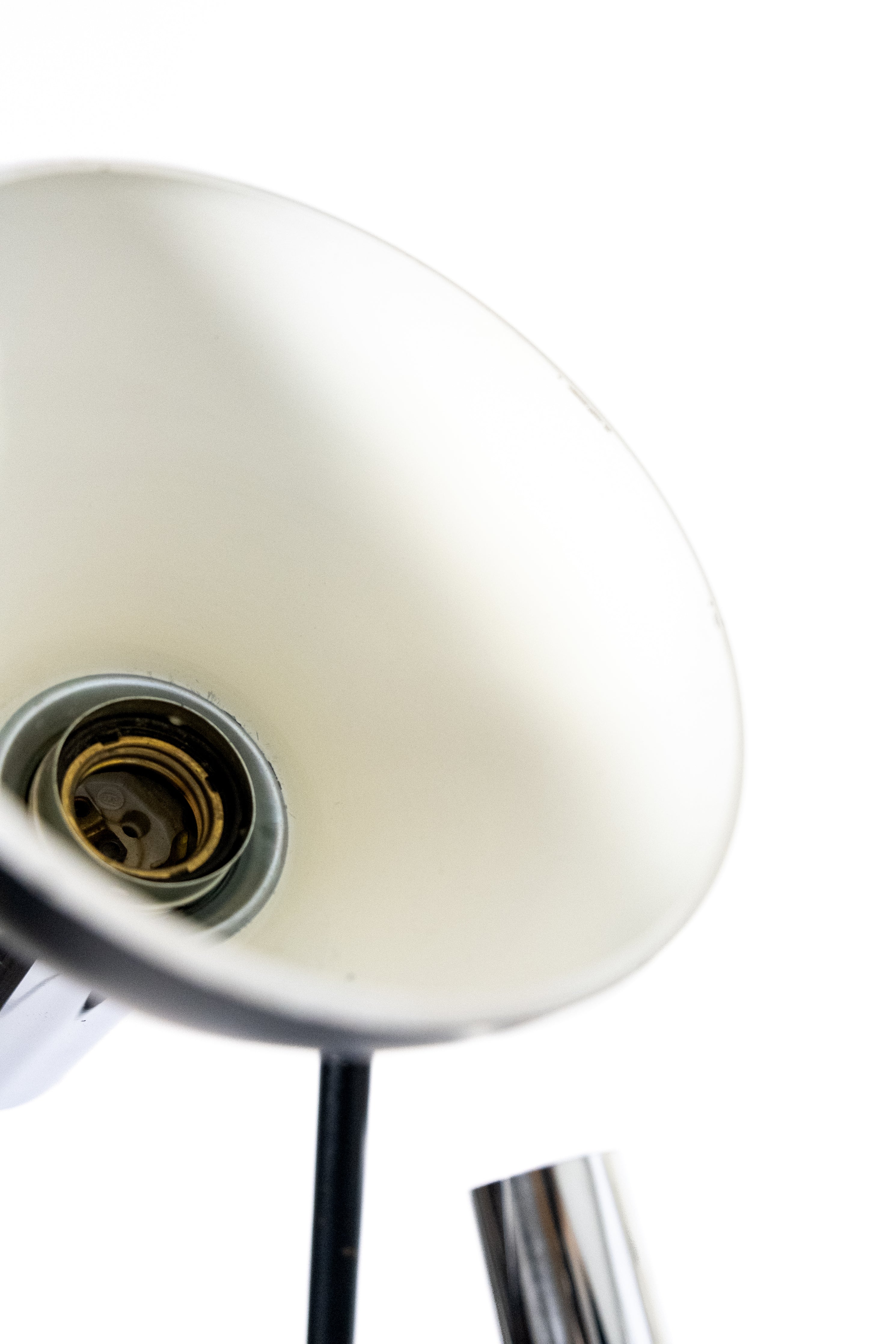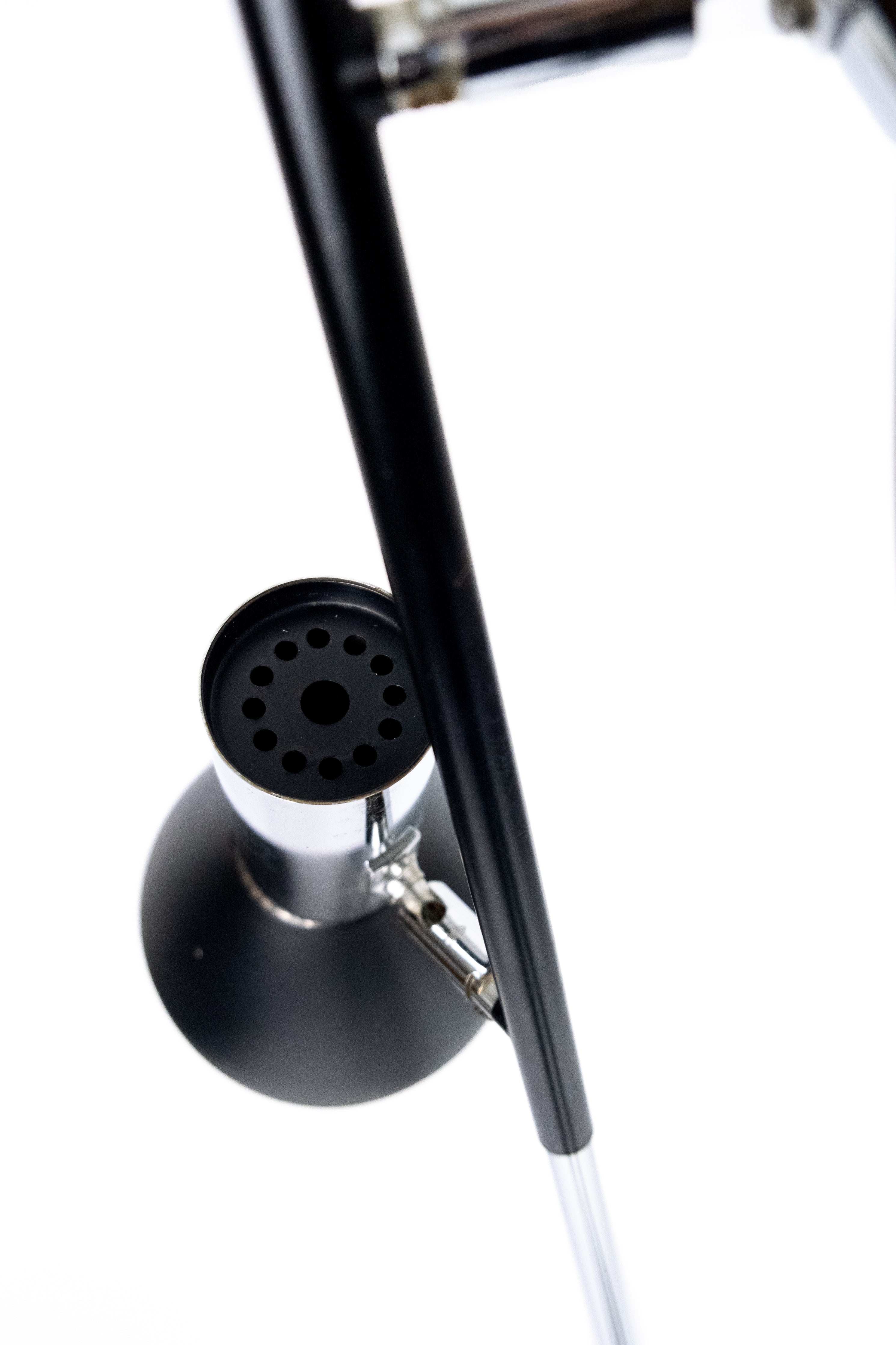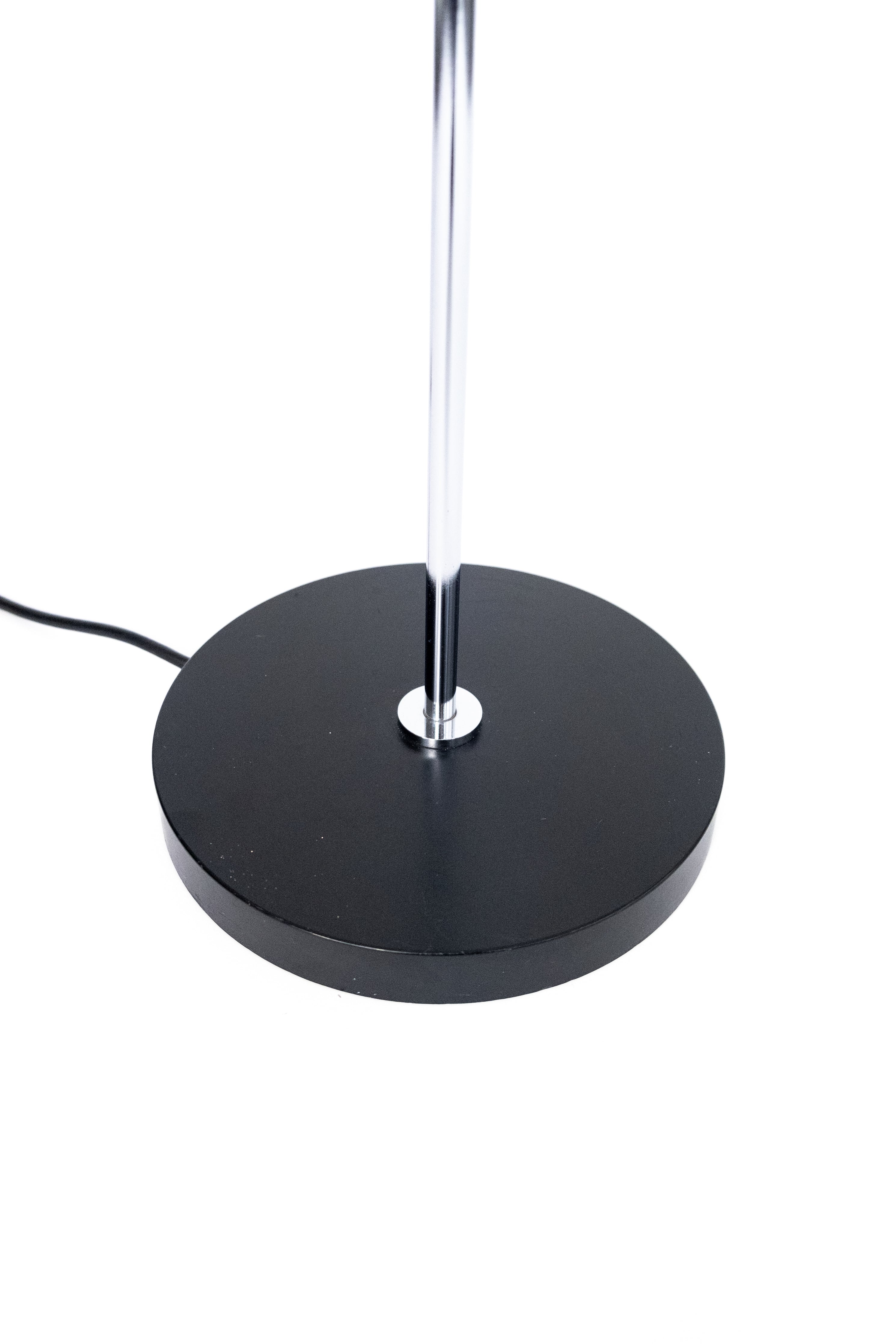 This elegant tall floor lamp features chrome-plated spotlights with matte black shades. The base plate is a heavy metal disc, ensuring stability. The lamp is in very good vintage condition with minor signs of use. The spotlights can be individually switched on and off using the foot switch.