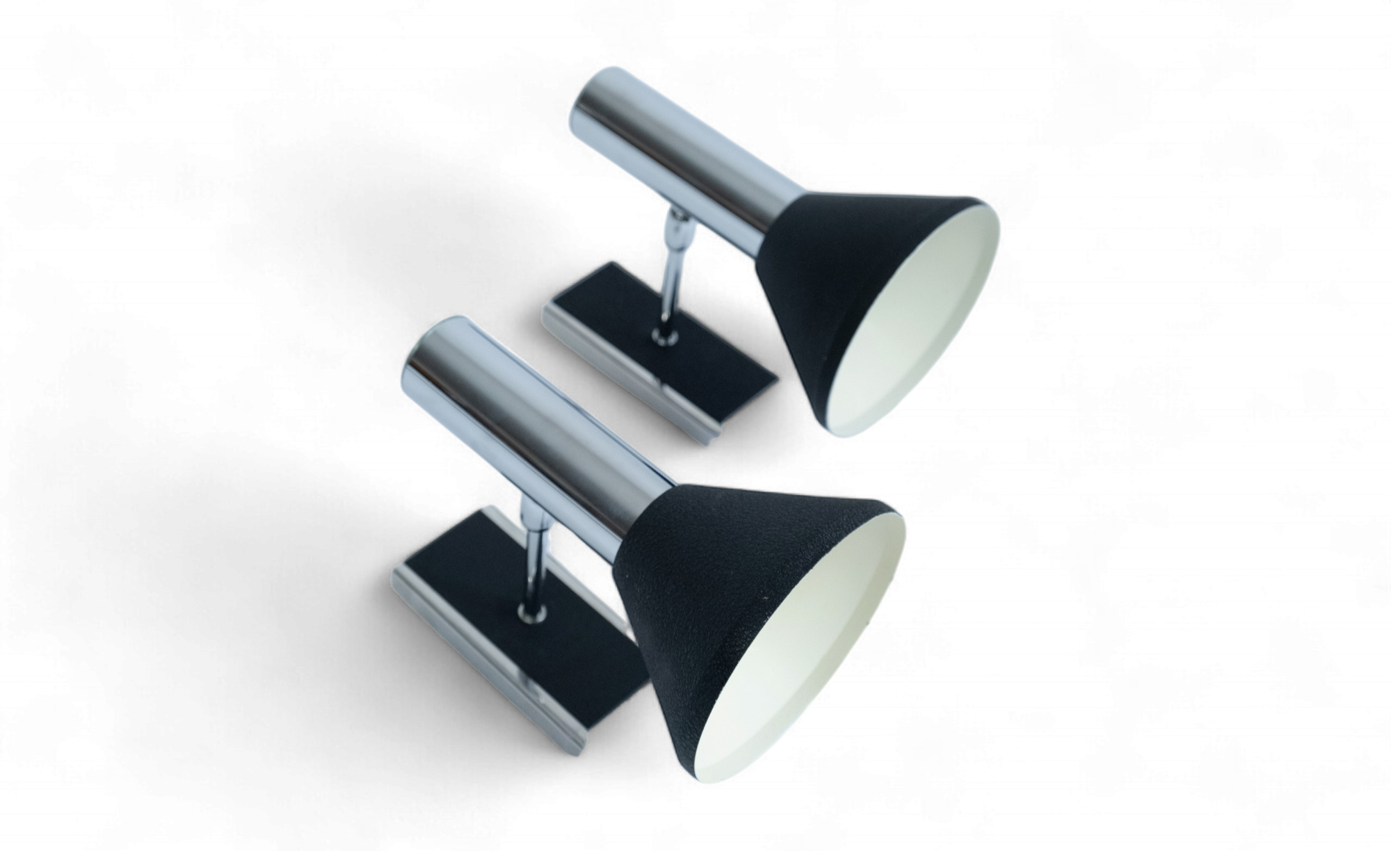 Two spotlights from Hala Zeist that look great next to your favorite painting or near your couch. The lamps are in beautiful vintage condition. The cords have been replaced and can be optionally removed. The spots come complete with mounting plates, one of which we replicated ourselves.