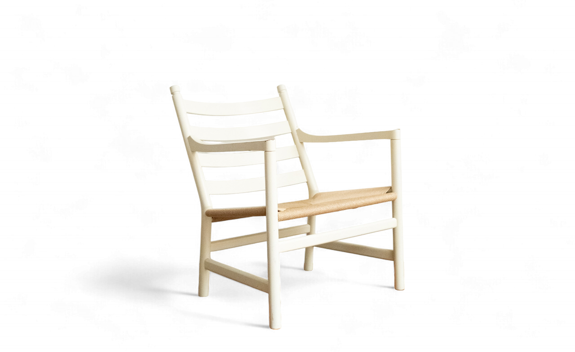 This classic easy chair is designed by Hans J. Wegner for Carl Hansen & Son. Typically, the CH44 is found in natural wood finishes, but ours is white lacquered. The white finish shows some signs of wear in places, and we have had the papercord replaced. Please refer to the photos for details of the wear and tear.