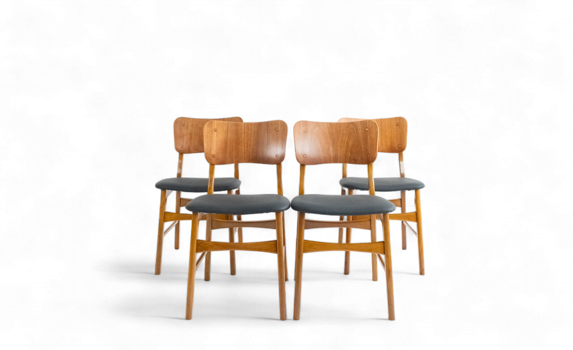 This set of 4 dining chairs was designed by Ib Kofod Larsen. They are incredibly comfortable and have been reupholstered with new fabric. The chairs feature beautiful wooden knobs in the backrest. The set is in good vintage condition with signs of use.