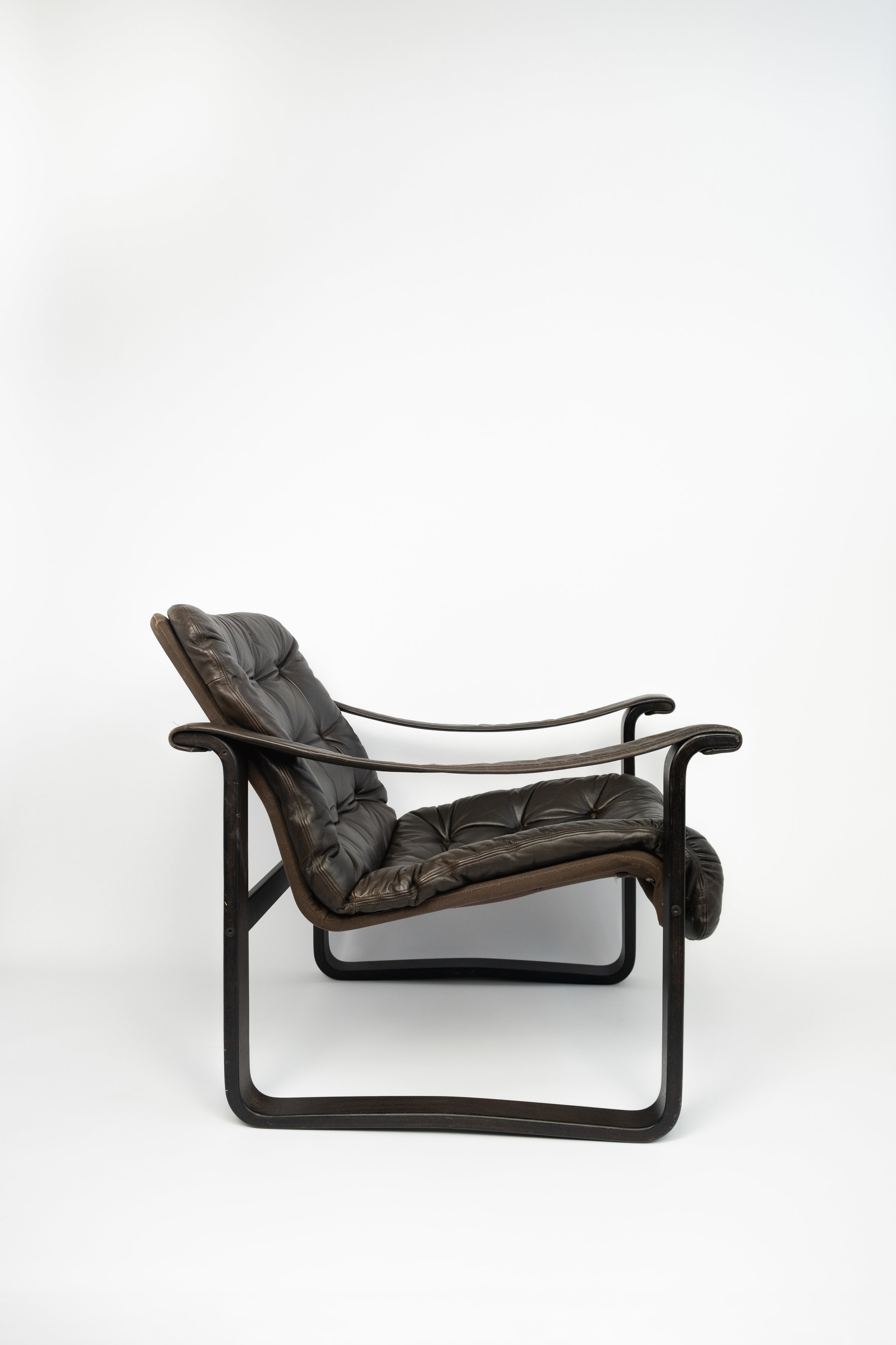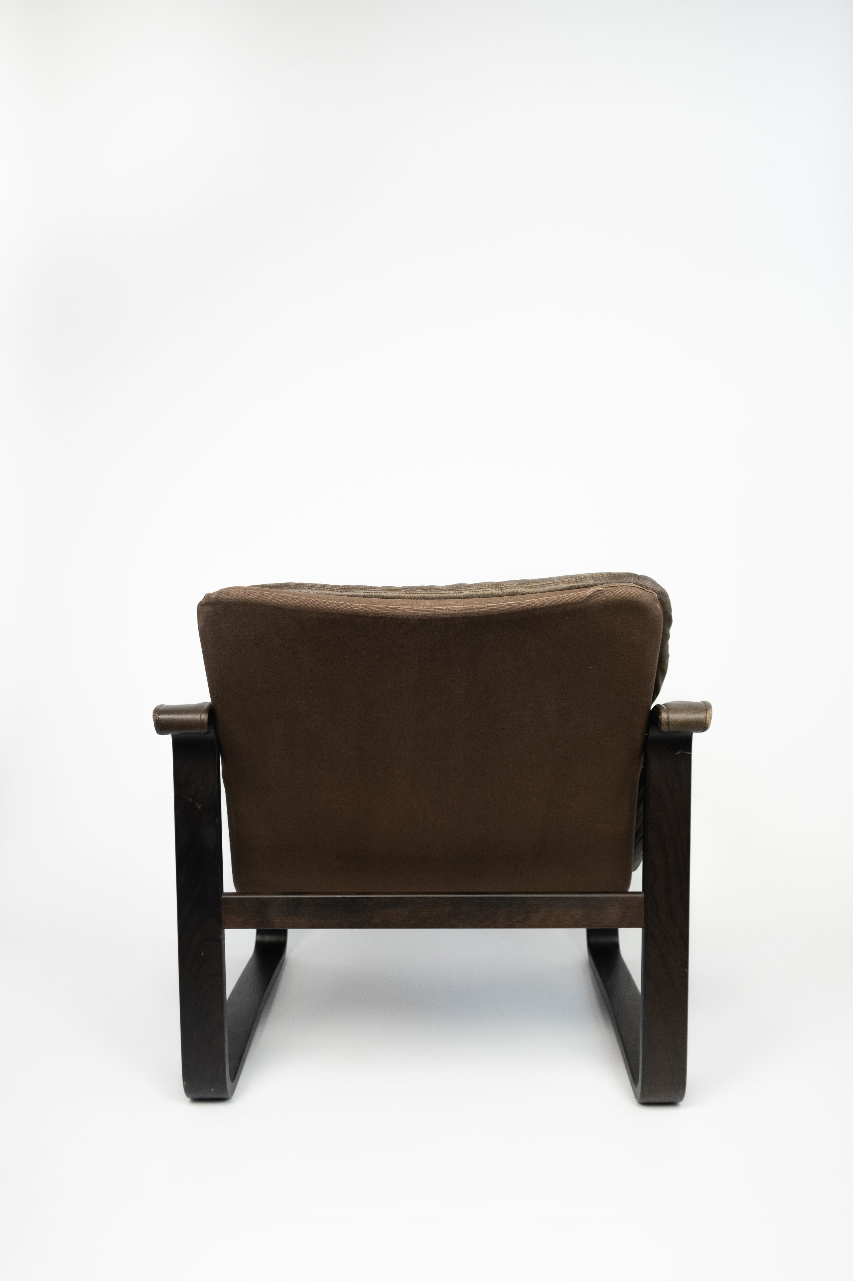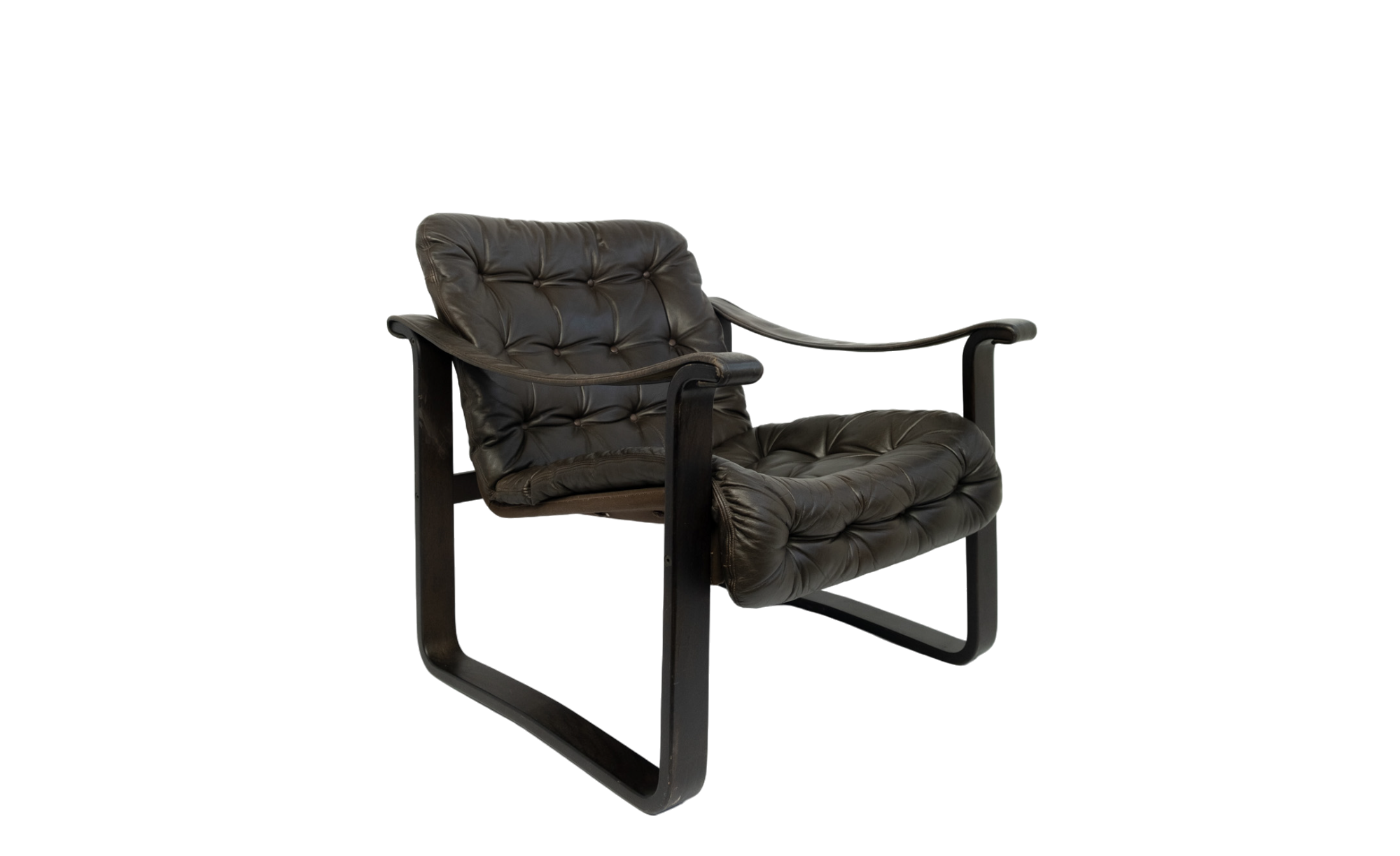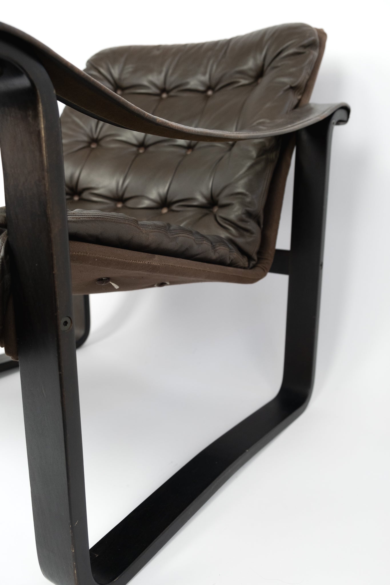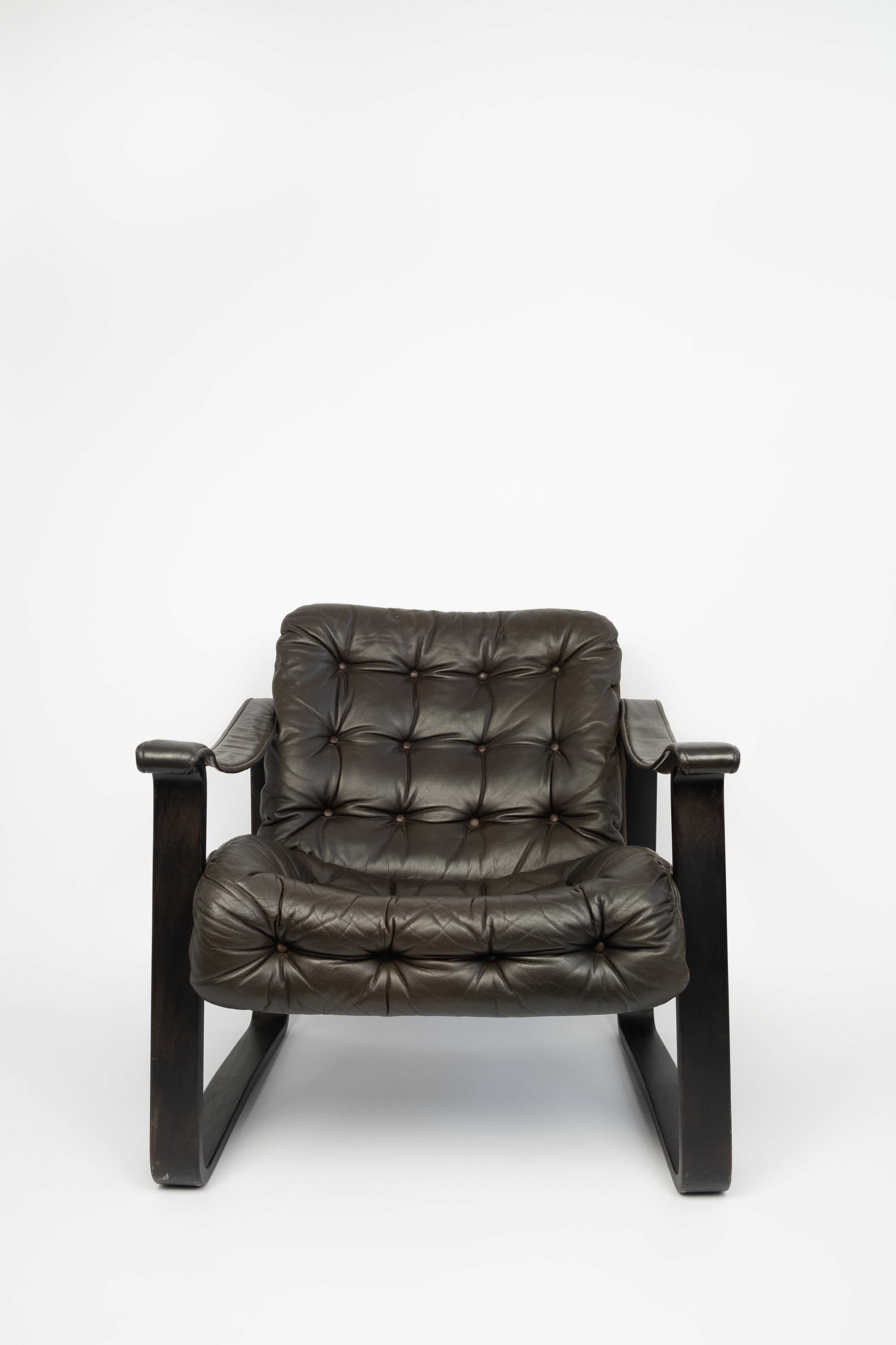 Beautiful midcentury leather 'safari' armchair, designed by OY BJ Dahlqvist for BD Furniture from Finland. This chair from the 1960s is crafted from gorgeous dark brown wood with a fabric seat and fixed cushions of dark brown tufted leather. The chair is still in very good, original condition with only minor signs of use.