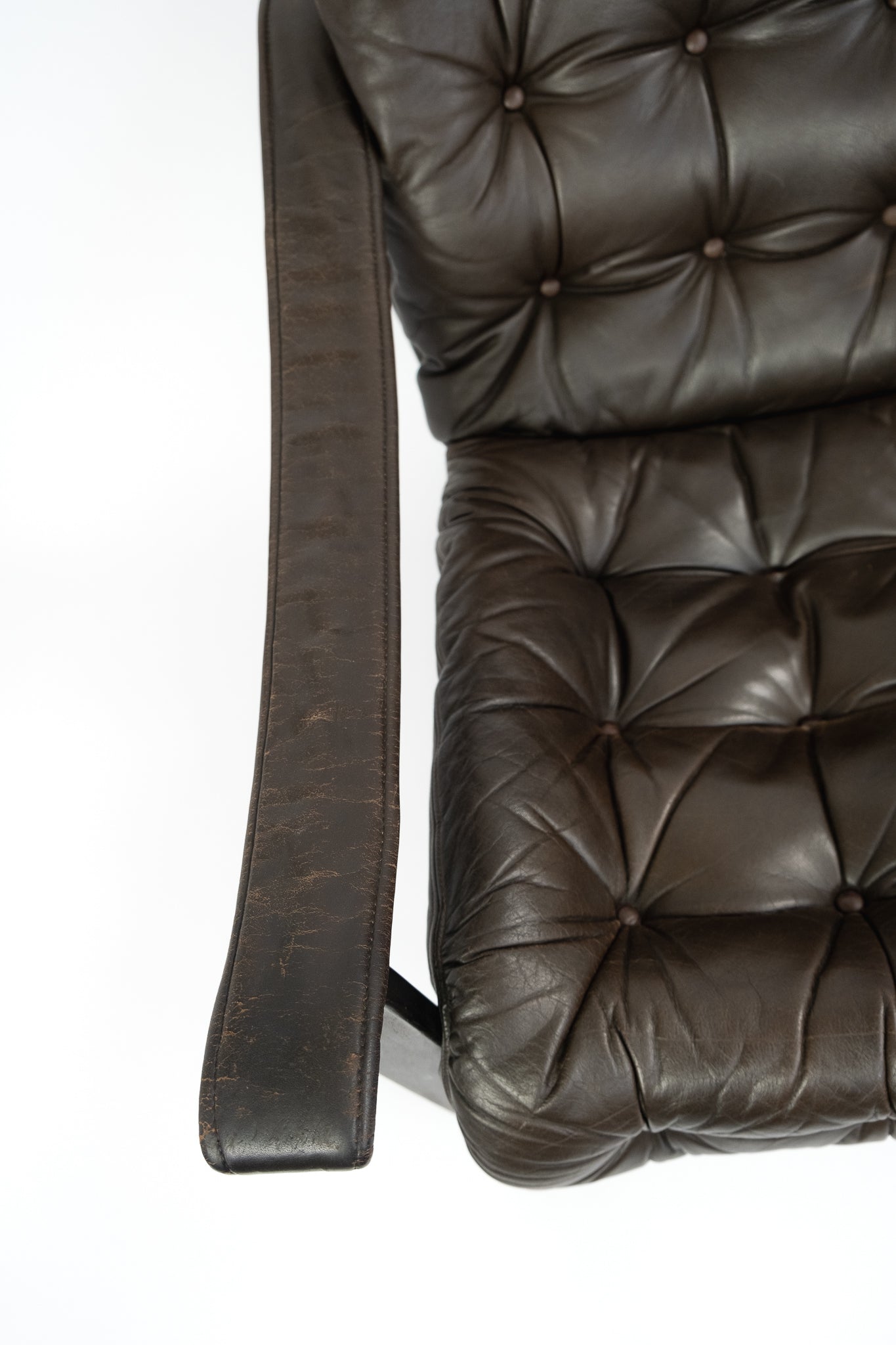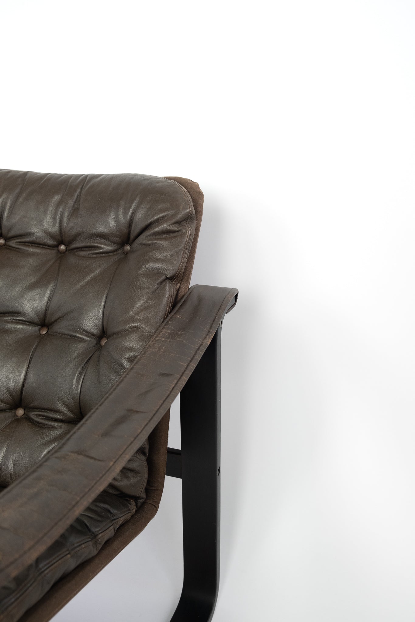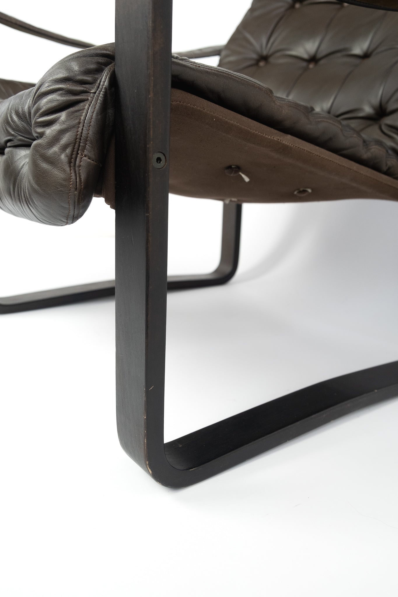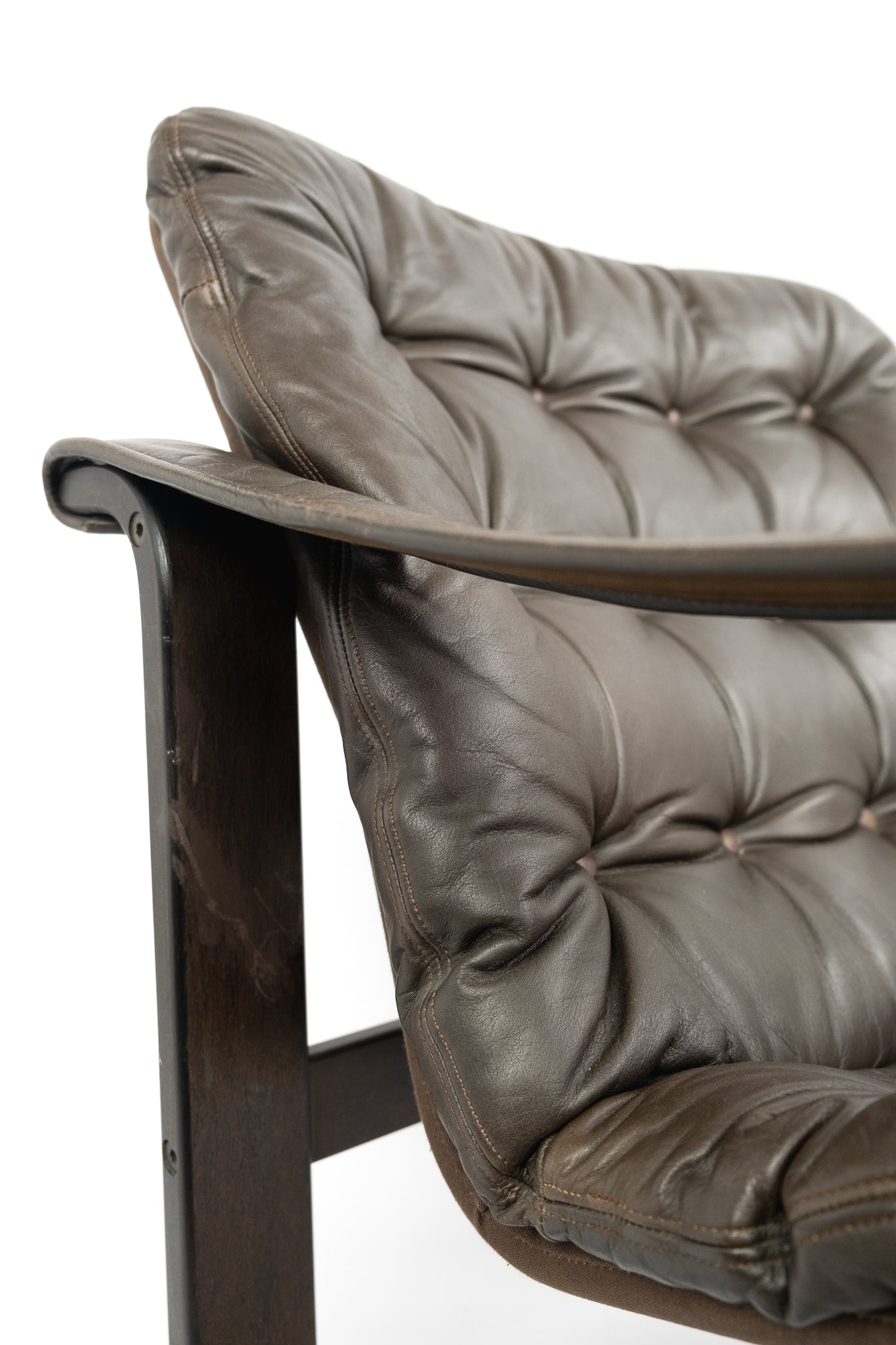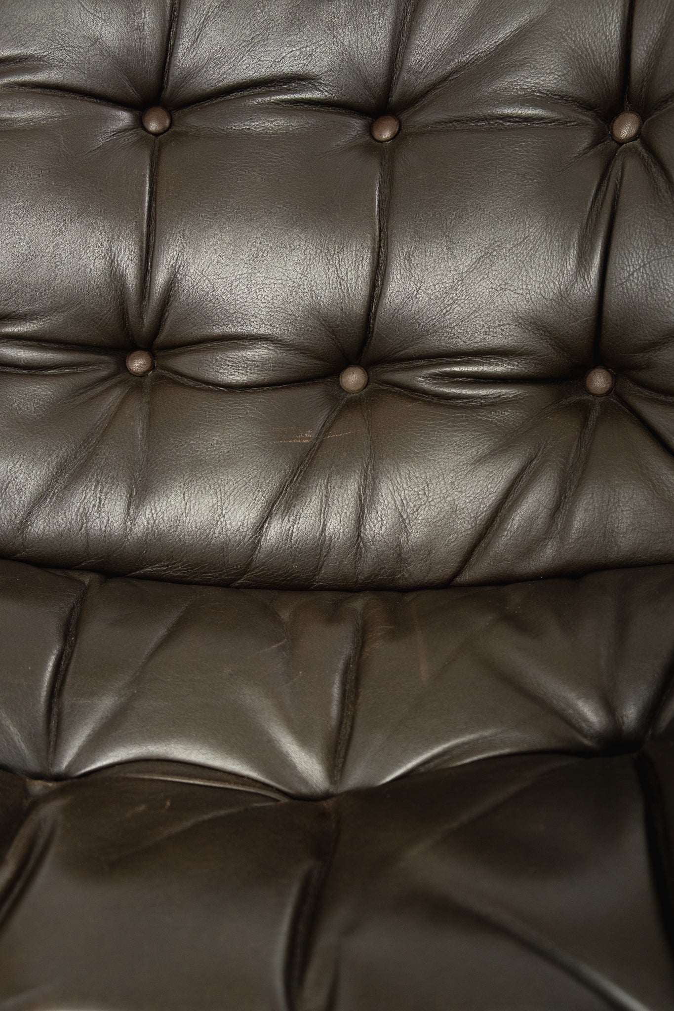 Beautiful midcentury leather 'safari' armchair, designed by OY BJ Dahlqvist for BD Furniture from Finland. This chair from the 1960s is crafted from gorgeous dark brown wood with a fabric seat and fixed cushions of dark brown tufted leather. The chair is still in very good, original condition with only minor signs of use.