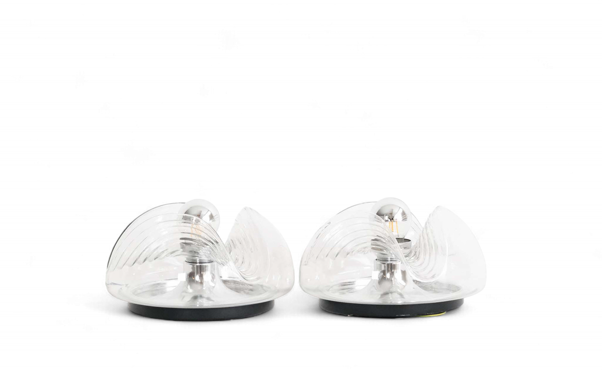 These stunning wall or ceiling lamps were made by Peill & Putzler in the 1970s. Known as the 'Wave' lamps, these space age fixtures beautifully project the pattern of the wavy glass with the help of a mirrored bulb. They are in good vintage condition with appropriate signs of use. Price is per piece, with two lamps available.