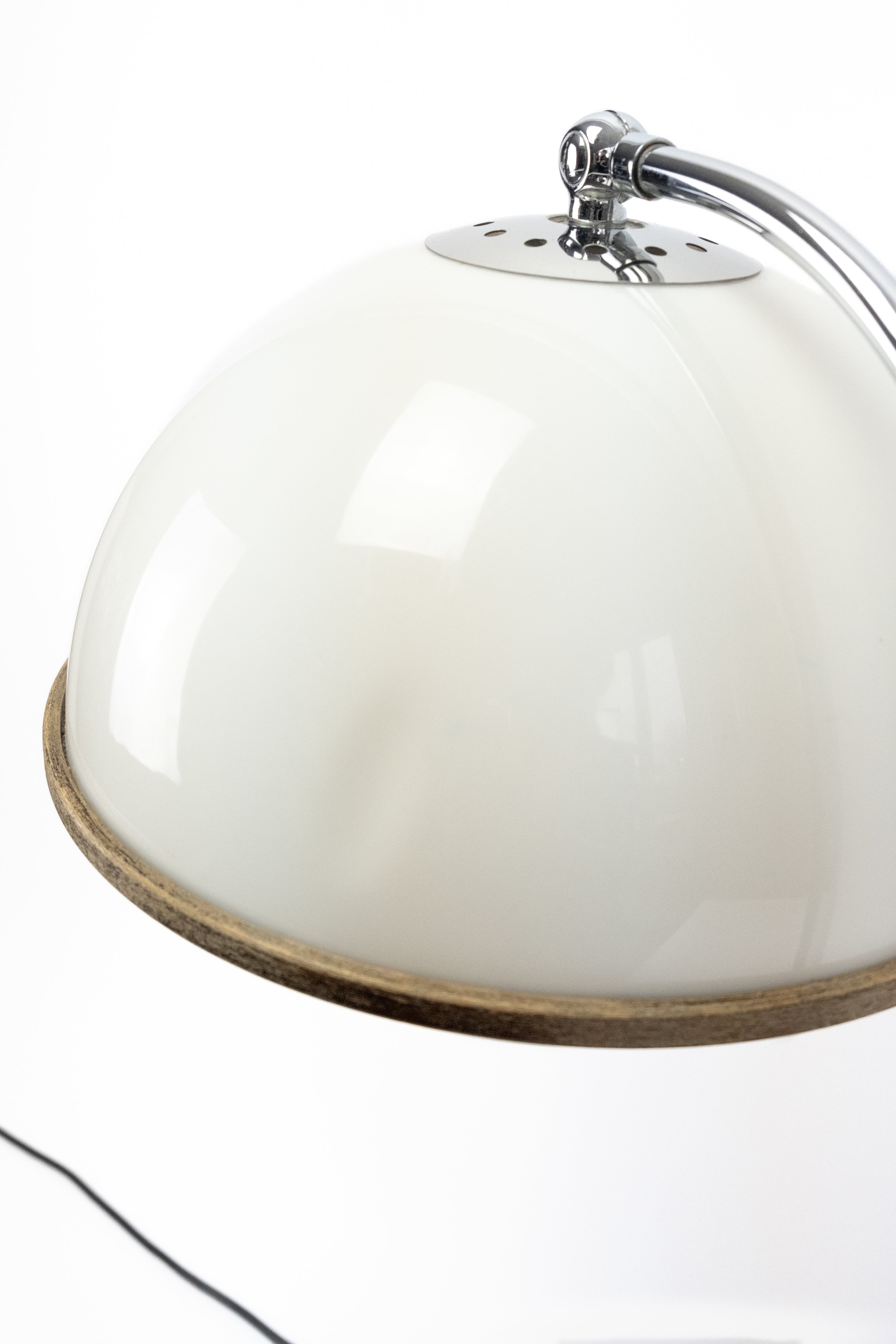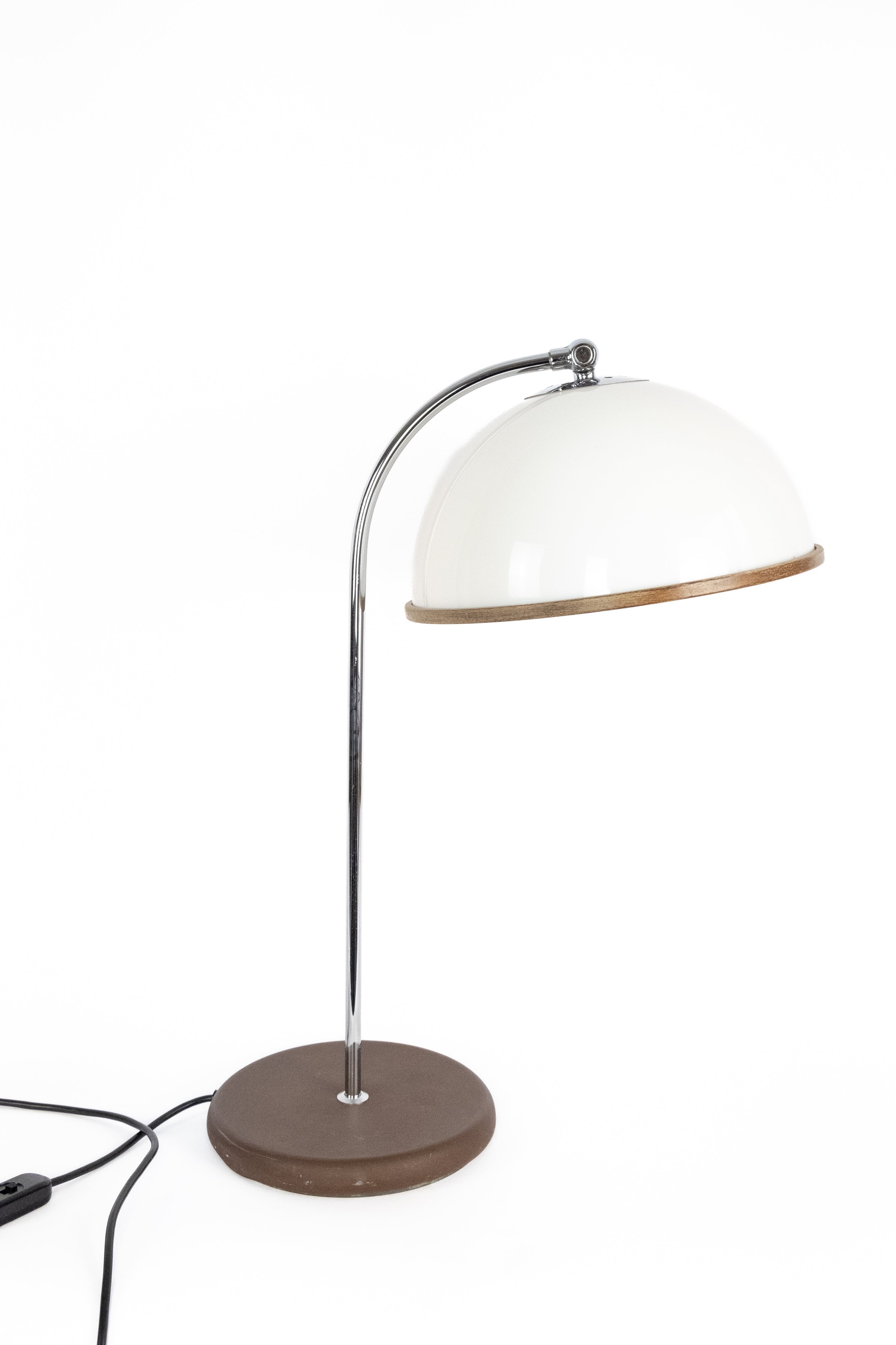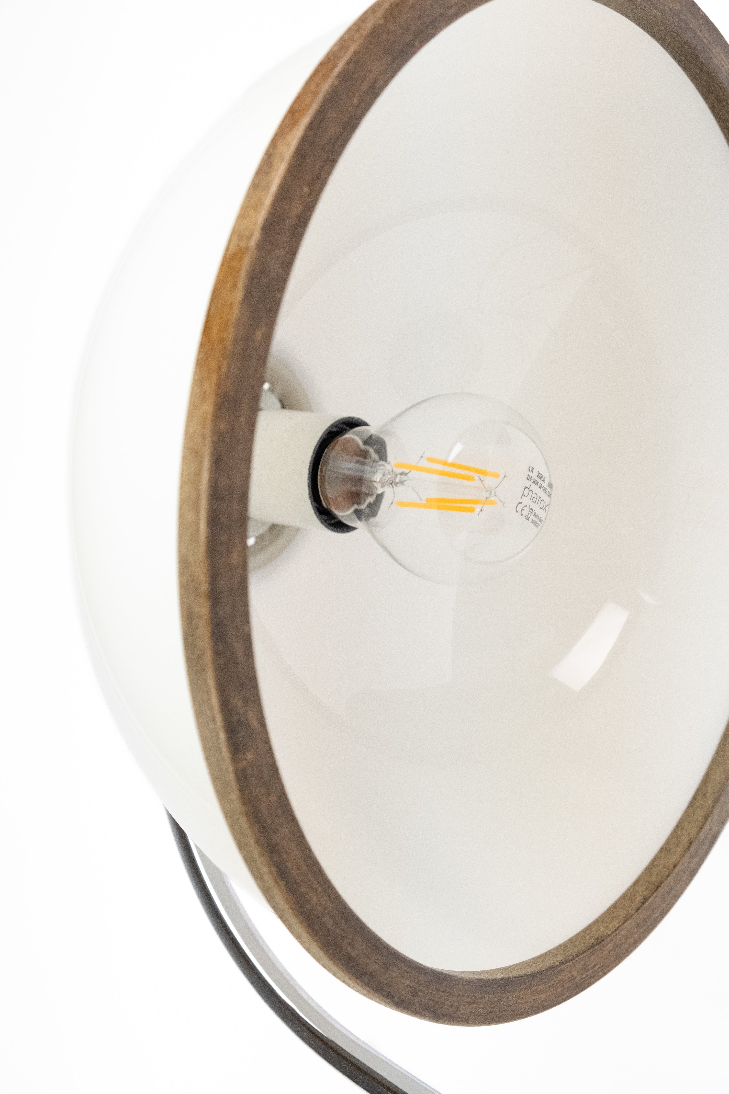 This lamp is perfect for anyone looking for unique lighting in a blend of vintage and retro styles. It features a white plastic shade with a wooden rim and a brown steel base. The lamp shows signs of use and has a small dent in the shade.