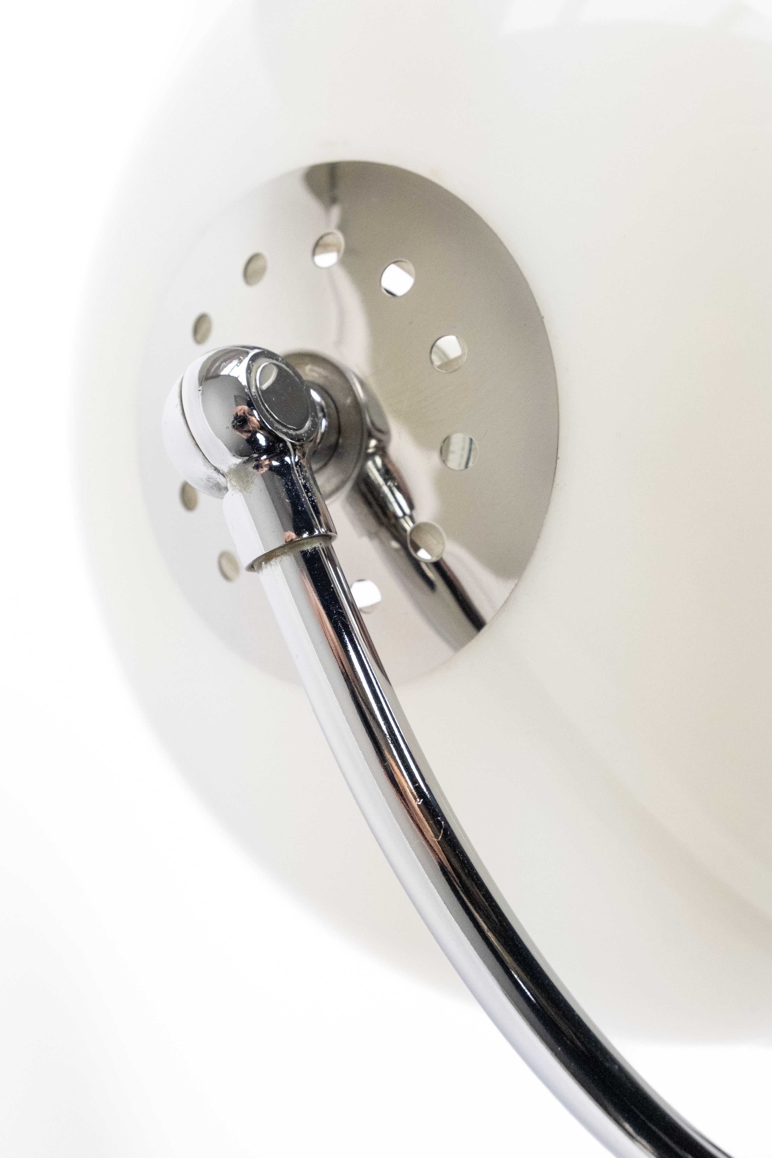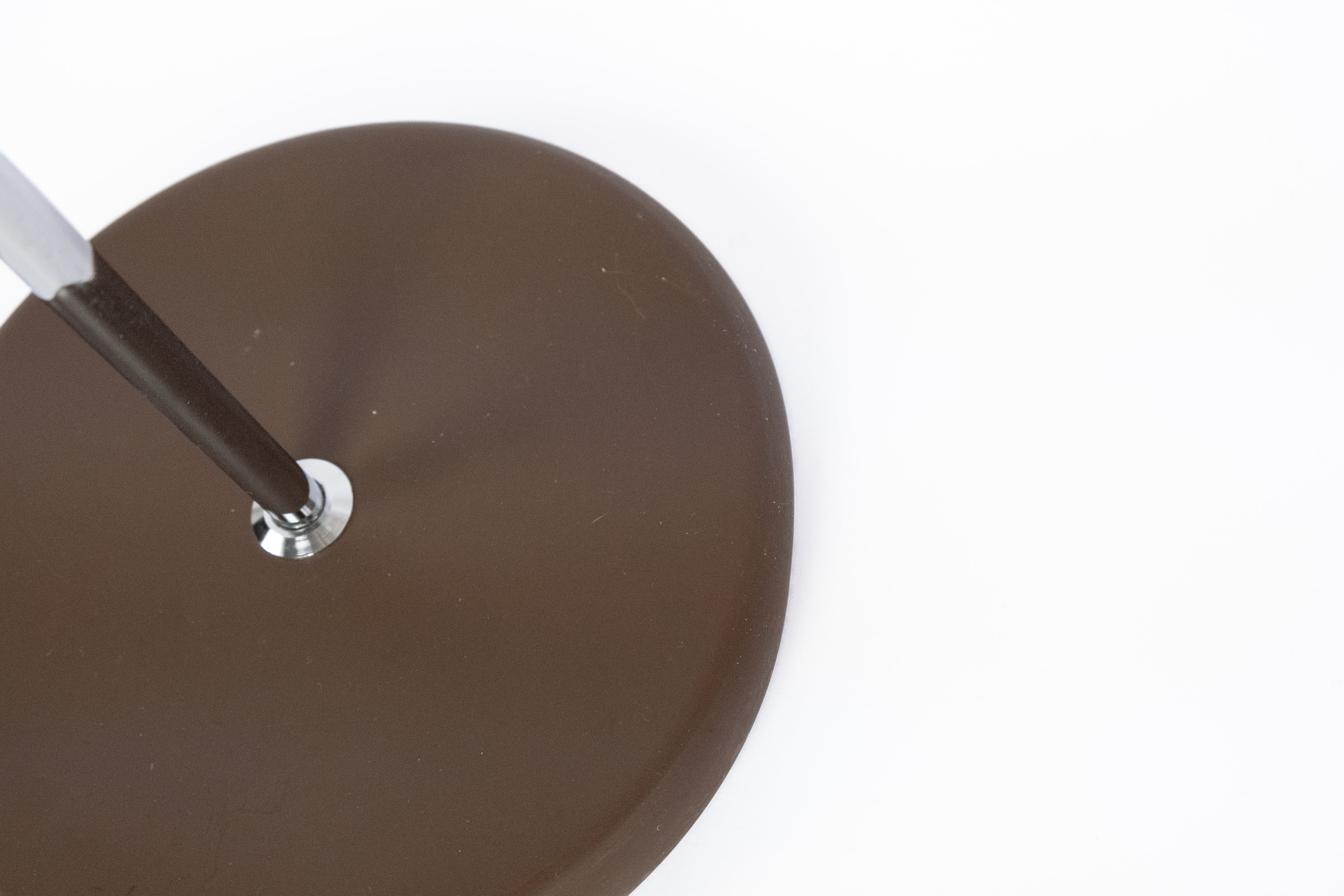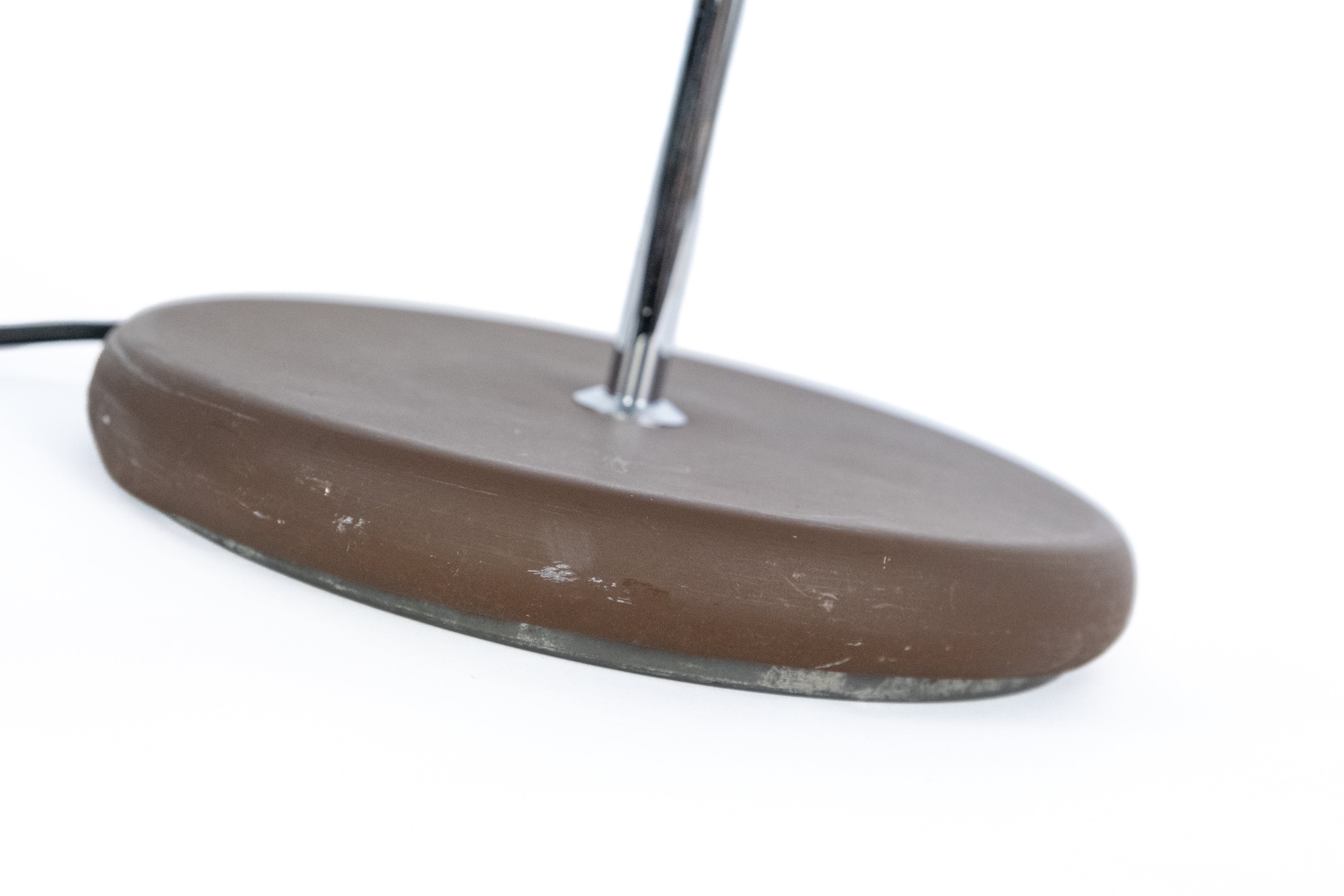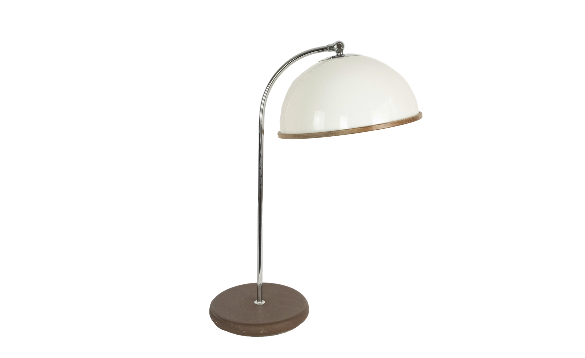 This lamp is perfect for anyone looking for unique lighting in a blend of vintage and retro styles. It features a white plastic shade with a wooden rim and a brown steel base. The lamp shows signs of use and has a small dent in the shade.