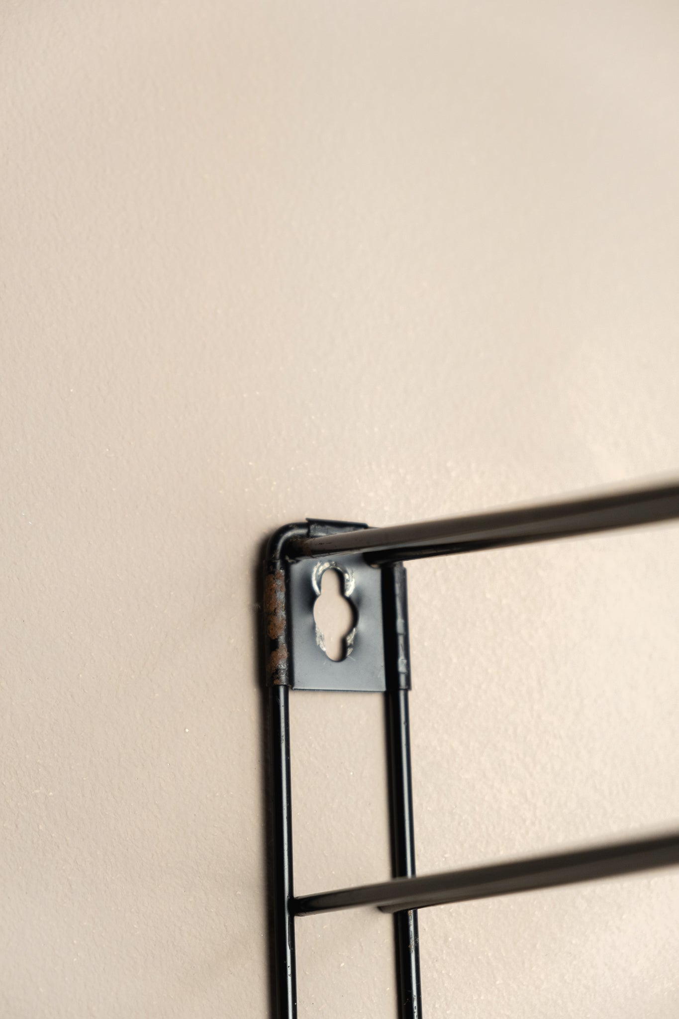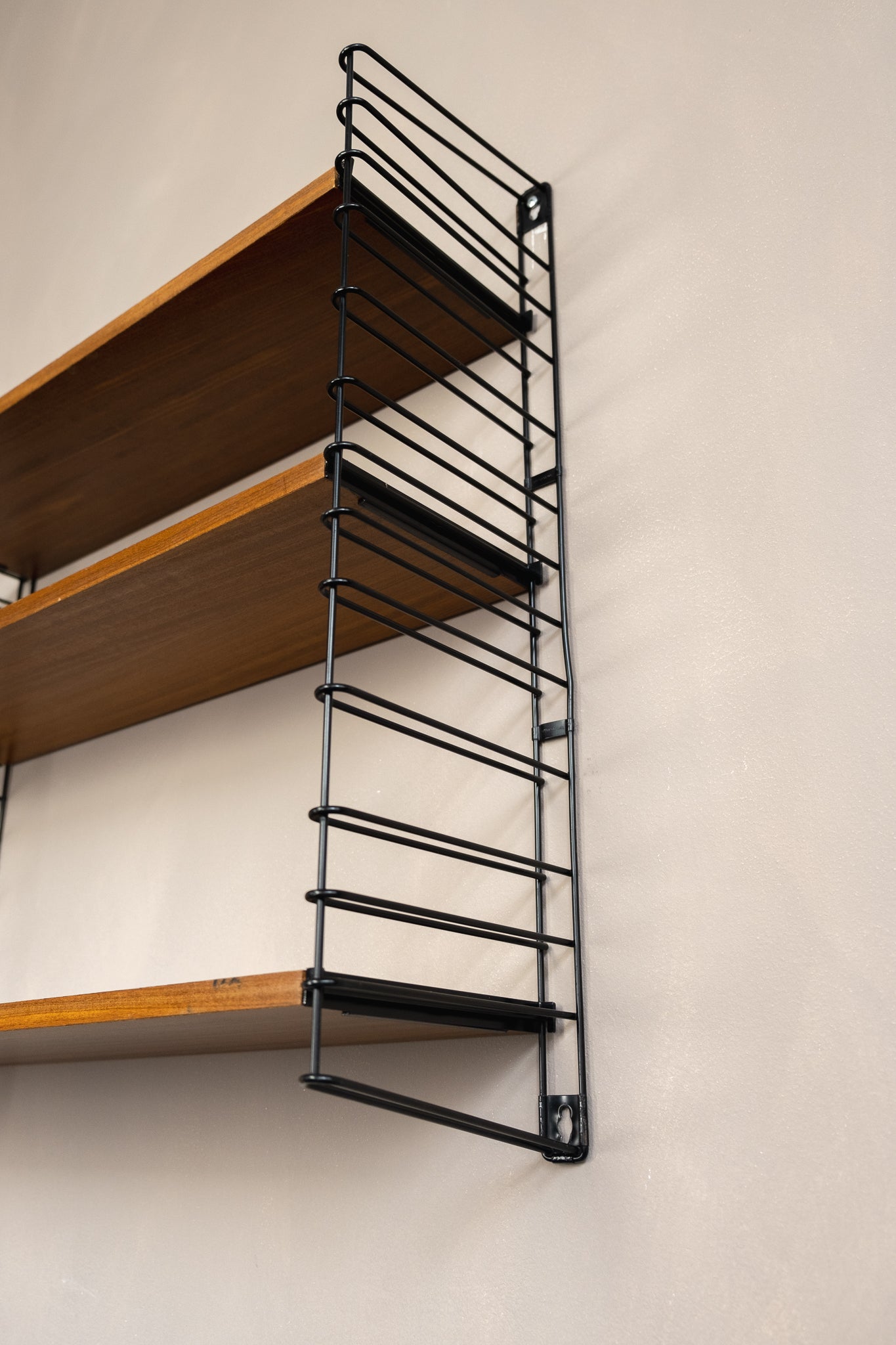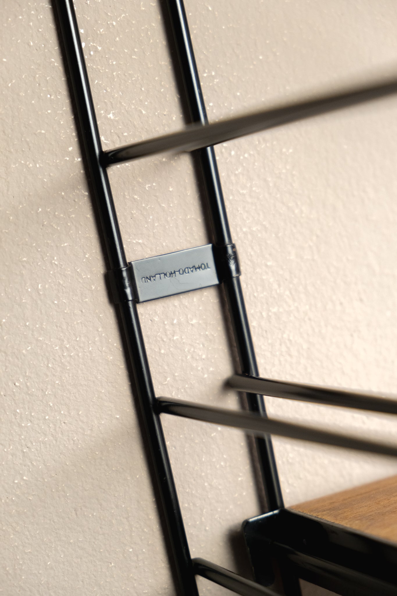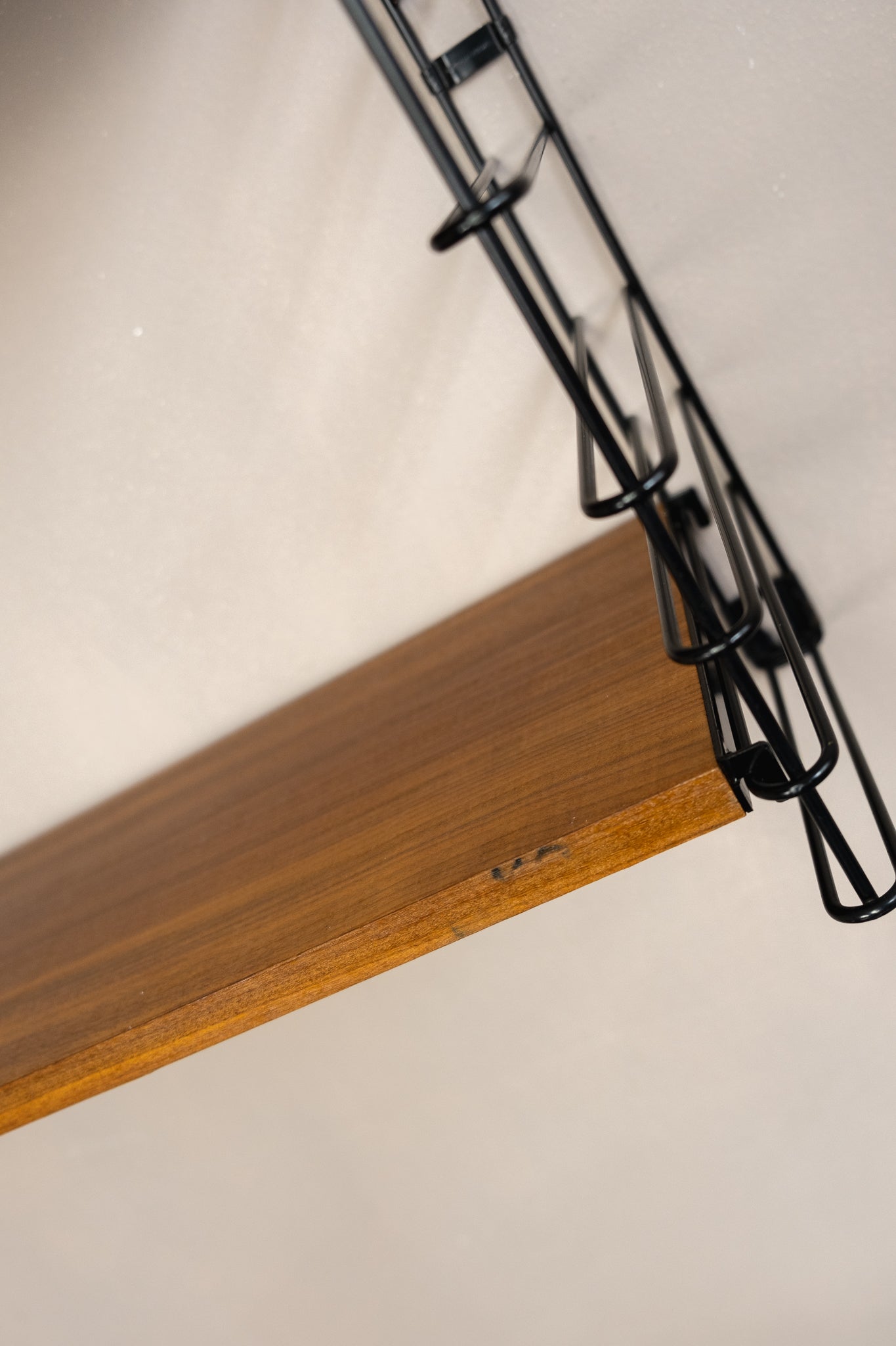 The bookshelf from the Tomado factory (Van der Togts Massa Artikelen from Dordrecht) was highly modern for its time. This wall unit from 1958 is composed of 2 wire mesh sides made of sheet steel, combined with 3 shelves. It is in good vintage condition.