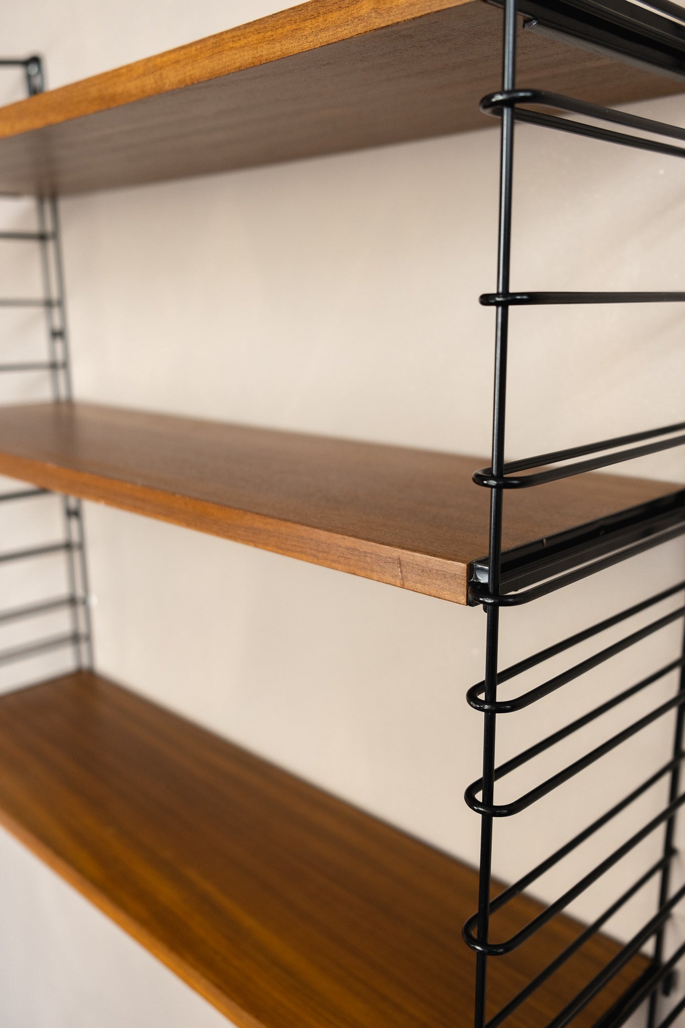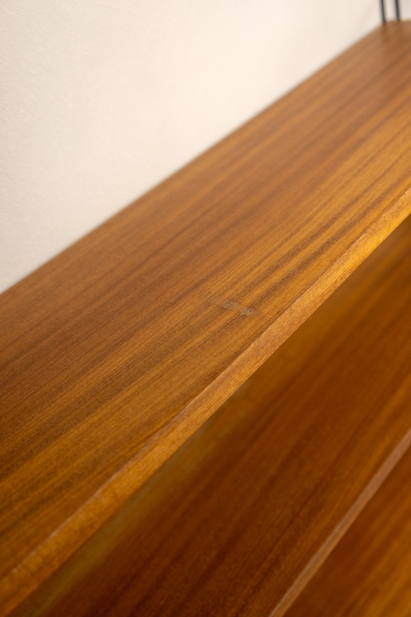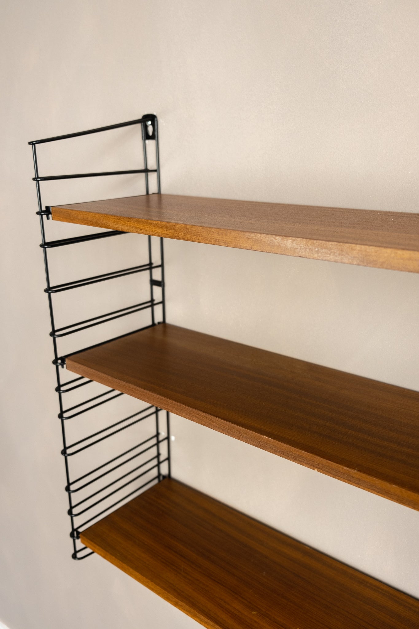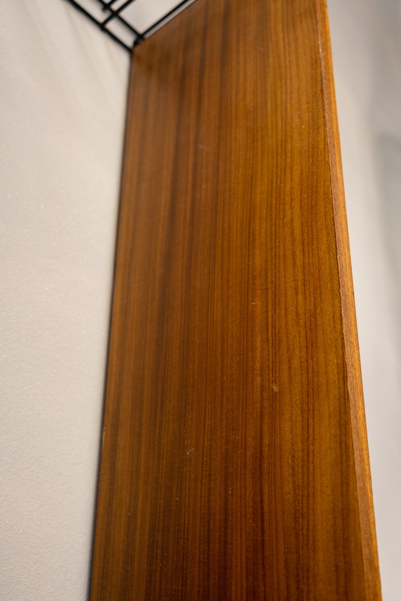 The bookshelf from the Tomado factory (Van der Togts Massa Artikelen from Dordrecht) was highly modern for its time. This wall unit from 1958 is composed of 2 wire mesh sides made of sheet steel, combined with 3 shelves. It is in good vintage condition.