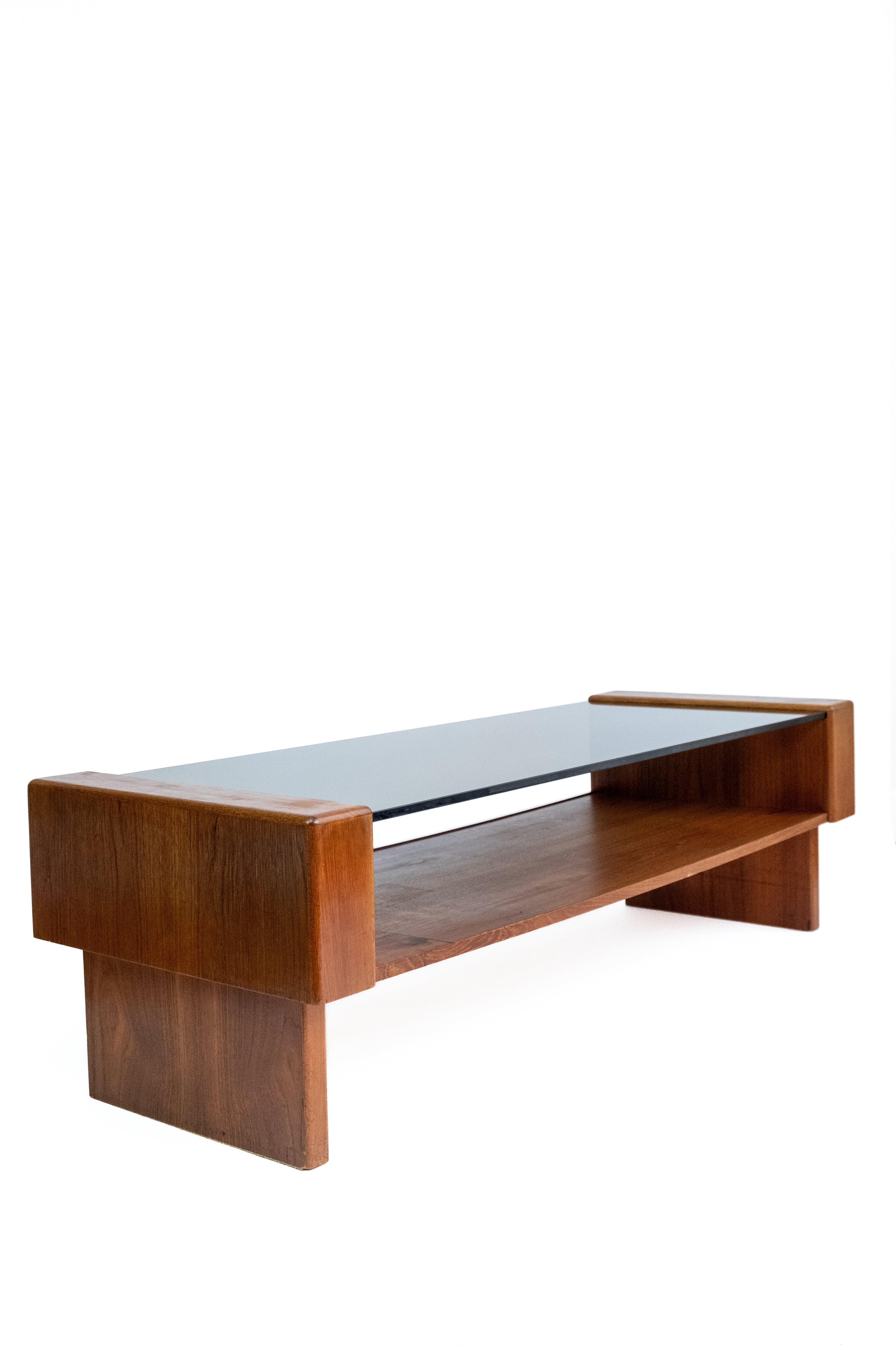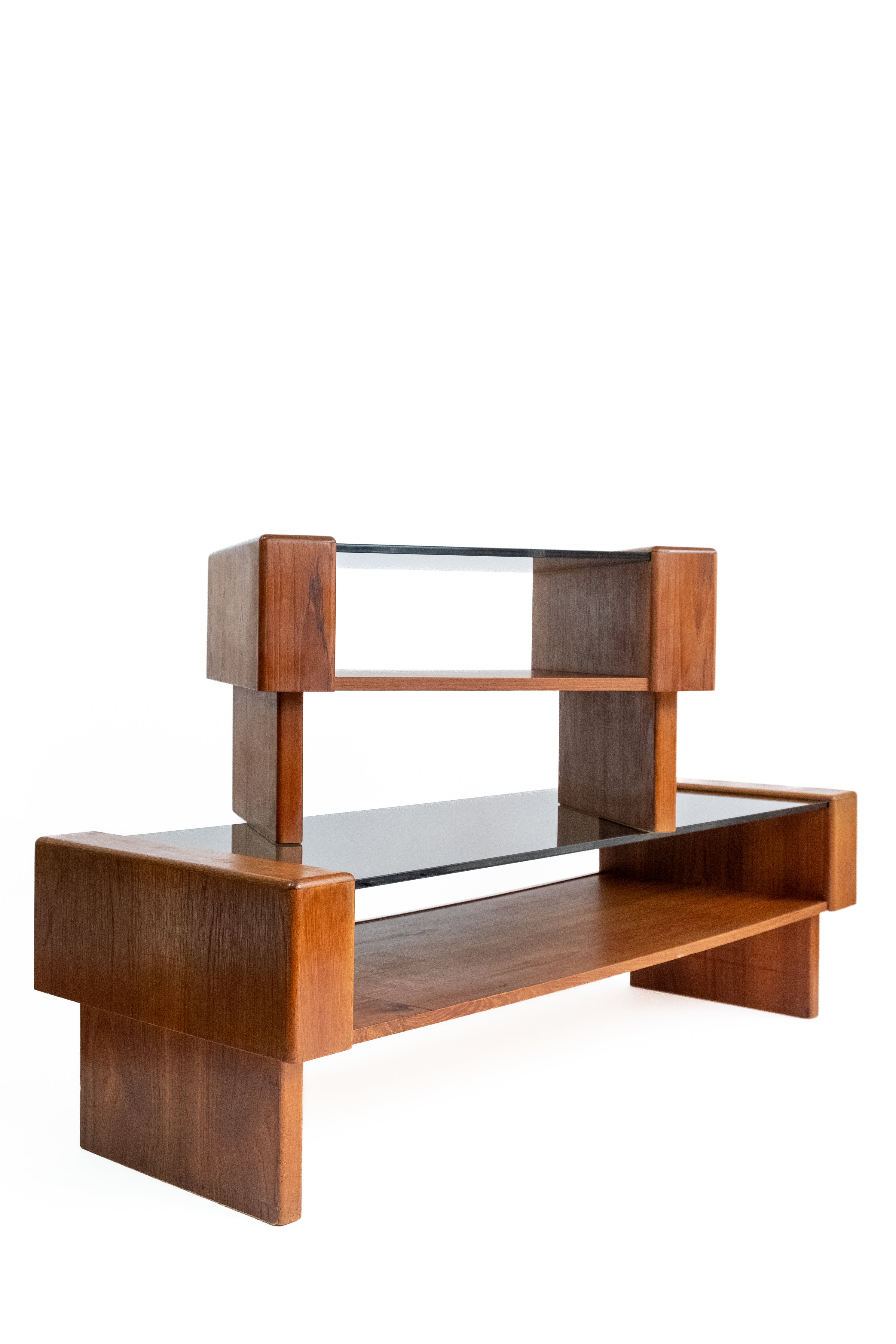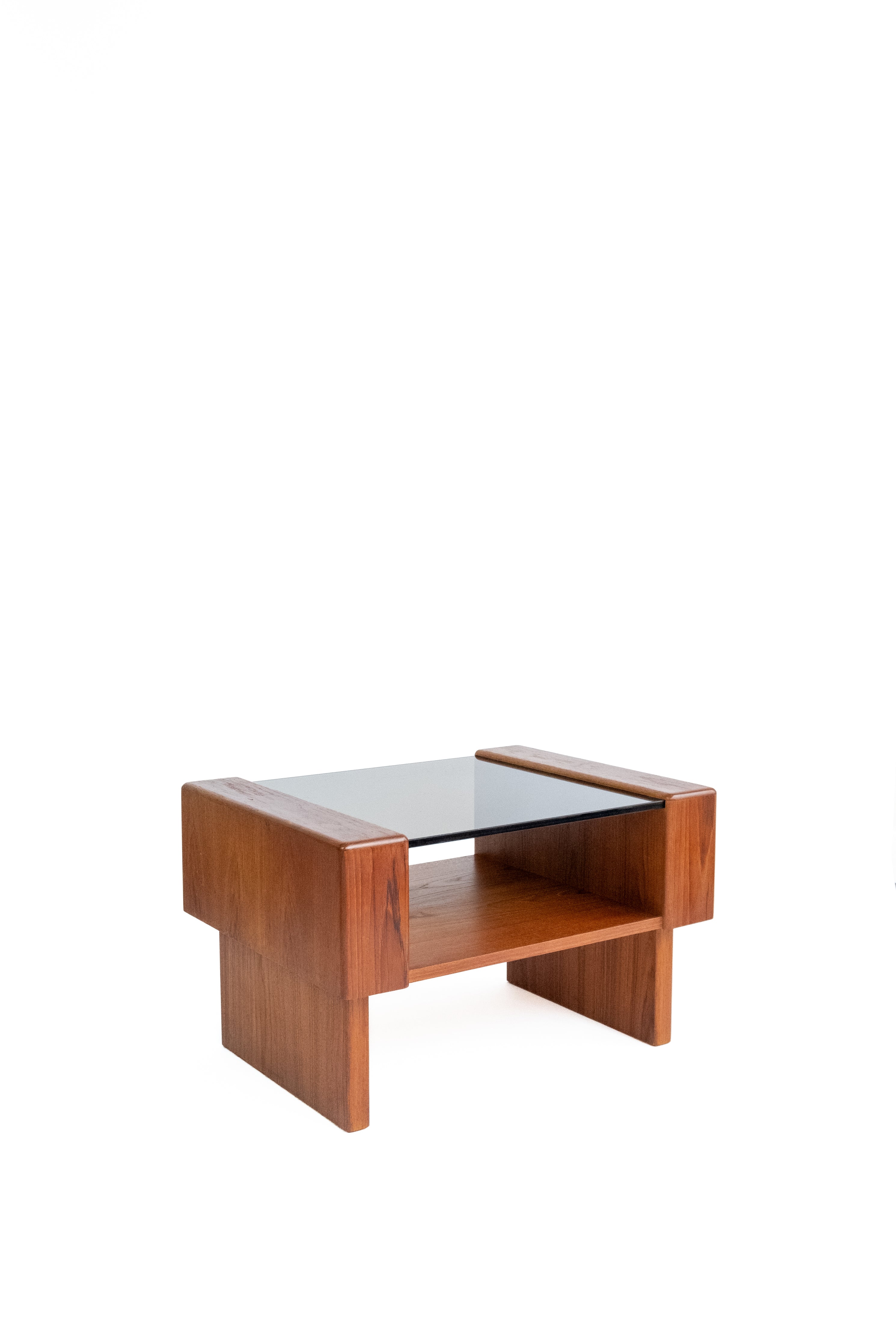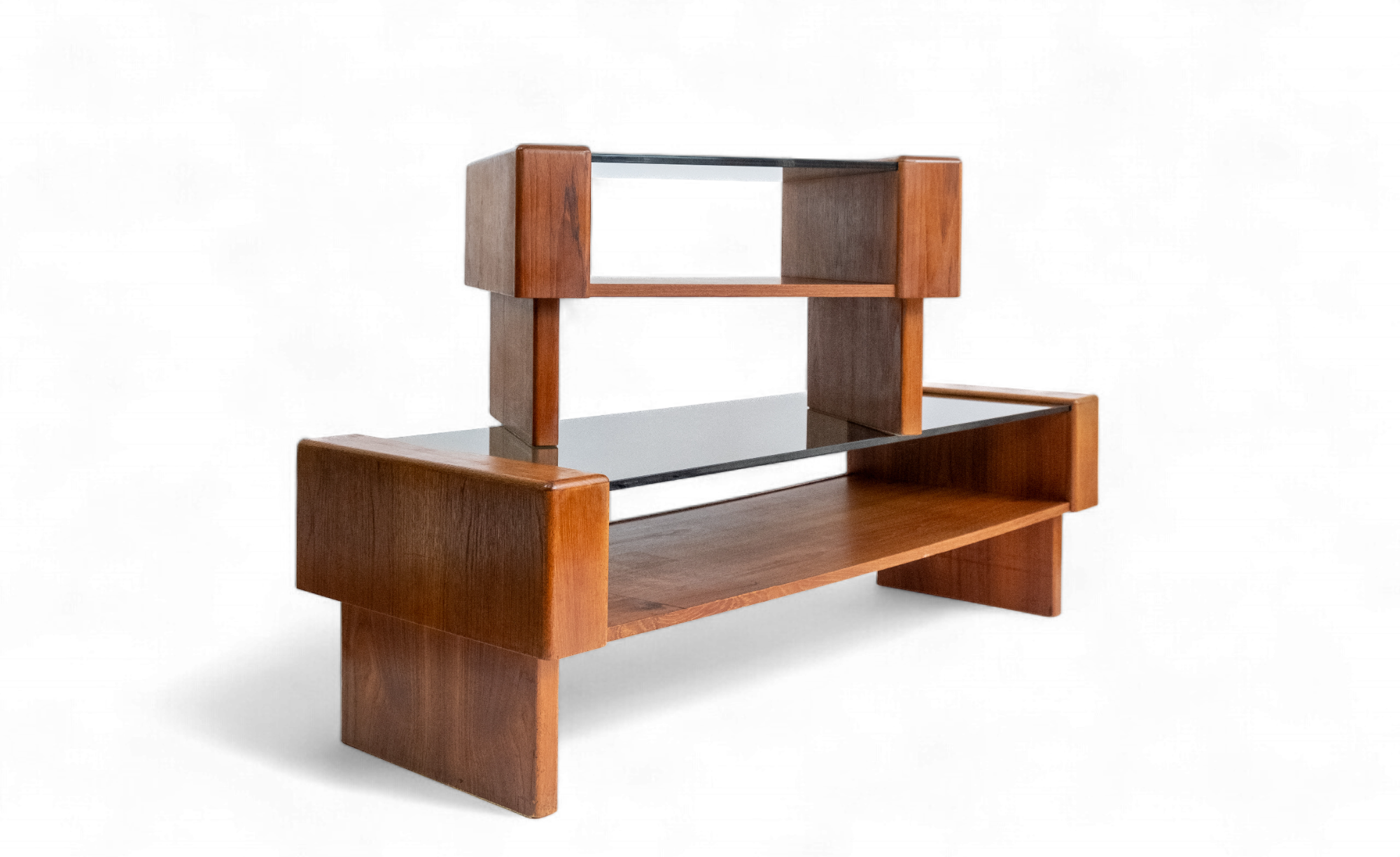 These teak tables from RS Associate Toronto are rugged and sleek in design. They feature rounded corners and smoked glass tops. You can store magazines and books underneath the wooden shelf.
