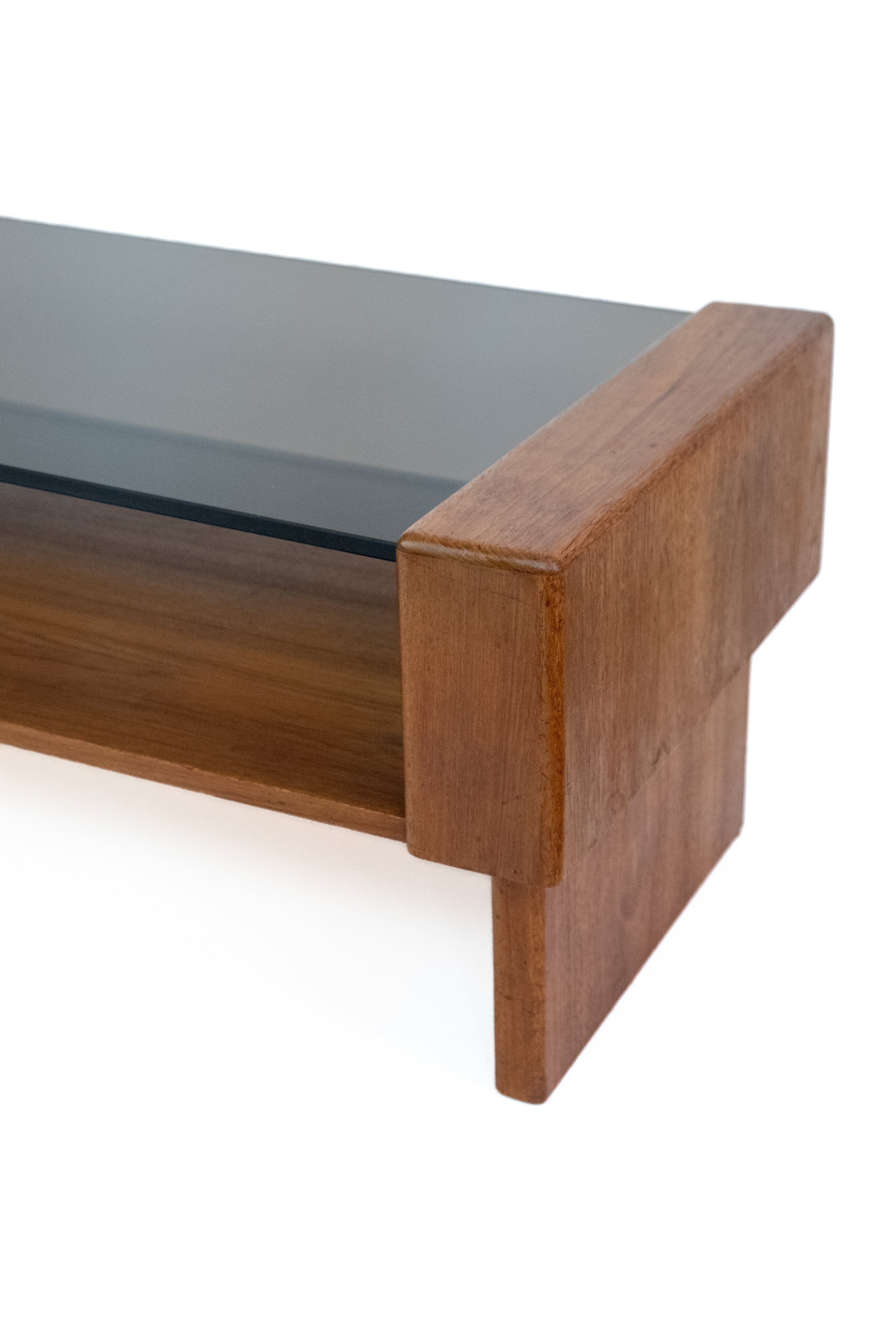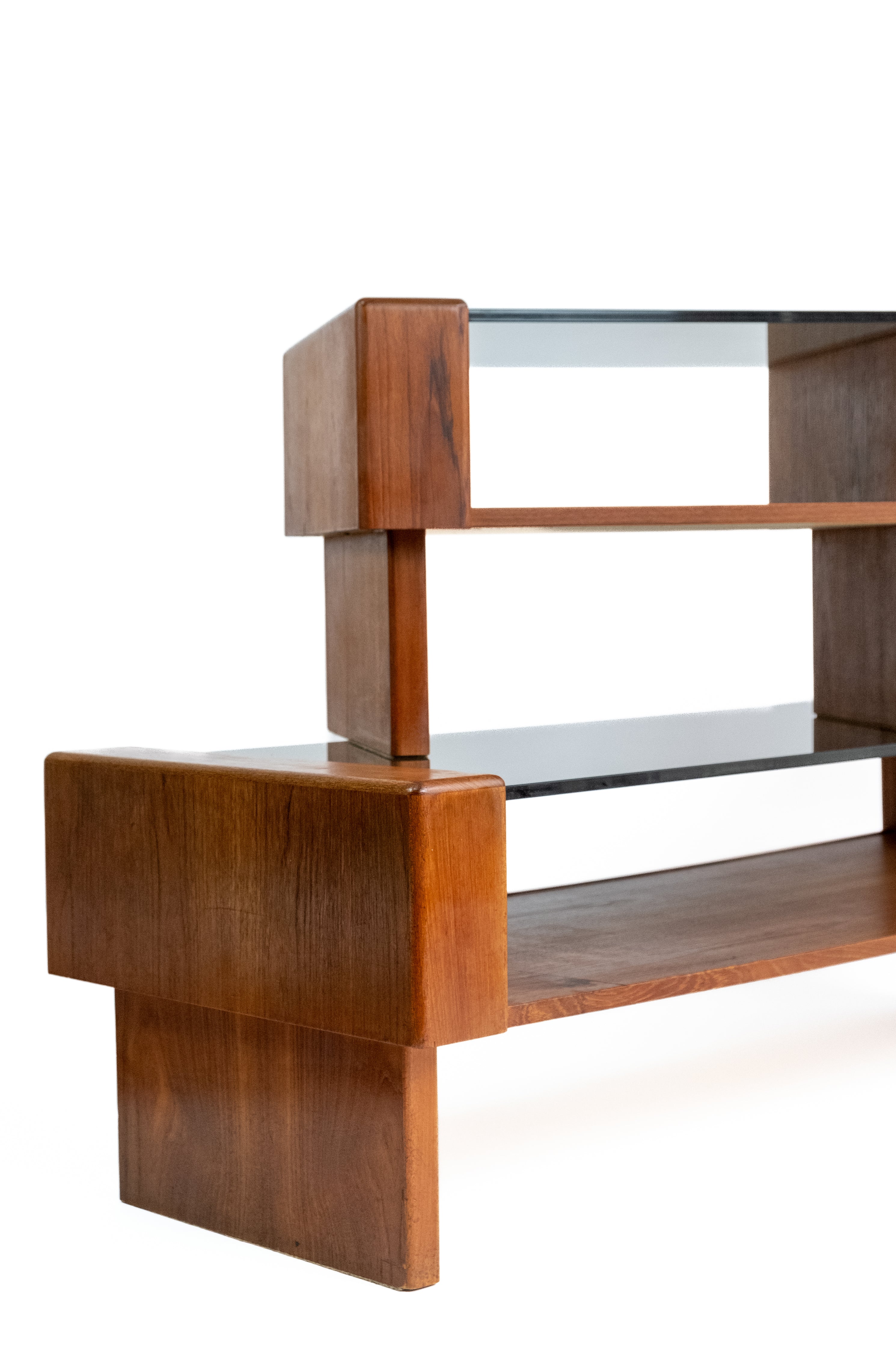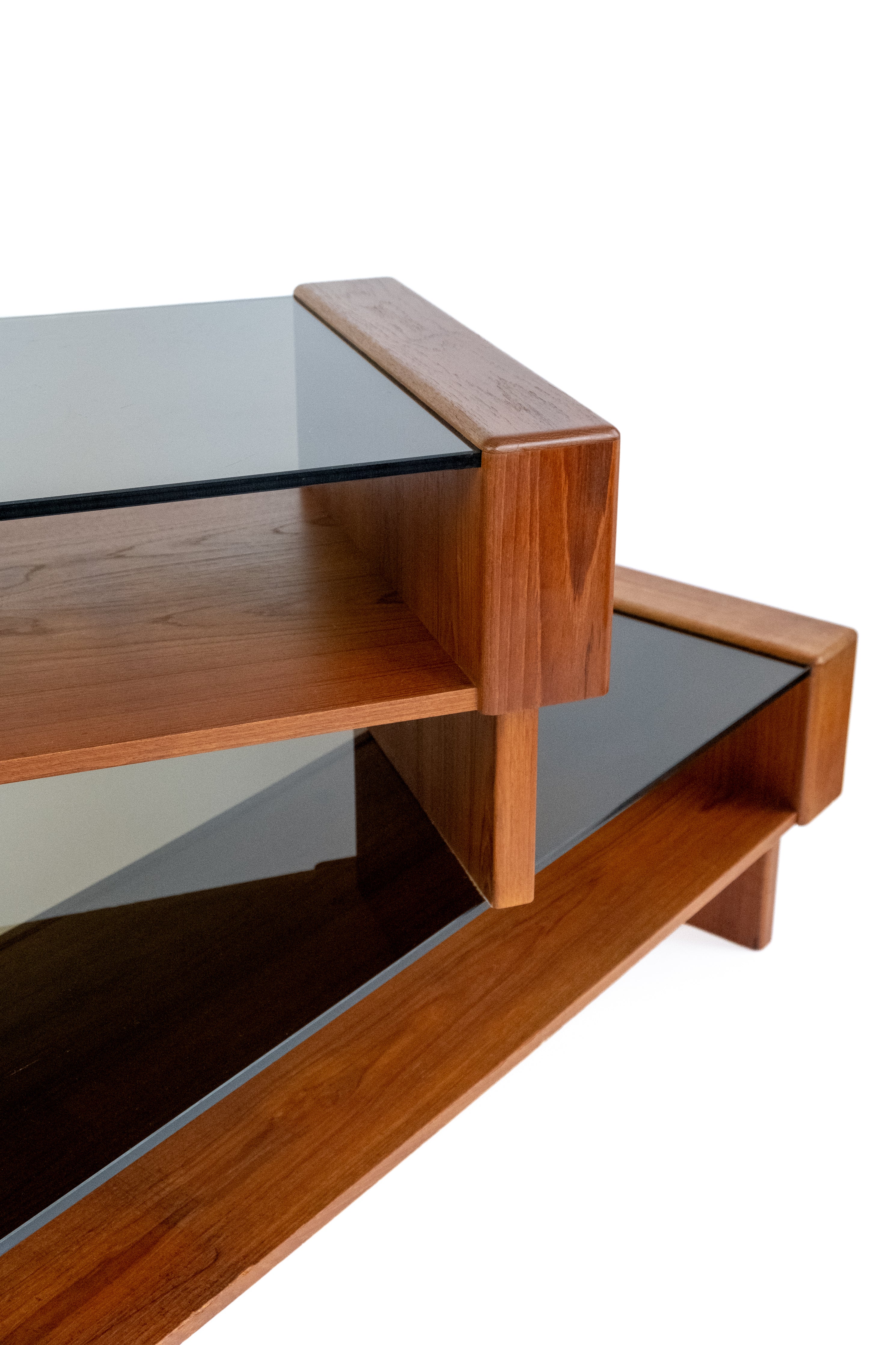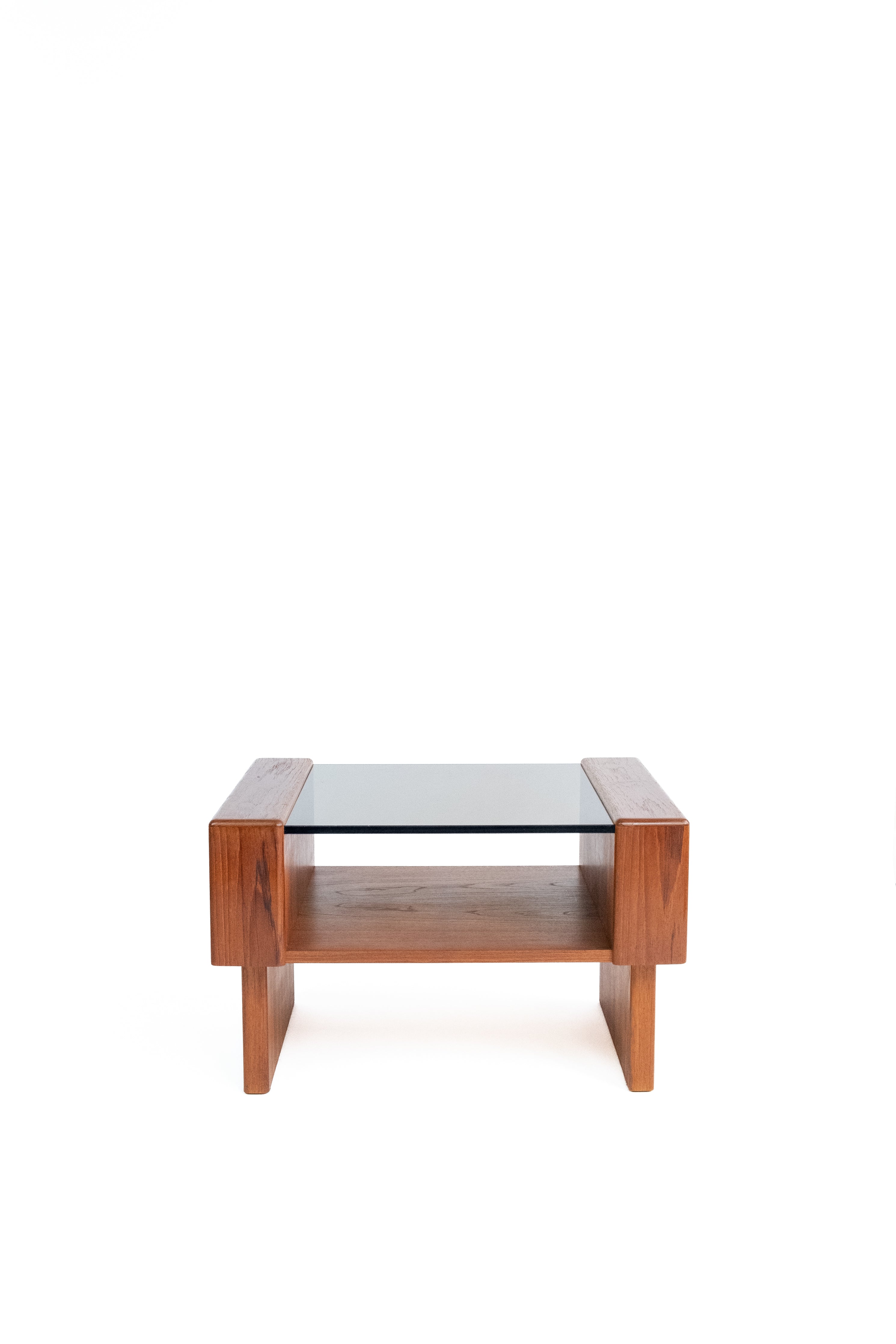 These teak tables from RS Associate Toronto are rugged and sleek in design. They feature rounded corners and smoked glass tops. You can store magazines and books underneath the wooden shelf.