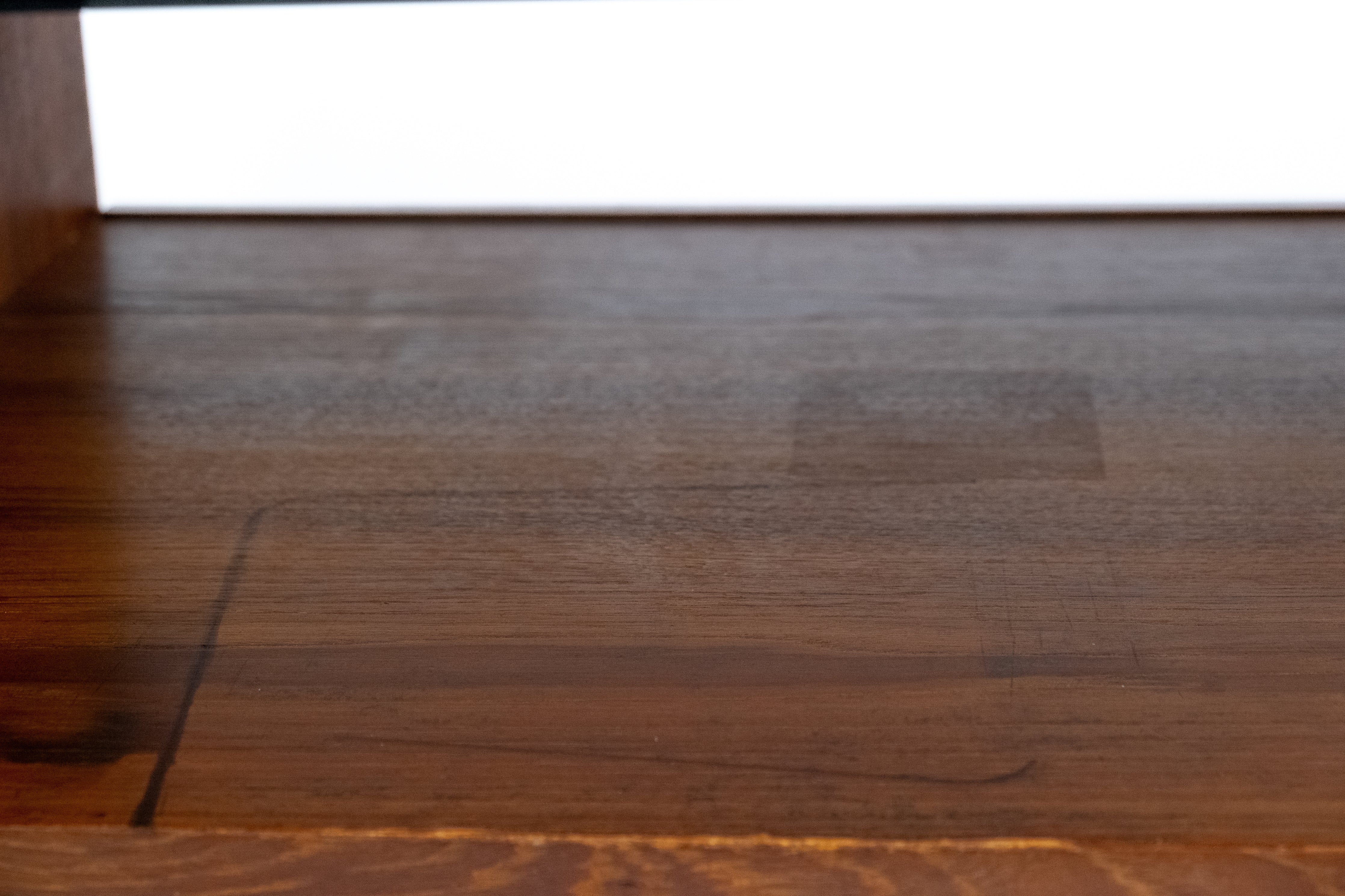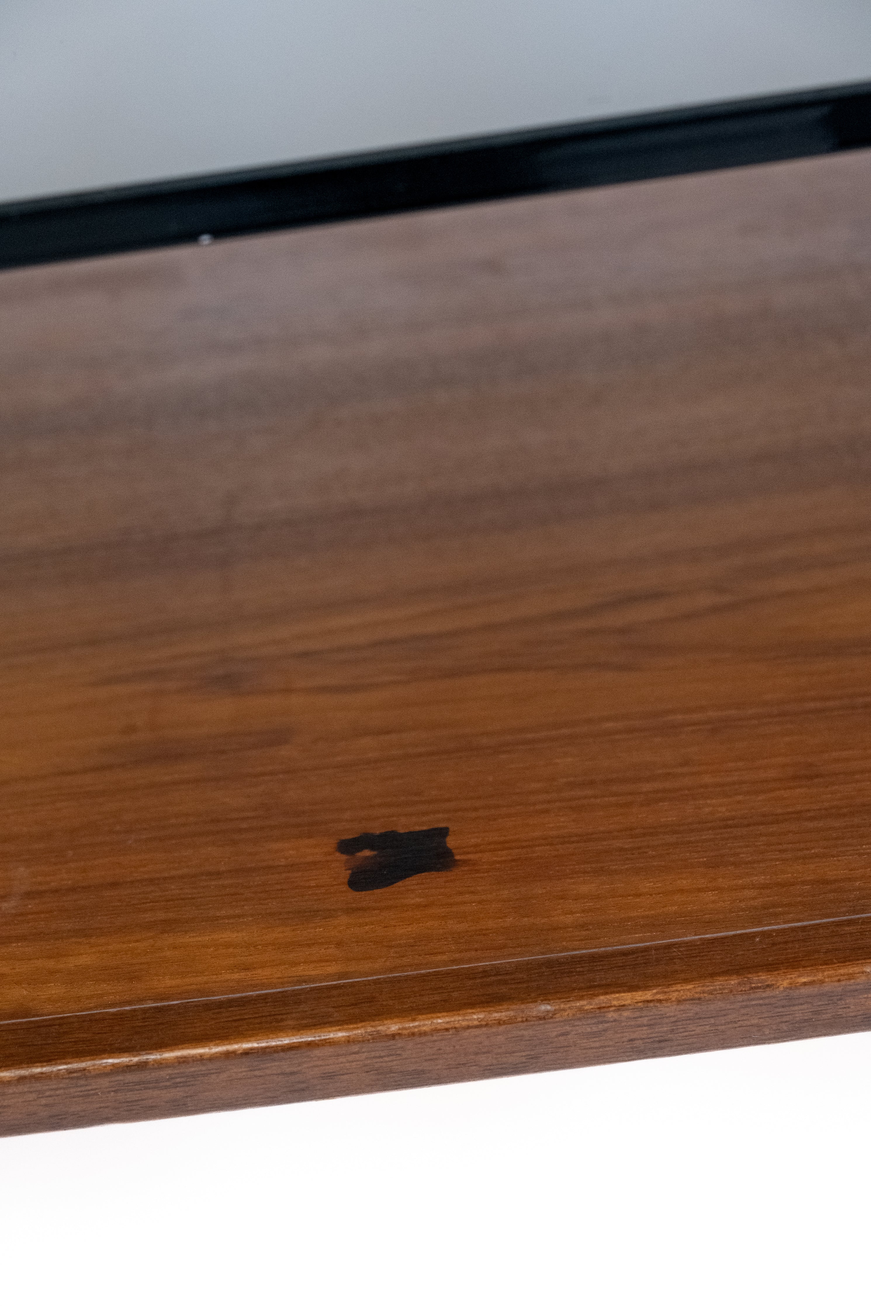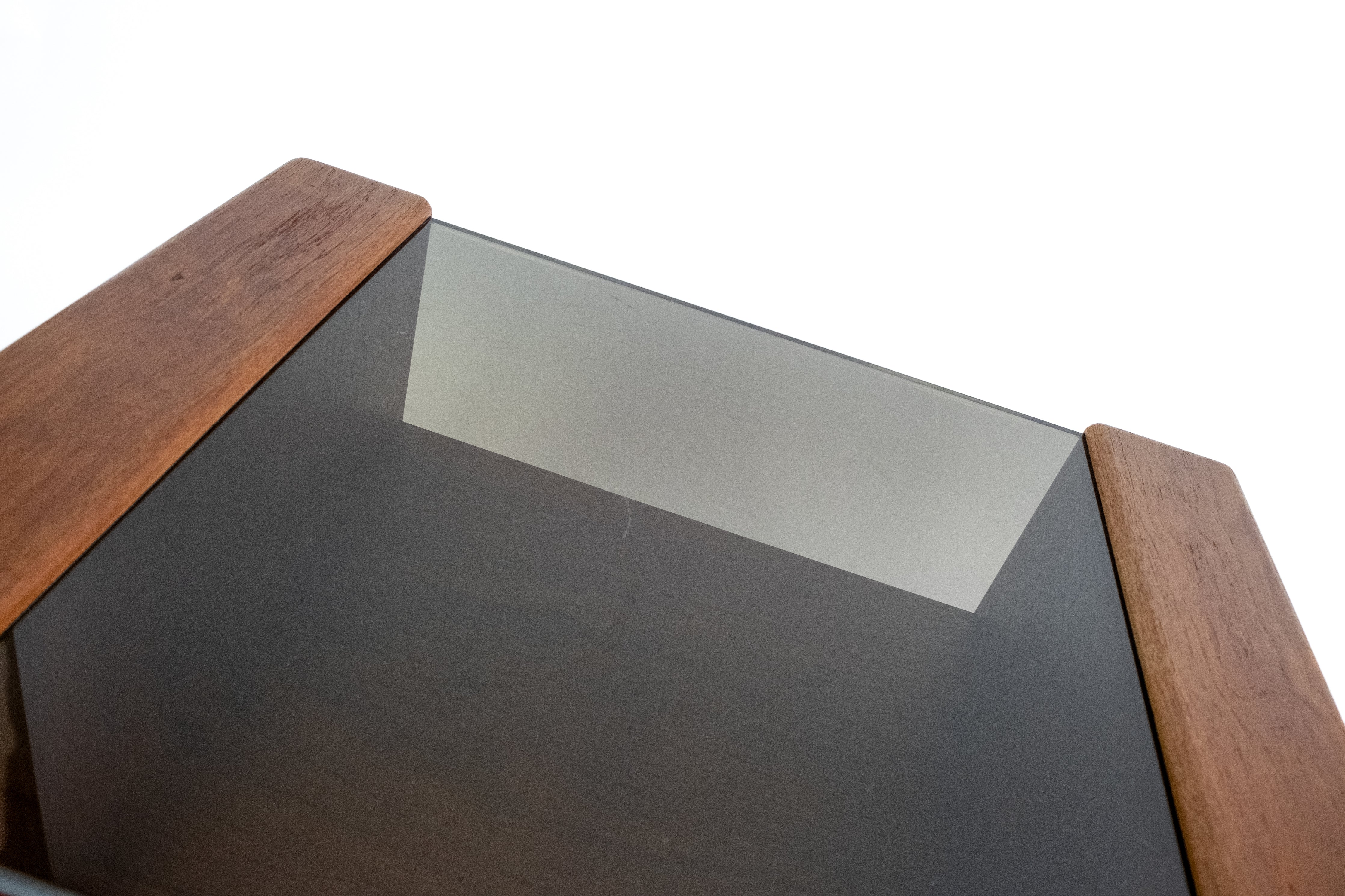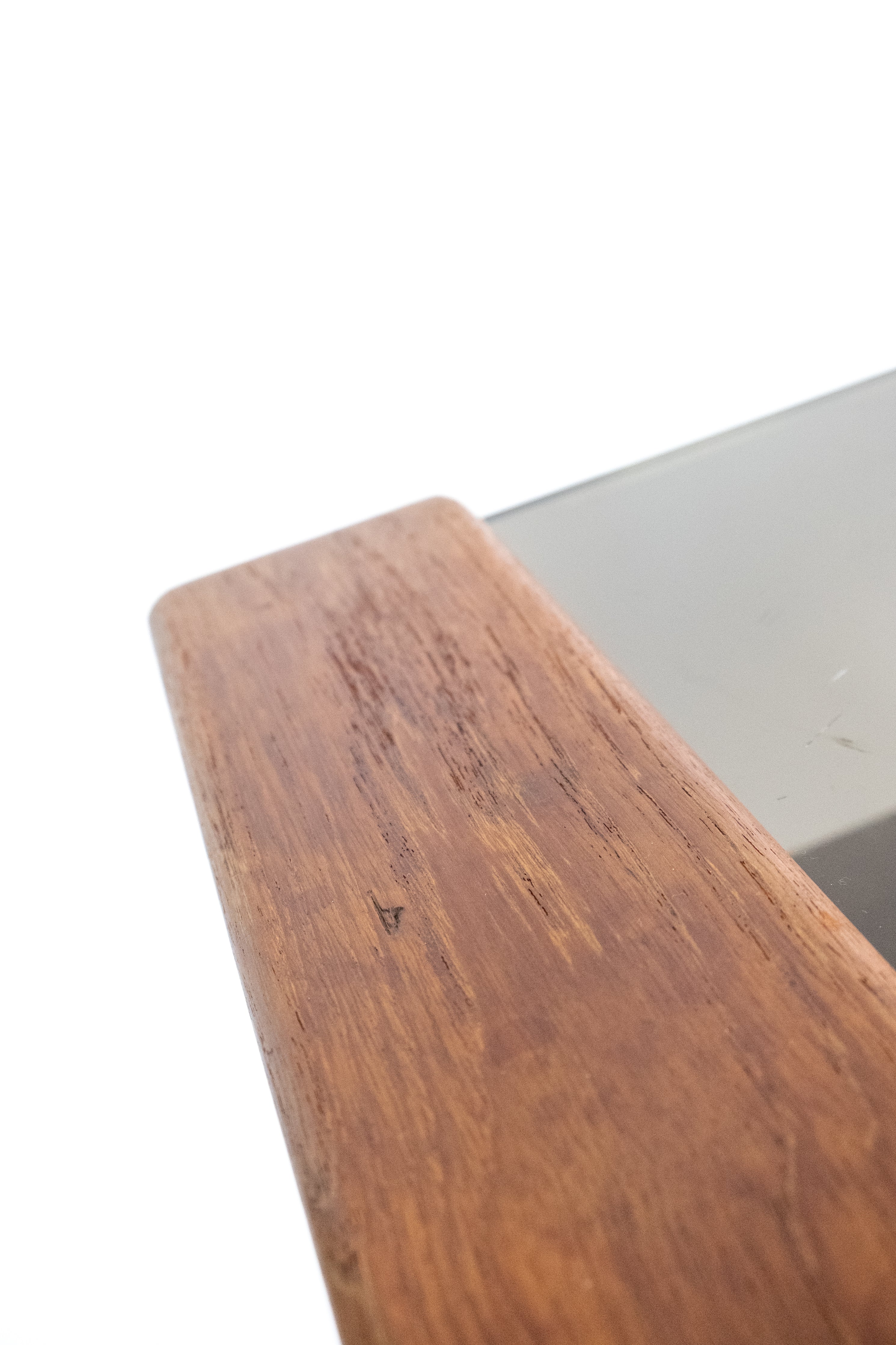 Condition: Small table: Scratches on the glass and some scratches on the wooden side. Large table: 2 small chips on the glass, dark stain and streaks on the wooden top, and an additional strip on one side of the wooden top.