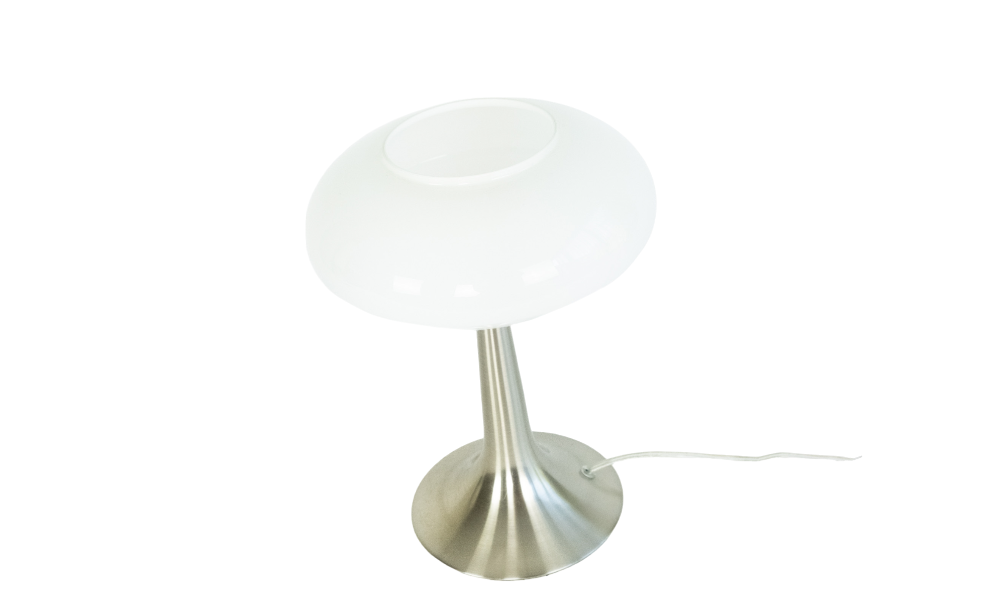 This stylish lamp features a chrome base and a milk glass shade in a UFO-like shape. The top of the lamp is open, allowing for a beautiful diffusion of light. The cord is transparent and equipped with a switch.