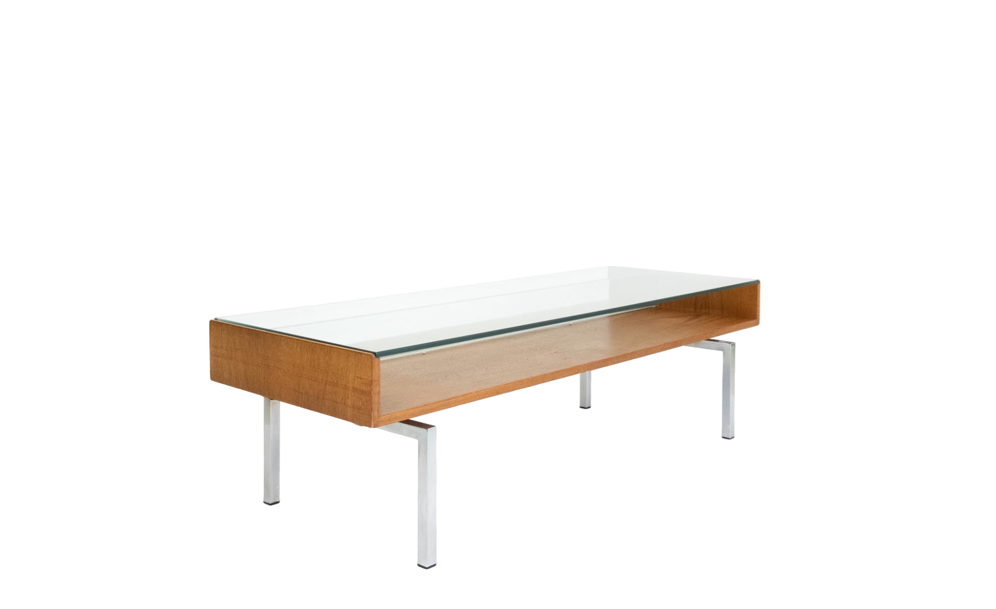 A charming coffee table from the 1970s in Mid Century modern style. This sleekly designed table features chrome legs, a teak veneer top, and a 1 cm thick glass shelf. The table shows signs of wear consistent with its age, and the caps under the glass have been replaced.