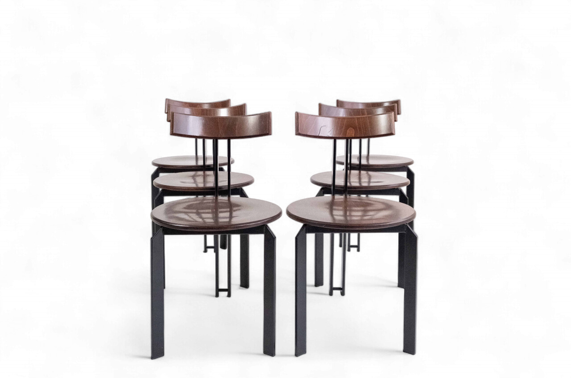 A beautiful and timeless design by Martin Haksteen for Harvink. The 'Zeta' features a black metal frame with three legs and a lovely reddish-brown seat and curved backrest, typical of 1980s design. The set of 6 chairs is in good vintage condition with associated signs of use.