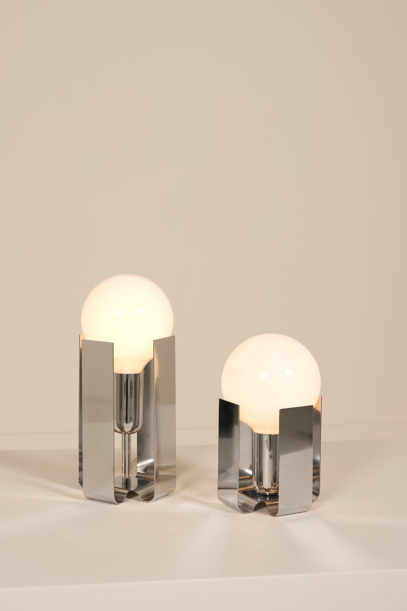 Biglia table lamps by Claudio Salocchi for Lumenform are standout pieces of 1970s Italian design. Designed in 1971, these lamps feature a minimalist yet sculptural profile with interconnected chrome‑plated metal elements and a refined glow from the integrated lamp holder. Their sleek form and precise engineering reflect Salocchi’s architectural approach to lighting design, making them both elegant and collectible.