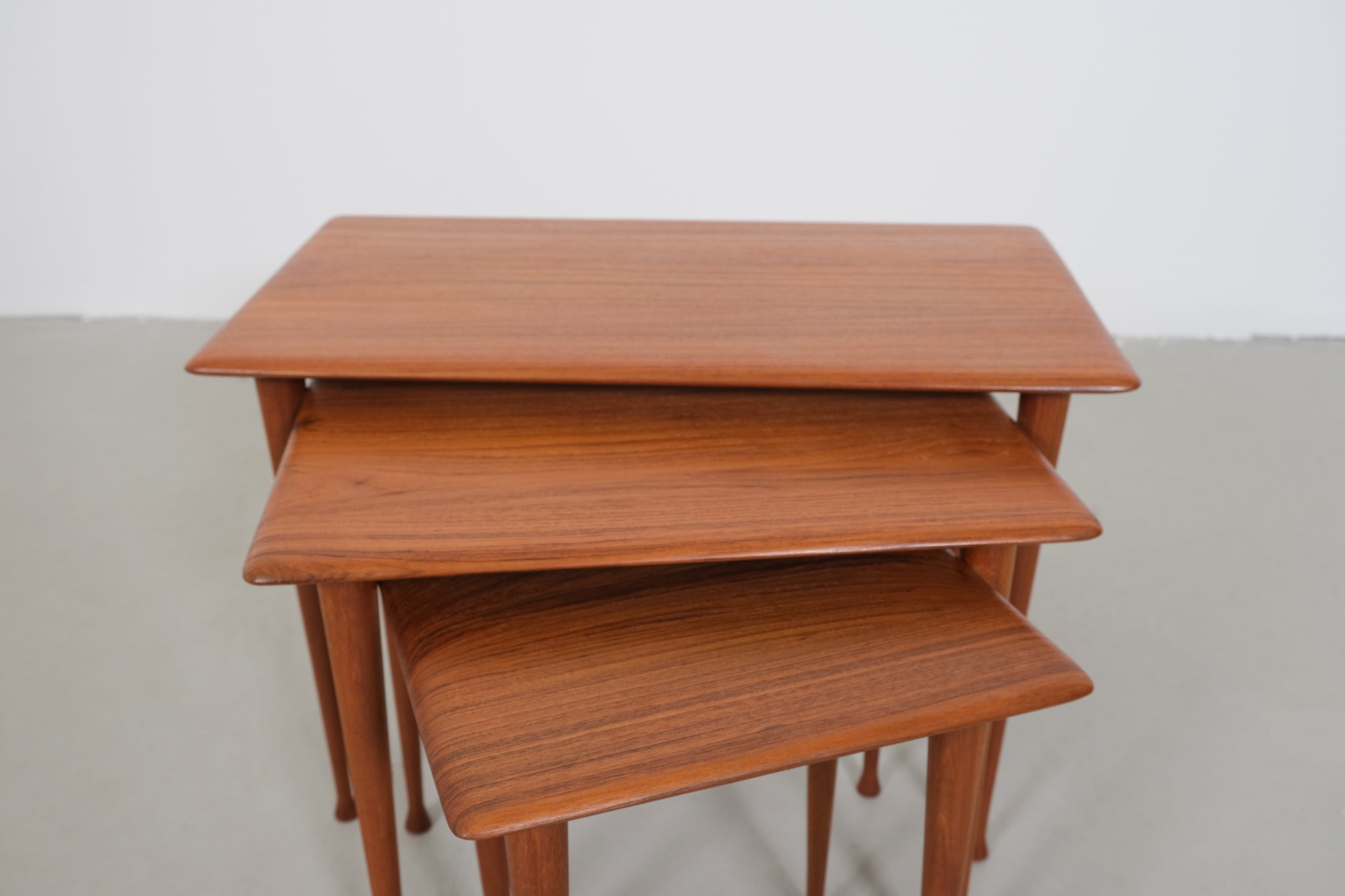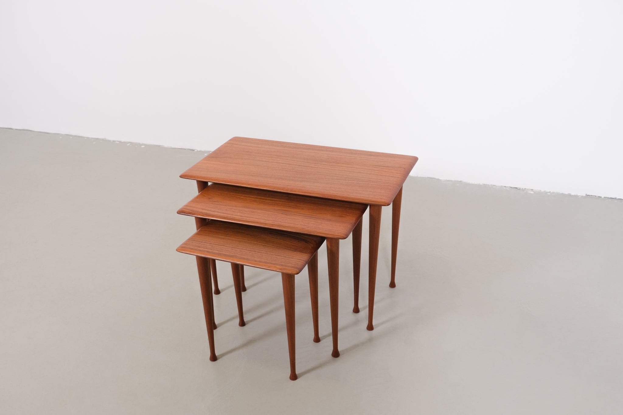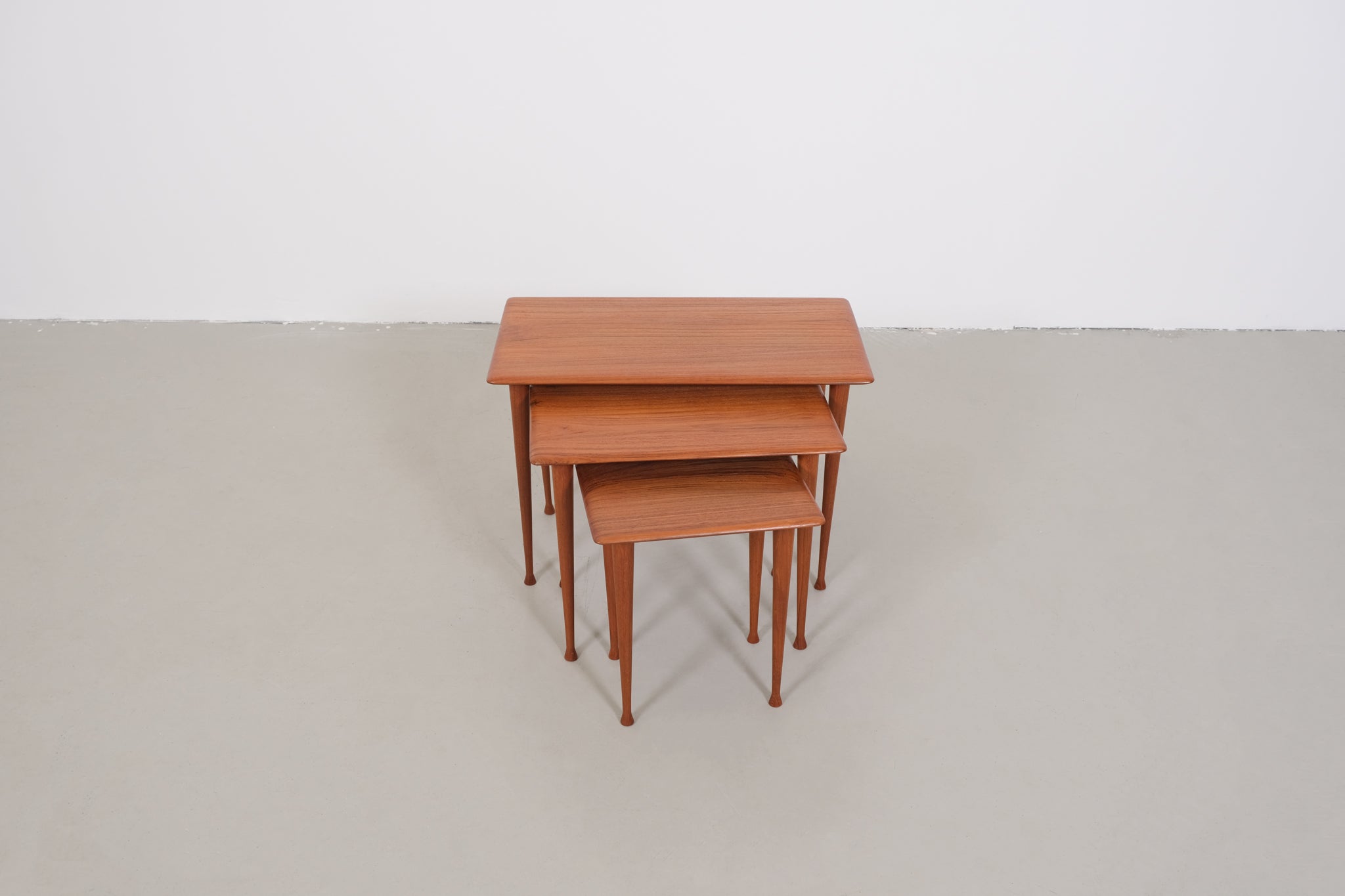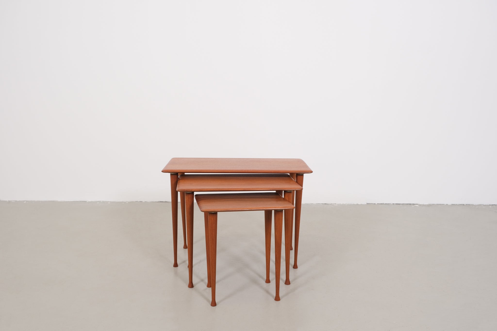 This elegant three-piece mimiset, crafted from high-quality teak wood, combines minimalist design with timeless Scandinavian charm. The set features three tables with subtly tapered legs that create a light, airy look while adding warmth to any interior.