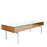 Een leuke salontafel uit de jaren 70 in Mid Century modern style. Deze strak vormgegeven tafel heeft verchroomde poten, een blad van teakfineer en een glasplaat van 1 cm dik. De tafel heeft gebruikssporen die passen bij zijn leeftijd en de dopjes onder het glas zijn vernieuwd.