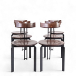Een mooi en tijdloos ontwerp van Martin Haksteen voor Harvink. De 'Zeta' heeft een zwart metalen frame met drie poten en een mooie roodbruine zitting en gebogen ruglening. Typisch jaren 80 design. De set van 6 stoelen is in goede vintage staat met bijbehorende gebruikssporen.