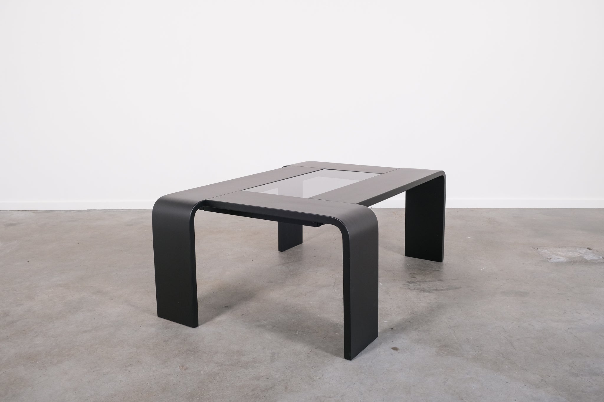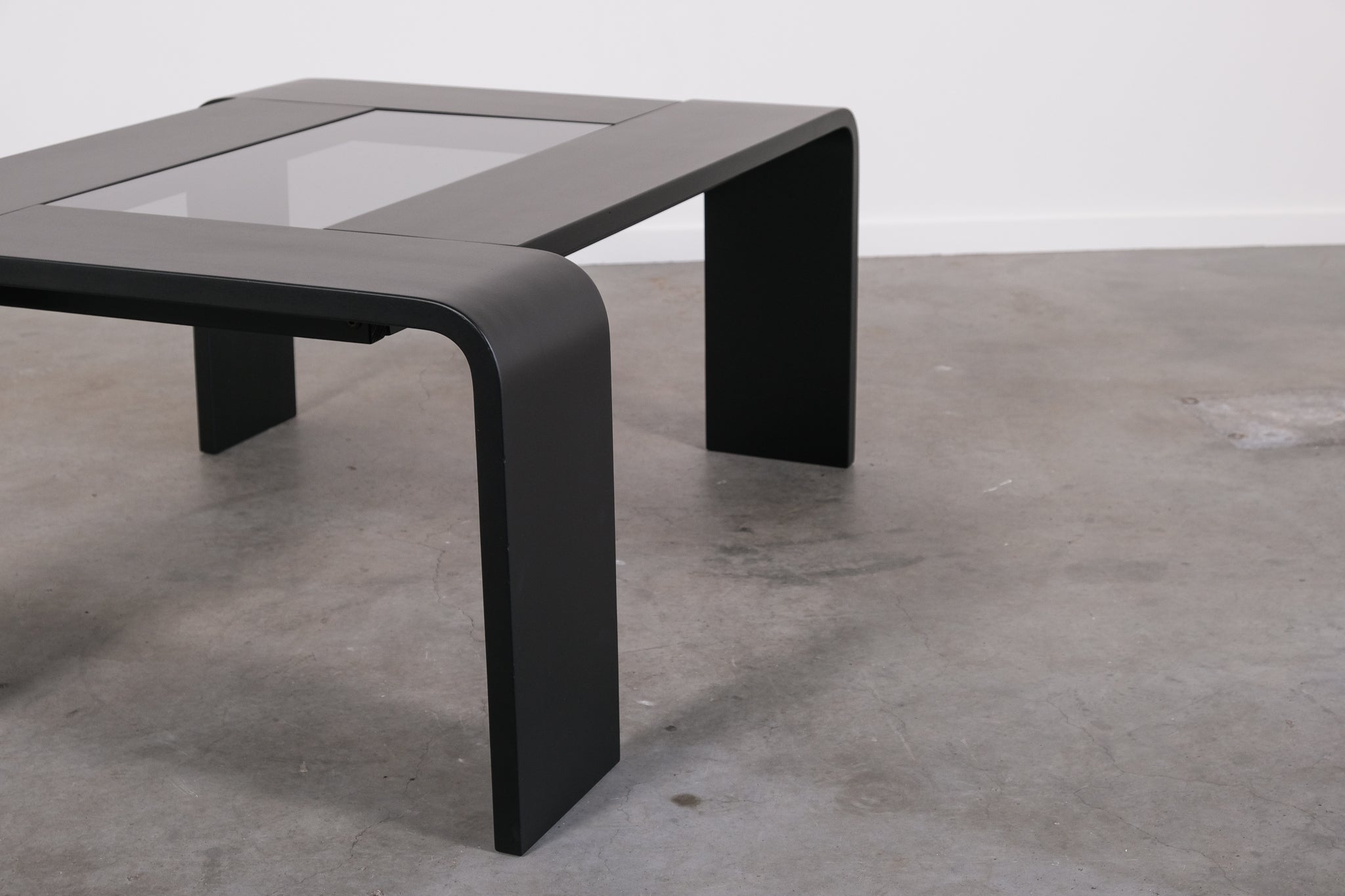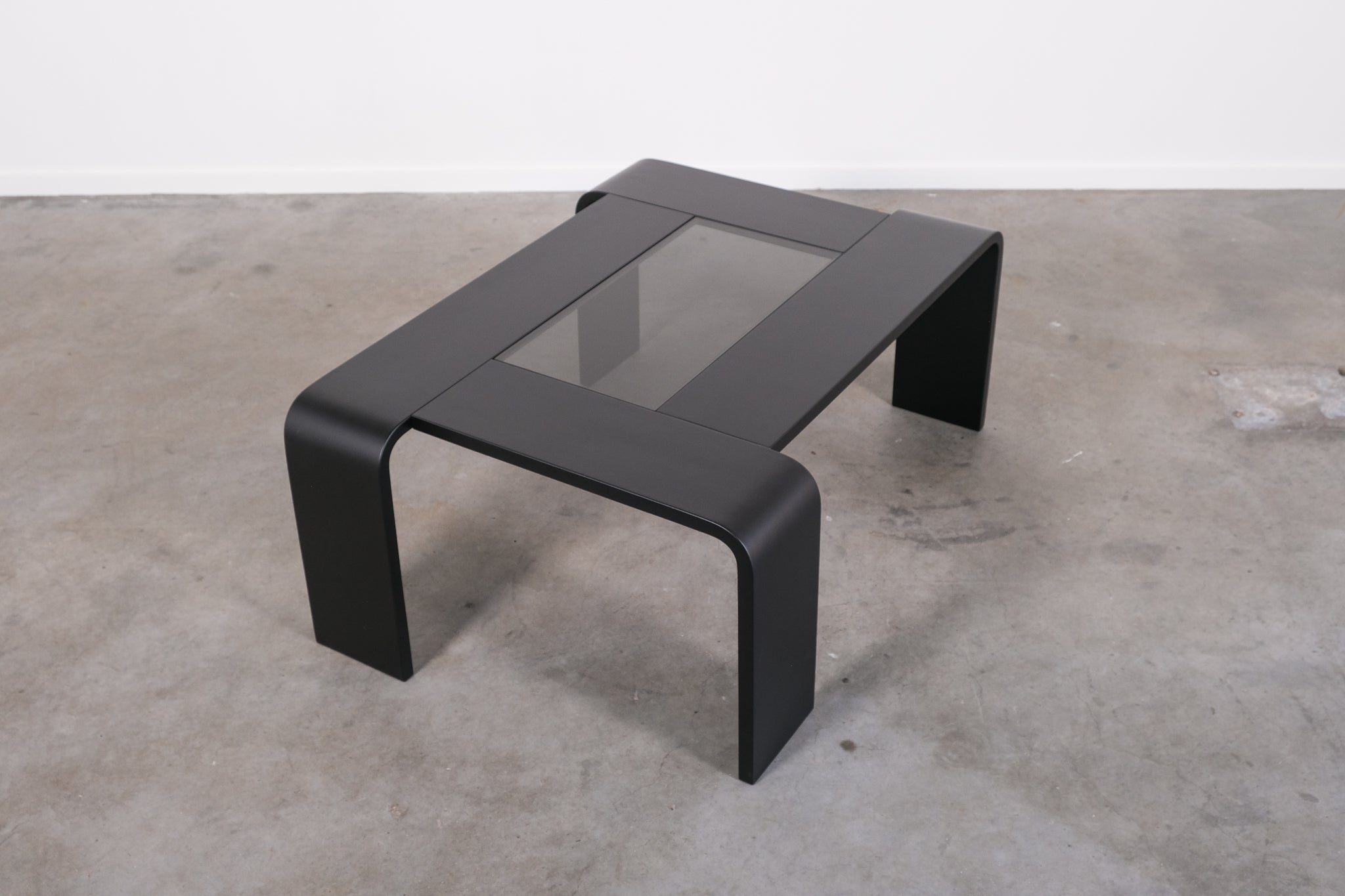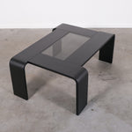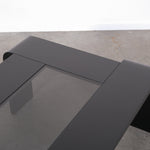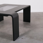Minimalist 1970s coffee table with a sleek, graphic silhouette. The curved legs flow seamlessly into the tabletop, which features an inset smoked glass panel.