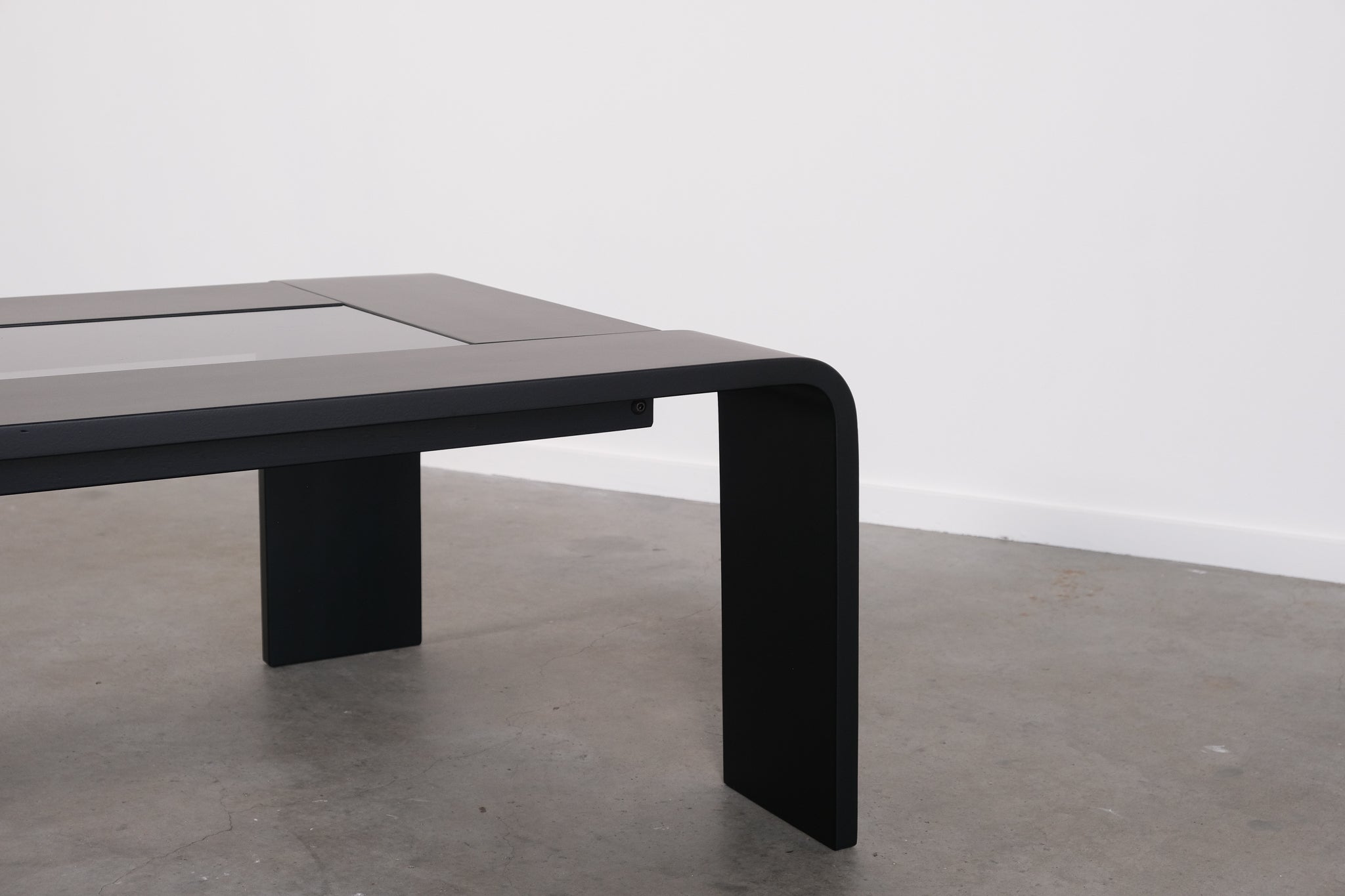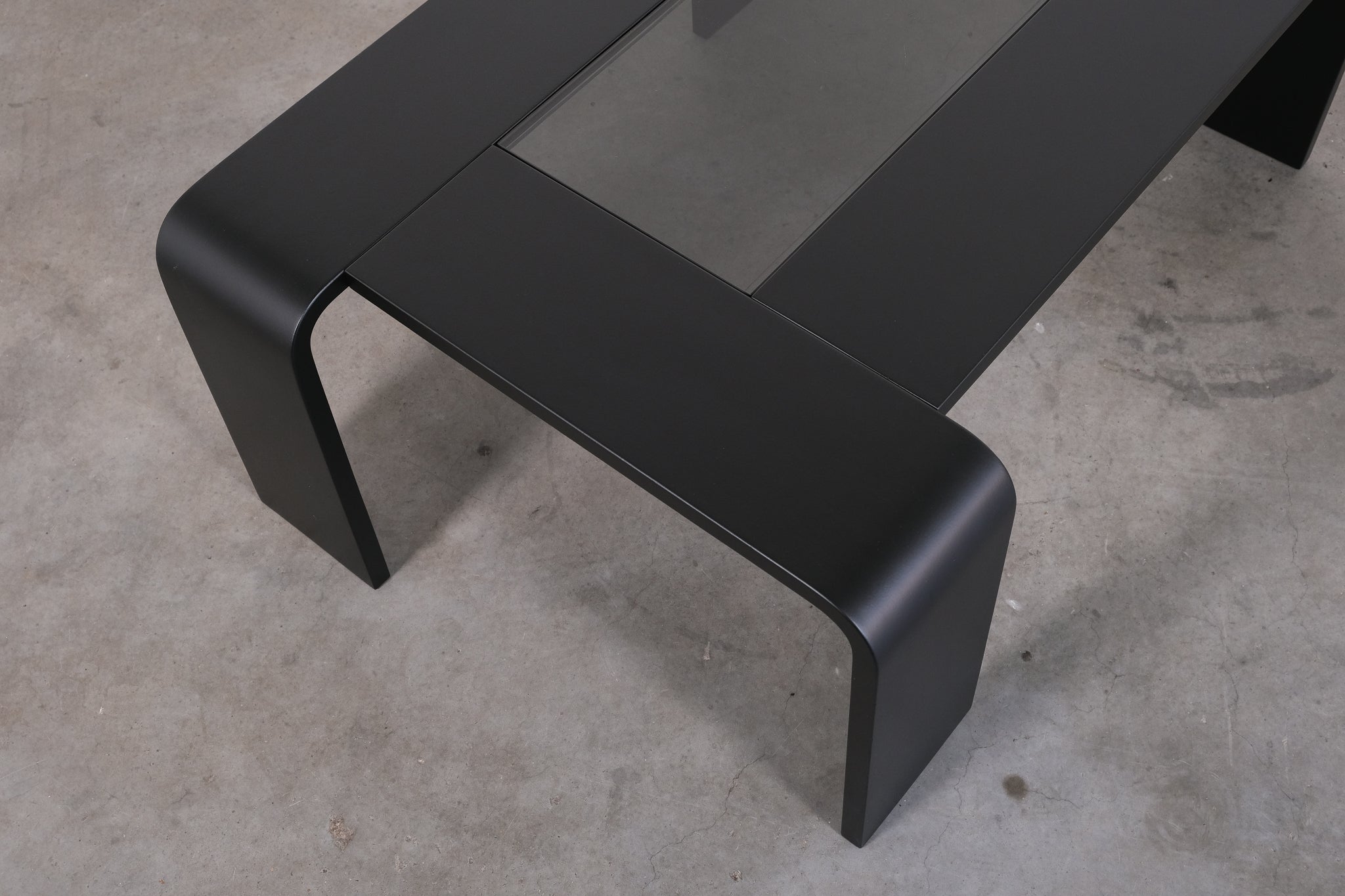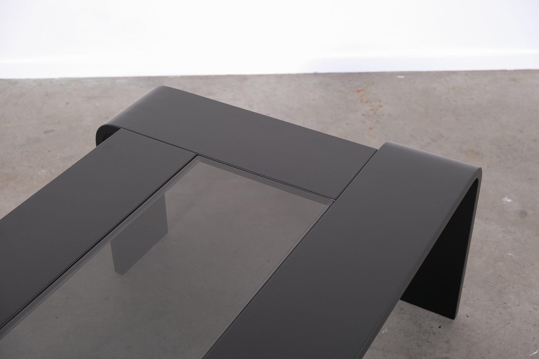 Minimalist 1970s coffee table with a sleek, graphic silhouette. The curved legs flow seamlessly into the tabletop, which features an inset smoked glass panel.