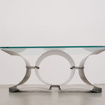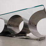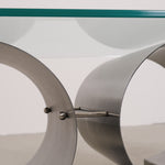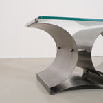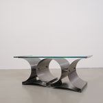 This coffee table, designed by François Monnet for Kappa in the 1970s, is a stunning example of modern design. The base is made of brushed stainless steel with a unique, flowing shape, providing not only stability but also a dynamic interplay of light and shadow.