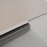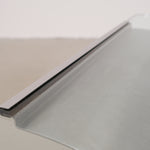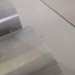 The tabletop is made of thick glass, which softens the bold look of the steel and gives the table a light, elegant appearance. Thanks to the combination of steel and glass, this table fits seamlessly into various interior styles, from modern to eclectic. The table has been fully polished and shows some scratches on the glass, along with a visible glue edge along the rim.