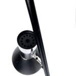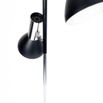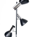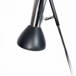This elegant tall floor lamp features chrome-plated spotlights with matte black shades. The base plate is a heavy metal disc, ensuring stability. The lamp is in very good vintage condition with minor signs of use. The spotlights can be individually switched on and off using the foot switch.