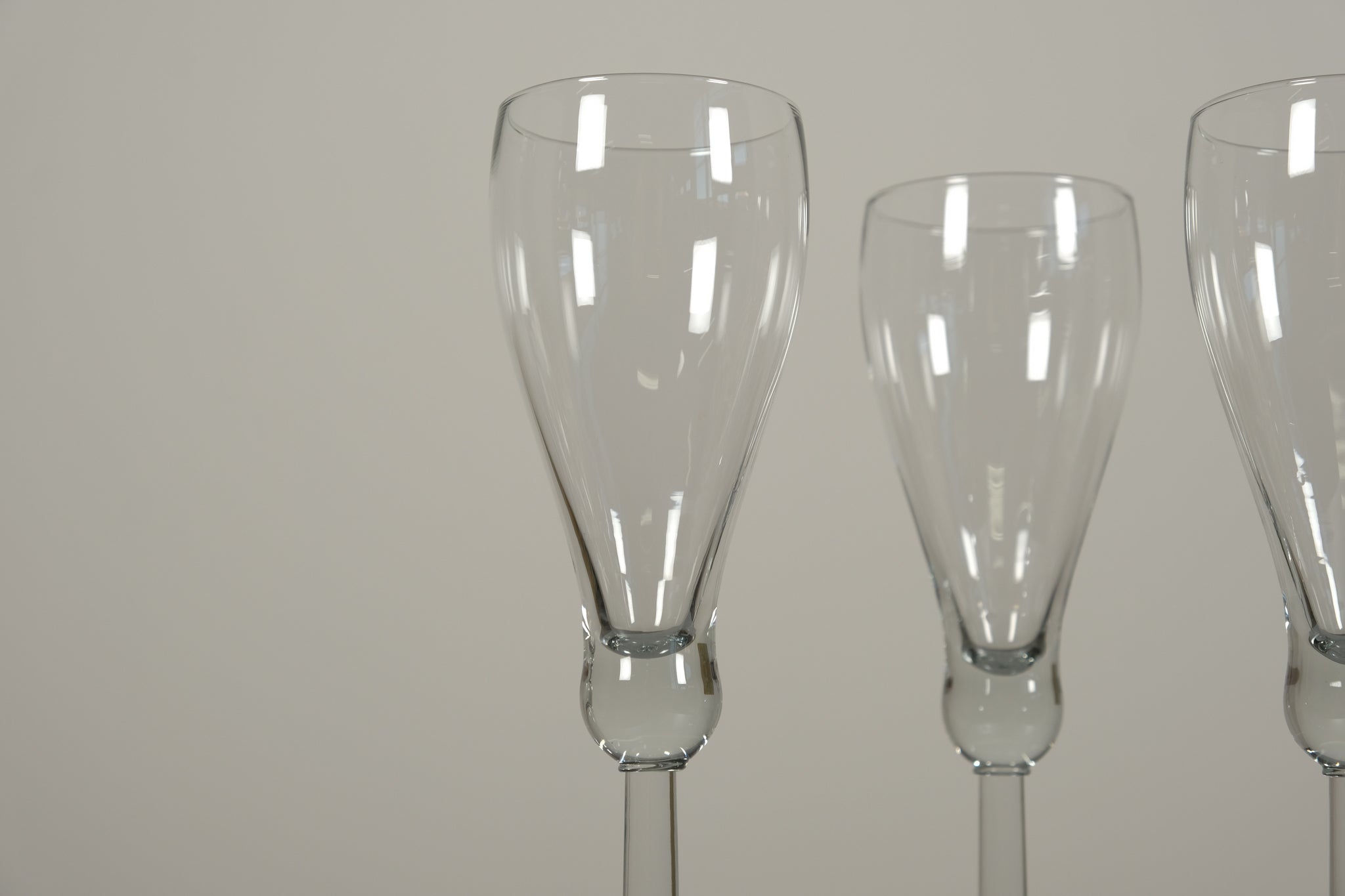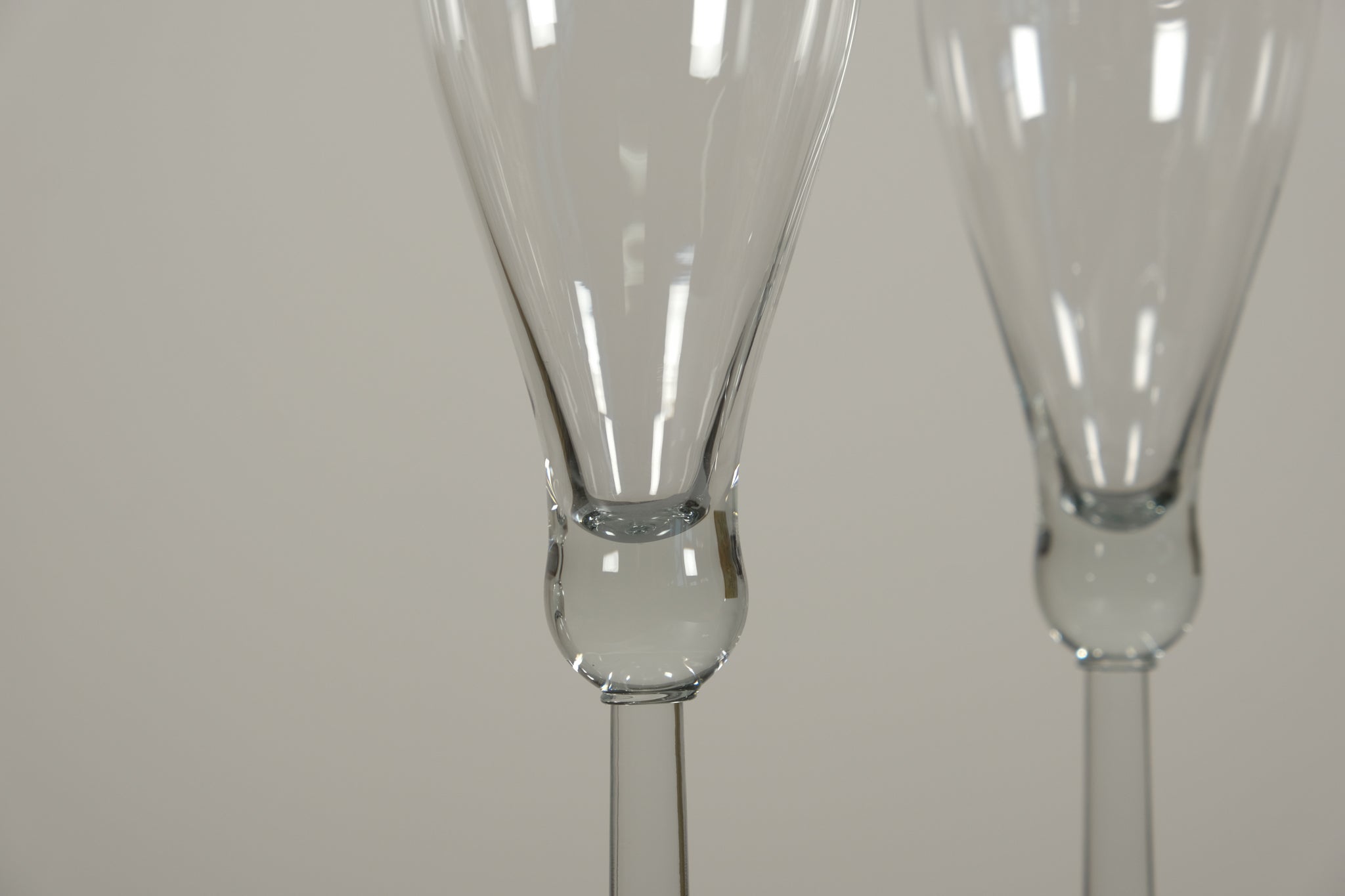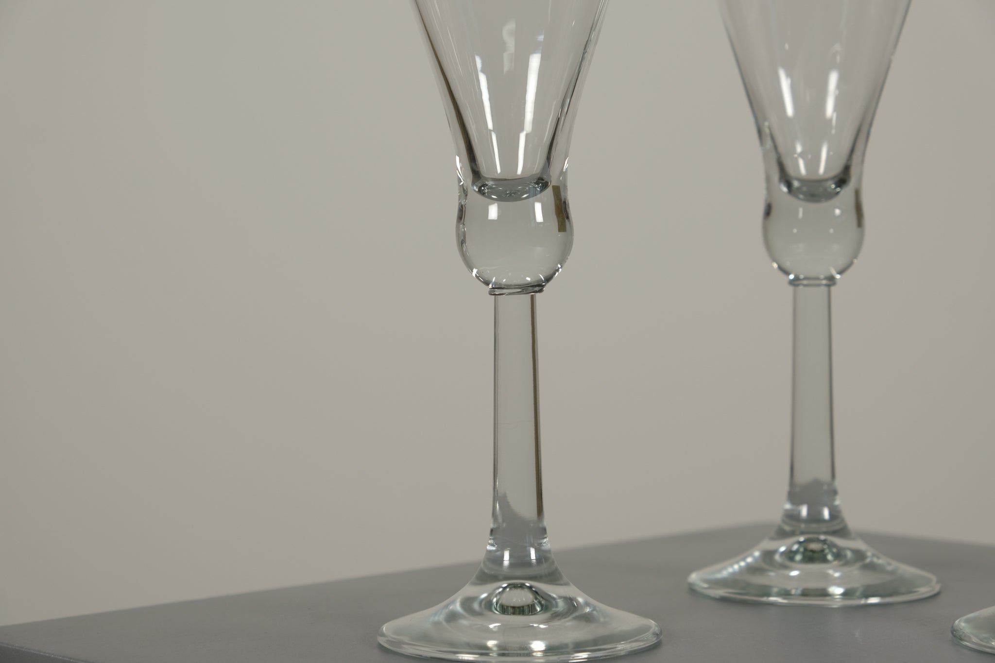 A set of six modern champagne flutes with a distinctive thick, narrow base. Clear and elegant, their minimalist design is perfect for celebrating special occasions or adding a contemporary touch to your table. Excellent condition, no chips or cracks.
