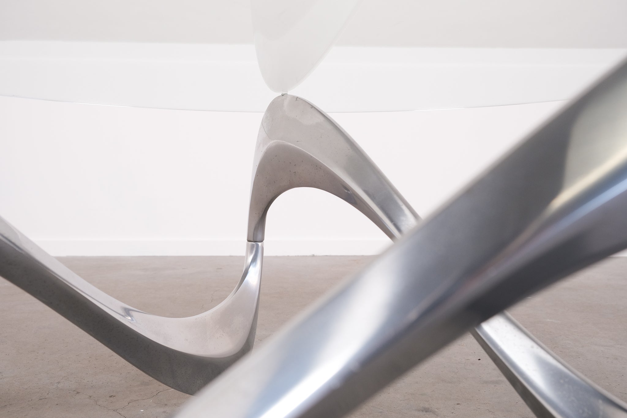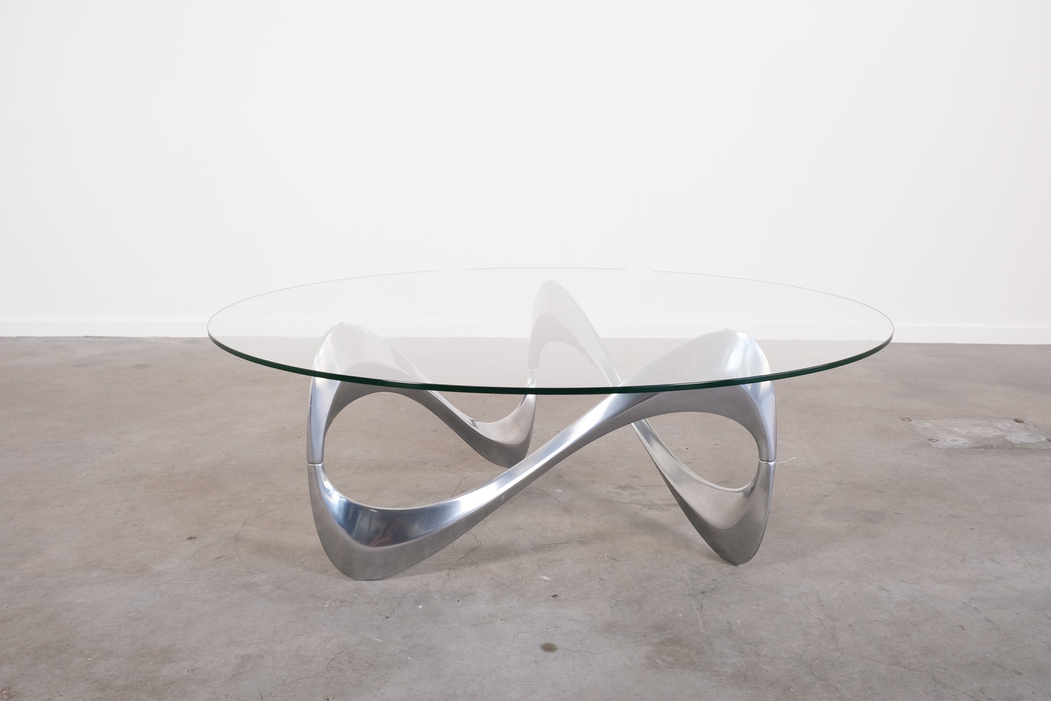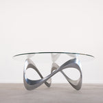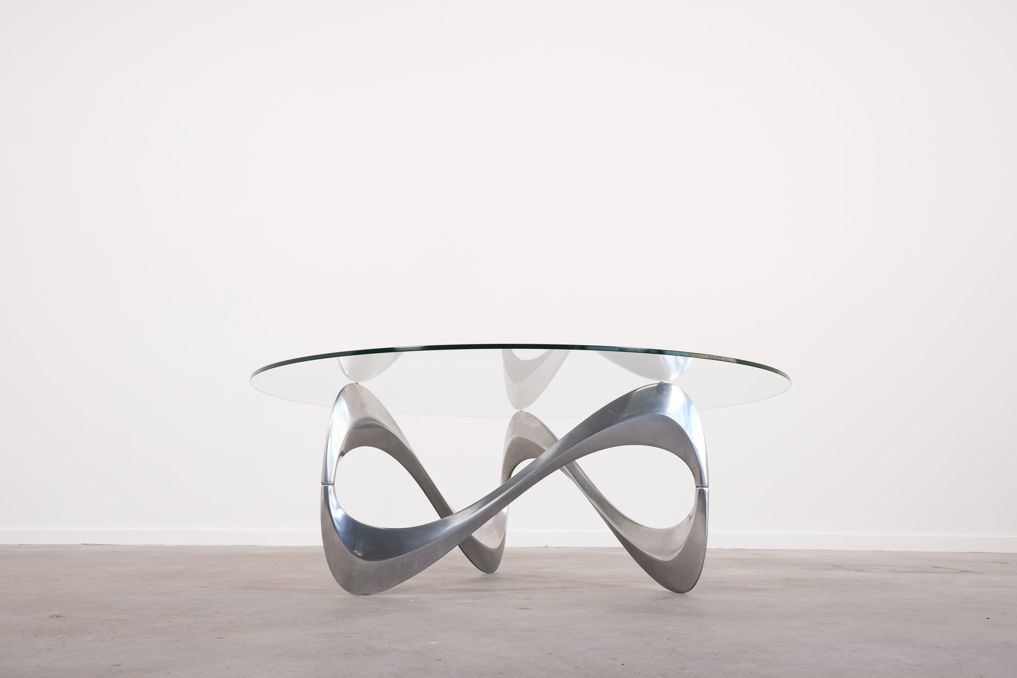 The Snake coffee table by Knut Hesterberg is a celebrated mid-century design classic. Its sculptural aluminum base twists fluidly to form a continuous loop, balanced by a round glass top. Minimalist but striking, this piece showcases the creativity and refined aesthetics of mid-century modern design.